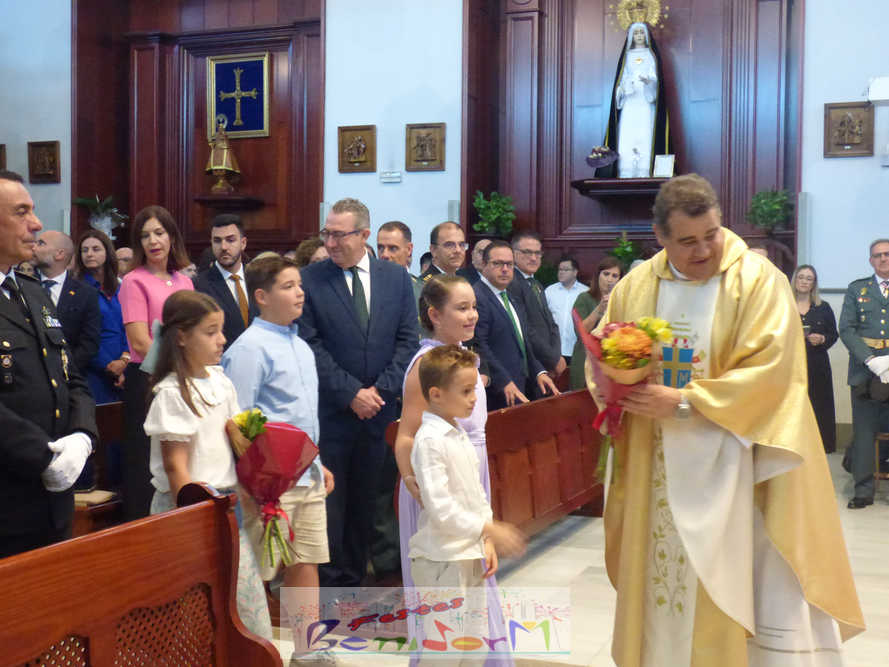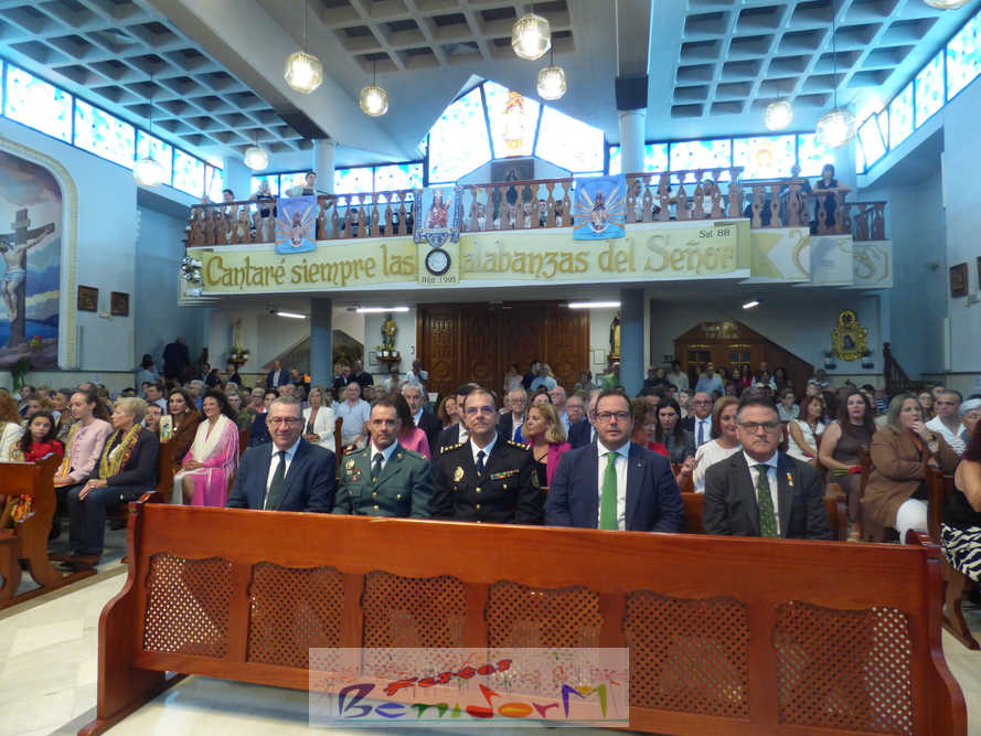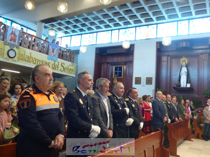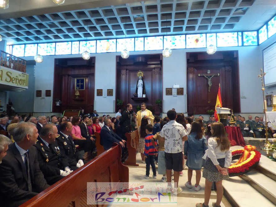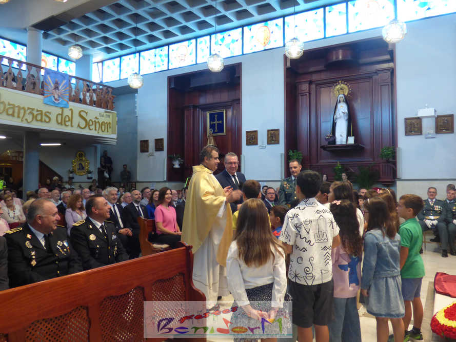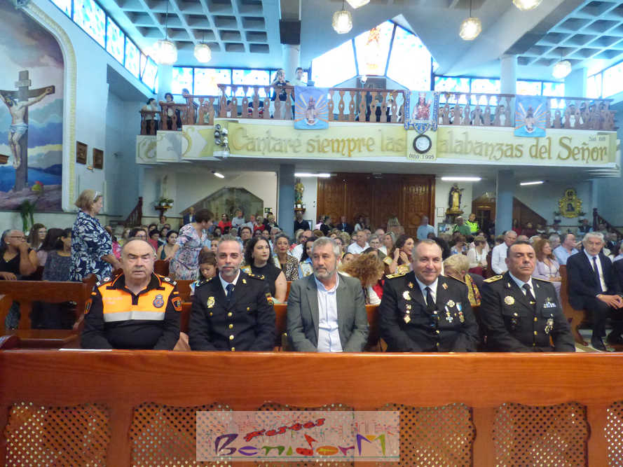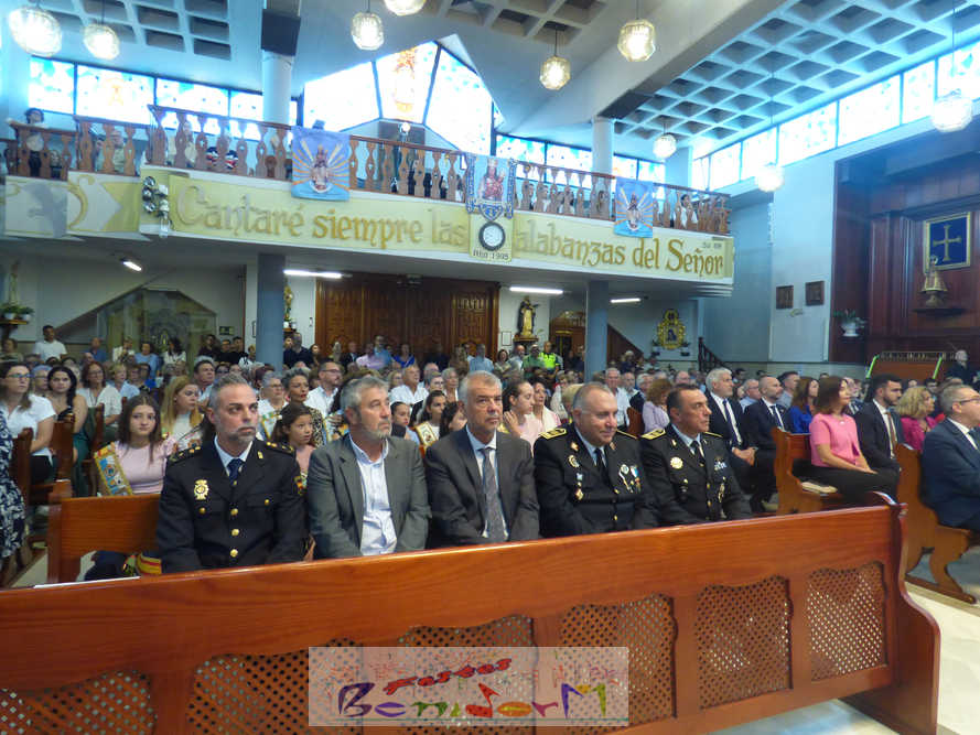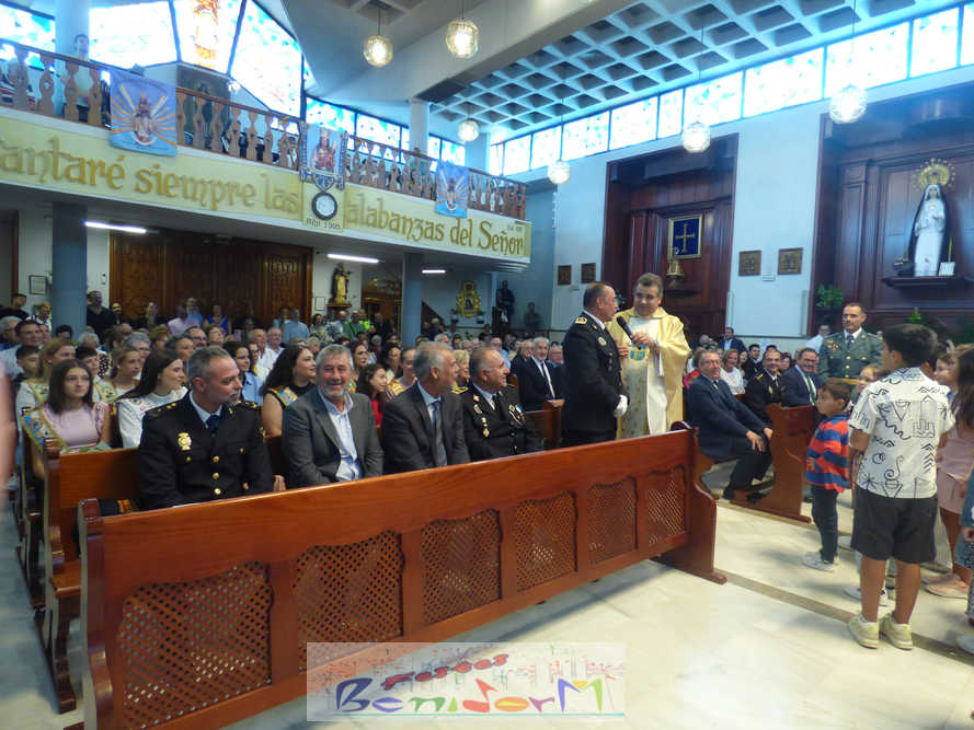El alcalde de la ciudad, Toni Pérez, y el concejal de Seguridad Ciudadana, Jesús Carrobles, han acompañado a los agentes del Destacamento de Tráfico de Benidorm y a sus familias en una misa que se ha desarrollado al mediodía en la iglesia de Nuestra Señora de la Almudena, y en la que también han participado otros miembros de la Corporación local, entre ellos el también diputado autonómico José Ramón González de Zárate. También han asistido el senador Agustín Almodóbar; miembros de otros Cuerpos y Fuerzas de Seguridad, como el comisario de la Policía Nacional, Luis Manuel Sánchez, o el intendente de la Policía Local, Luis Martín Arévalo; así como el nuevo jefe local del Protección Civil, José Vicente Fuster.