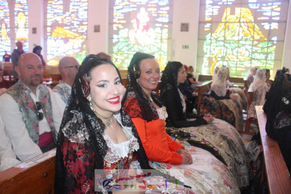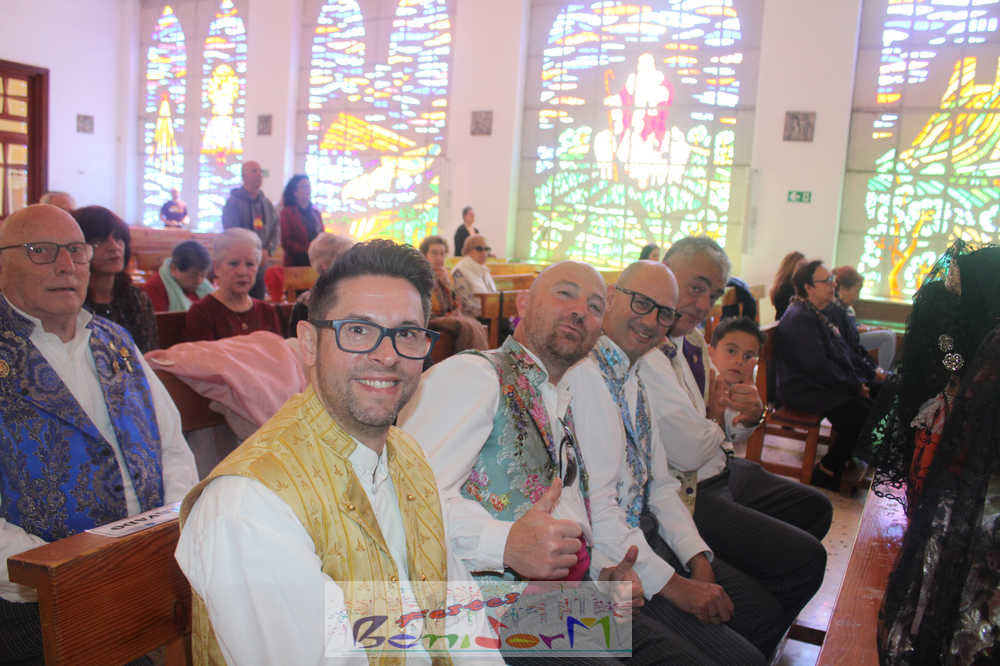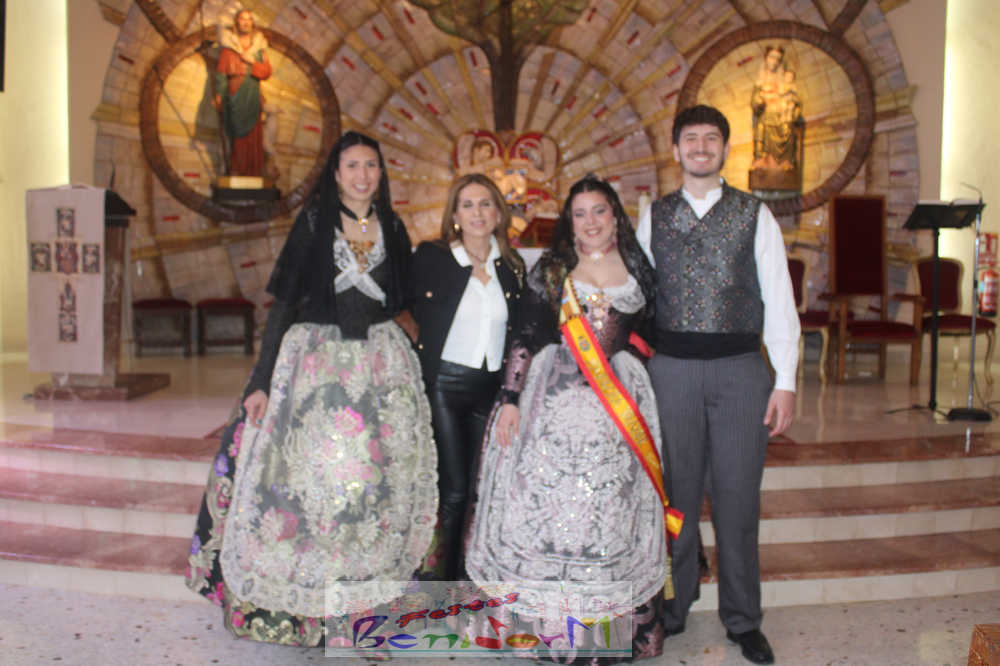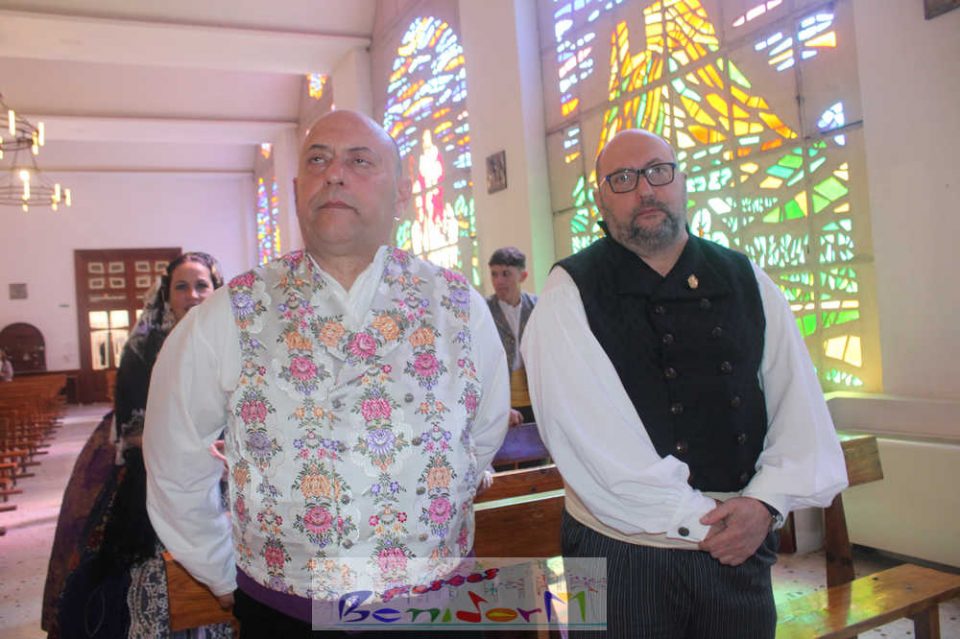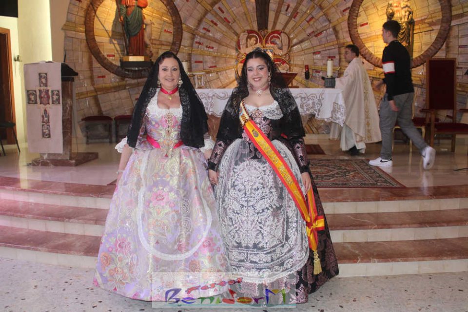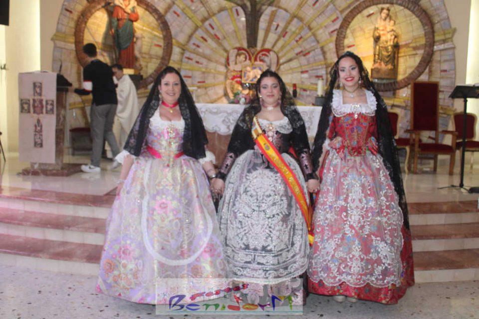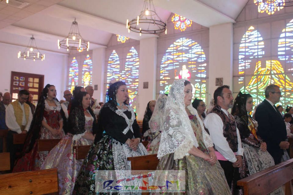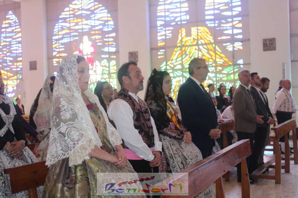 La mañana comenzó con las misas en honor al patrón, cada una en su respectiva parroquia. A las 12:00 horas, la Falla Els Tolls asistió a la eucaristía en la parroquia del Buen Pastor, mientras que la Falla Benidorm Distrito Centro celebró su misa a las 12:45 en la parroquia de San Jaime y Santa Ana. Poco después, a las 13:00 horas, la Falla Rincón rindió homenaje a San José en la parroquia de Nuestra Señora del Mar.