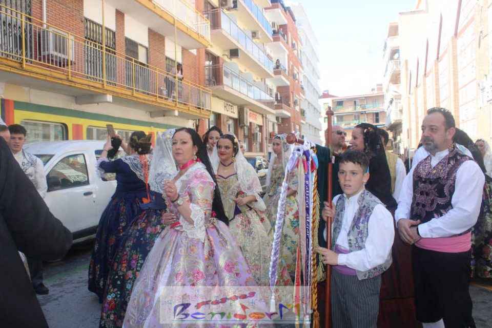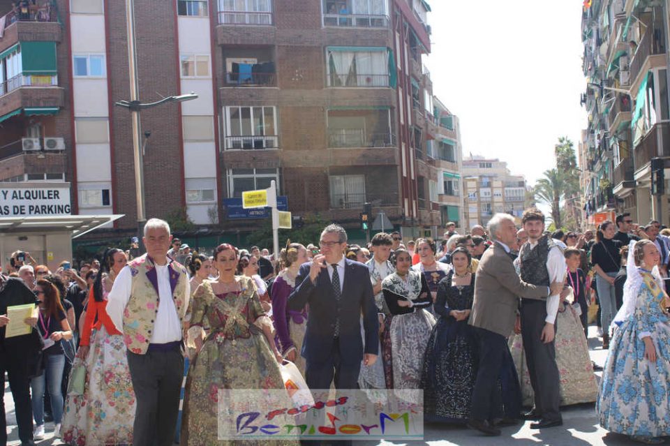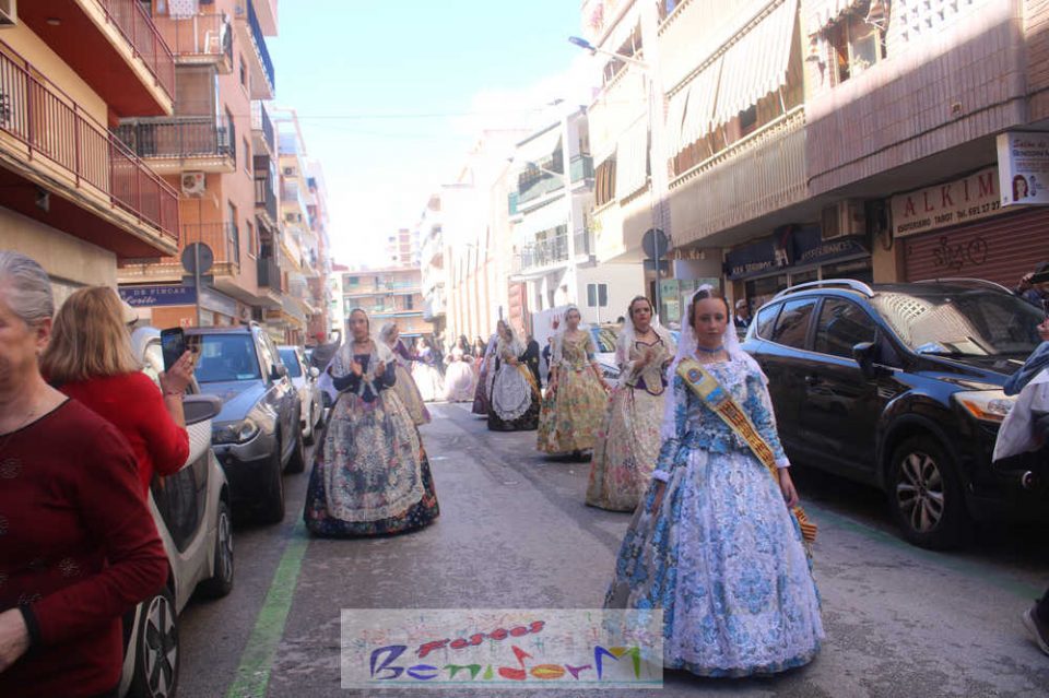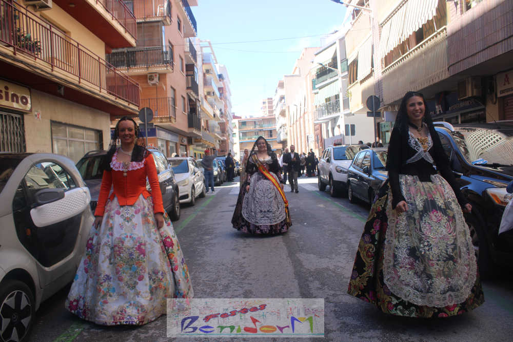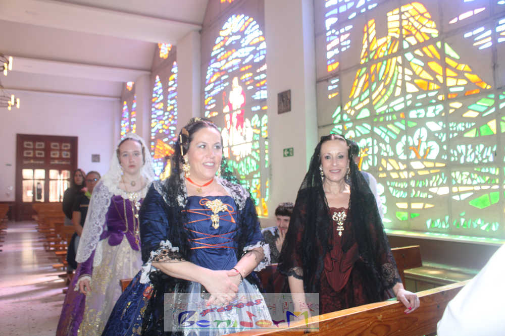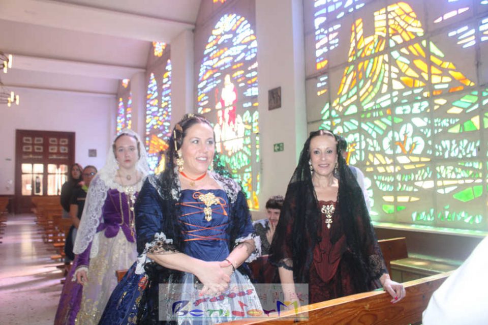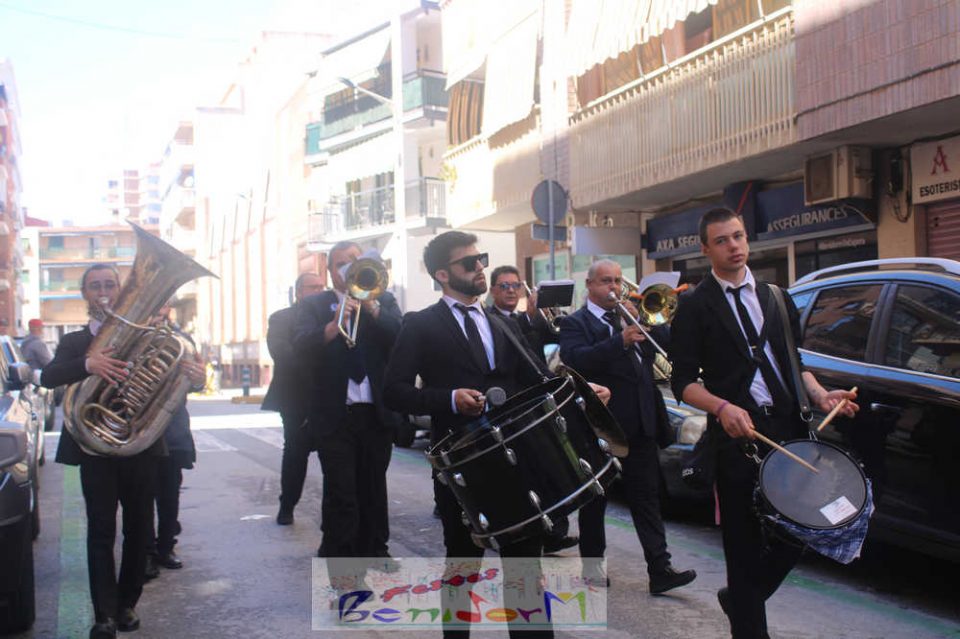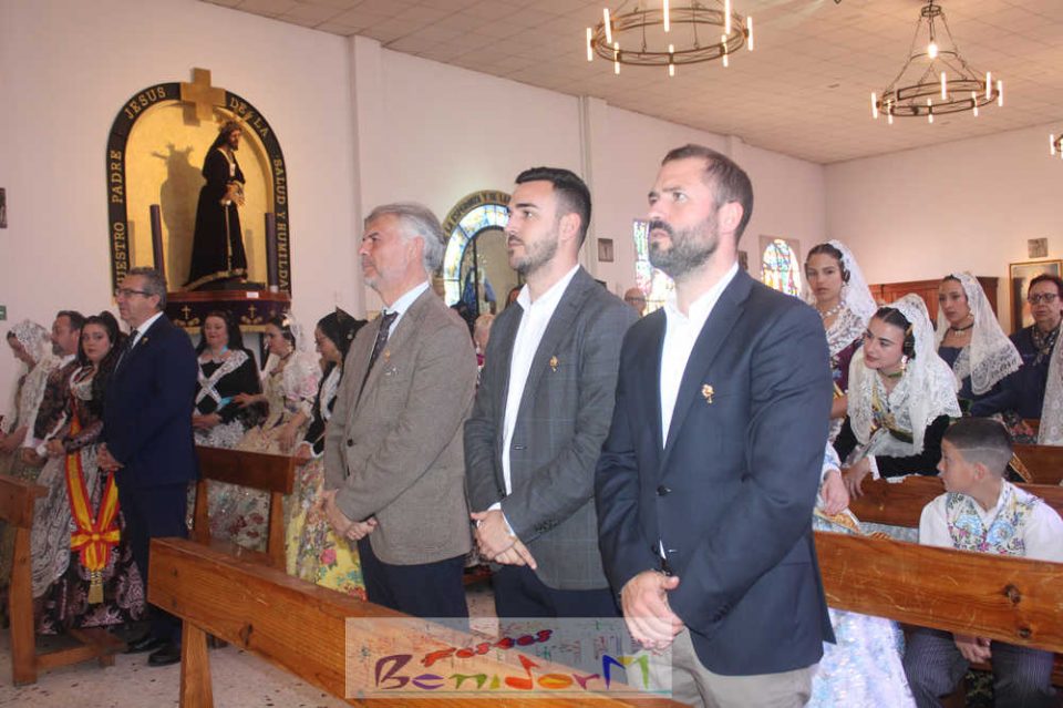 La mañana comenzó con las misas en honor al patrón, cada una en su respectiva parroquia. A las 12:00 horas, la Falla Els Tolls asistió a la eucaristía en la parroquia del Buen Pastor, mientras que la Falla Benidorm Distrito Centro celebró su misa a las 12:45 en la parroquia de San Jaime y Santa Ana. Poco después, a las 13:00 horas, la Falla Rincón rindió homenaje a San José en la parroquia de Nuestra Señora del Mar.