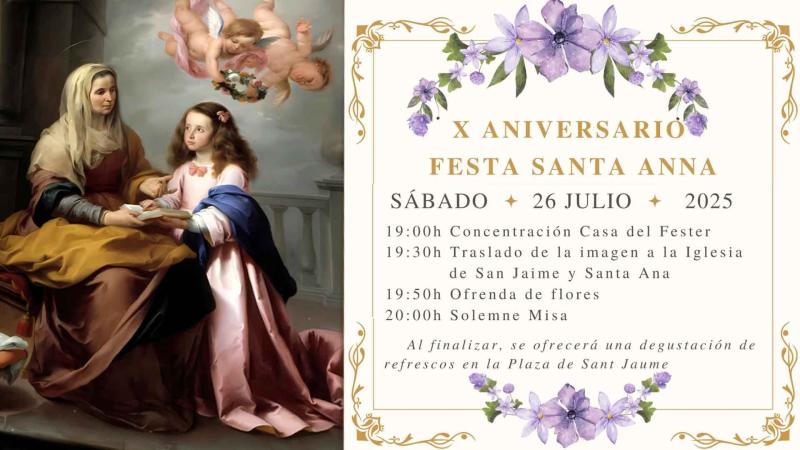 Los actos darán comienzo a las siete de la tarde, en la Casa del Fester Diego Cano Enguera, donde se concentrarán fieles y autoridades para, a continuación, trasladar la imagen de la santa a la iglesia de Sant Jaume i Santa Anna. Allí, a las siete y media, tendrá lugar una ofenda de flores y, a las ocho, una misa solemne. Al finalizar, se ofrecerá a todos los asistentes un refrigerio en la plaza de Sant Jaume.