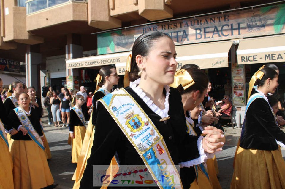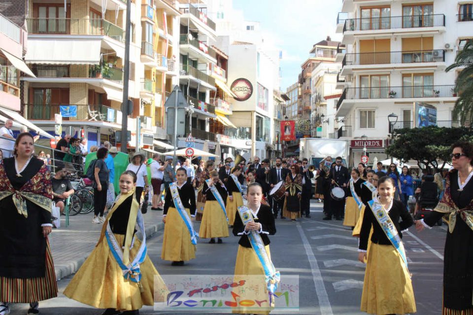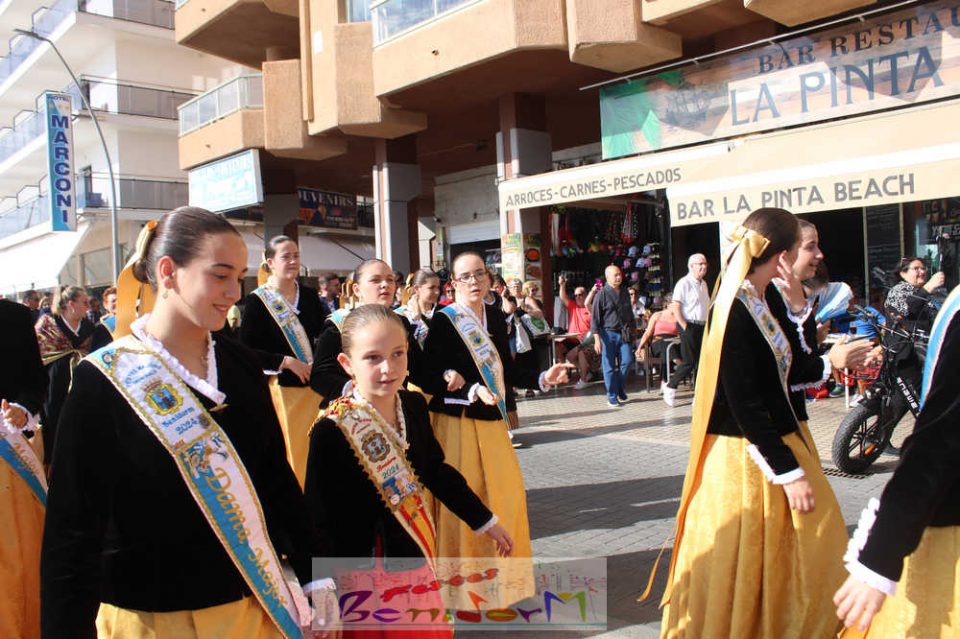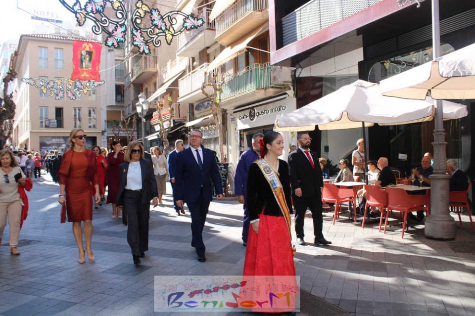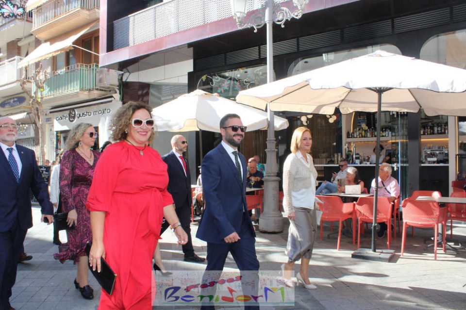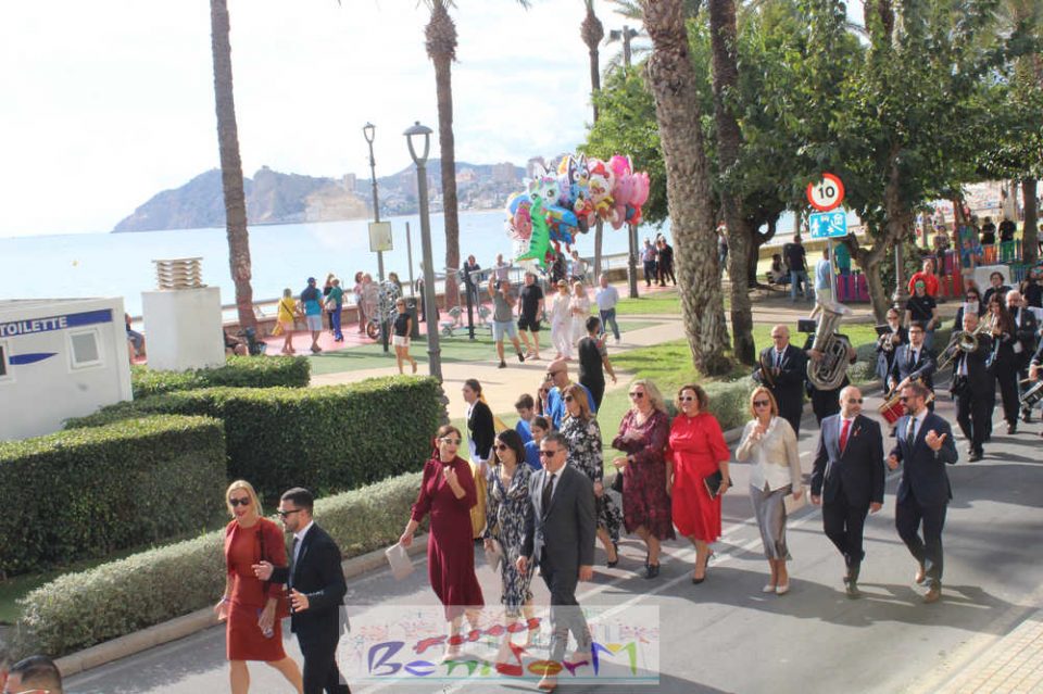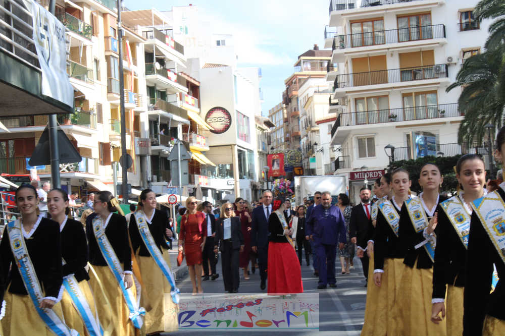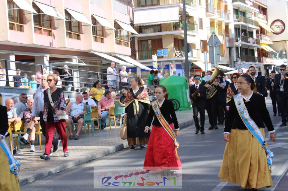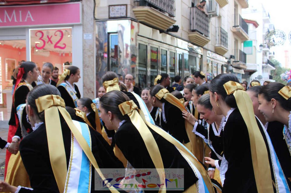 Con posterioridad, mayorales y autoridades han recogido a las reinas mayores, Valentina Alomodóbar y Laia Zamora para recorrer, en pasacalle, acompañados por las tres bandas de Benidorm, Unión, La Nova y l’Illa, la distancia que separa el Ayuntamiento de la Iglesia en la Plaza de Sant Jaume donde, a las 11.30, ha tenido lugar la misa en honor del patrón.