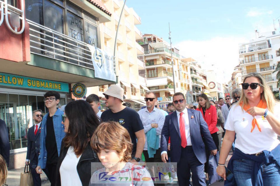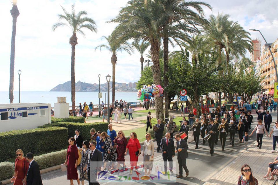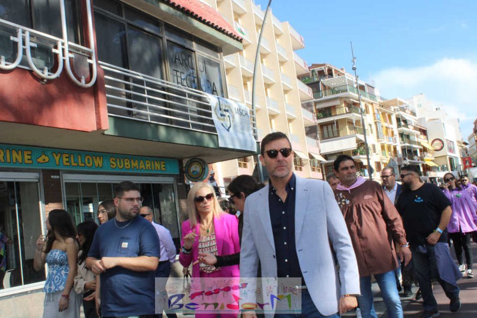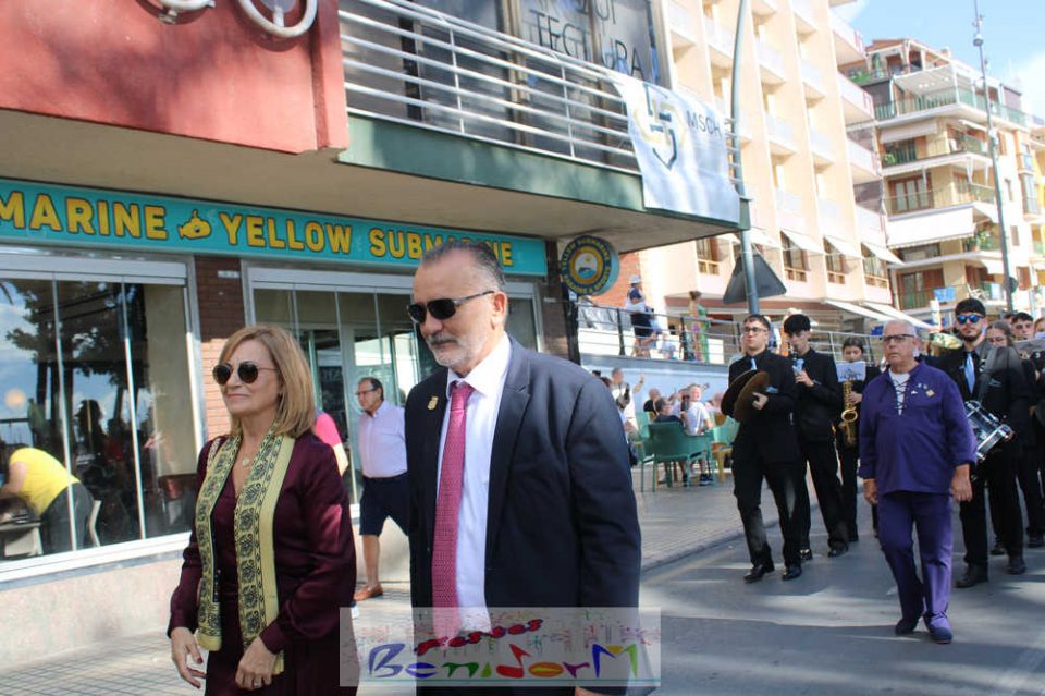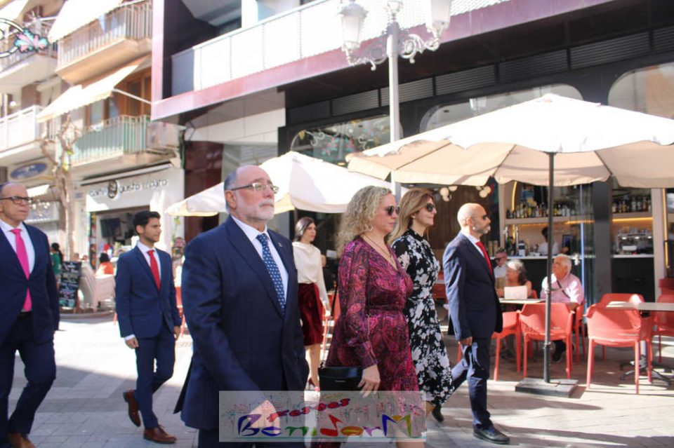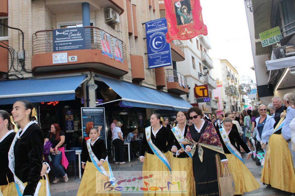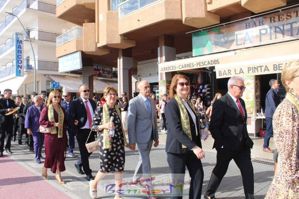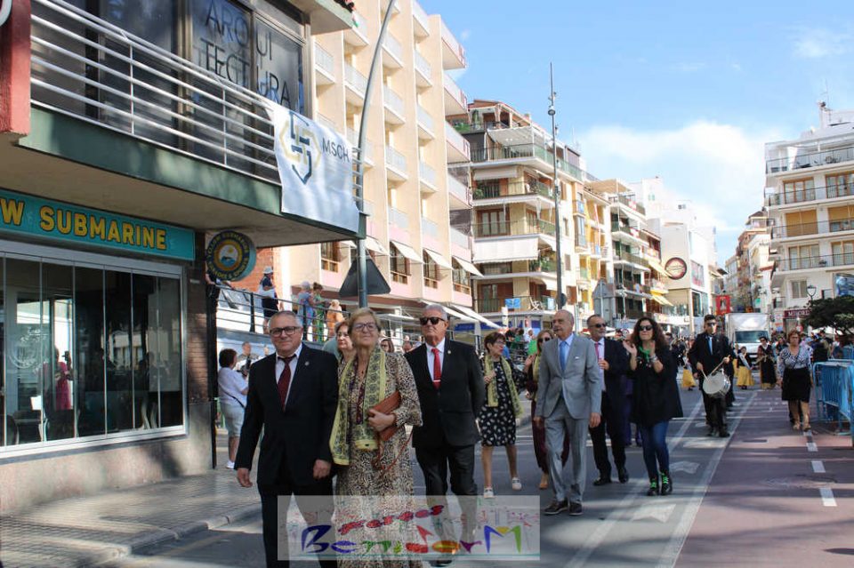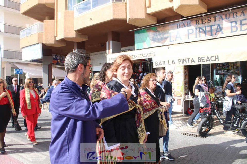 Con posterioridad, mayorales y autoridades han recogido a las reinas mayores, Valentina Alomodóbar y Laia Zamora para recorrer, en pasacalle, acompañados por las tres bandas de Benidorm, Unión, La Nova y l’Illa, la distancia que separa el Ayuntamiento de la Iglesia en la Plaza de Sant Jaume donde, a las 11.30, ha tenido lugar la misa en honor del patrón.
