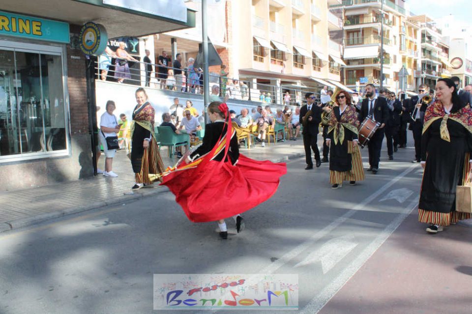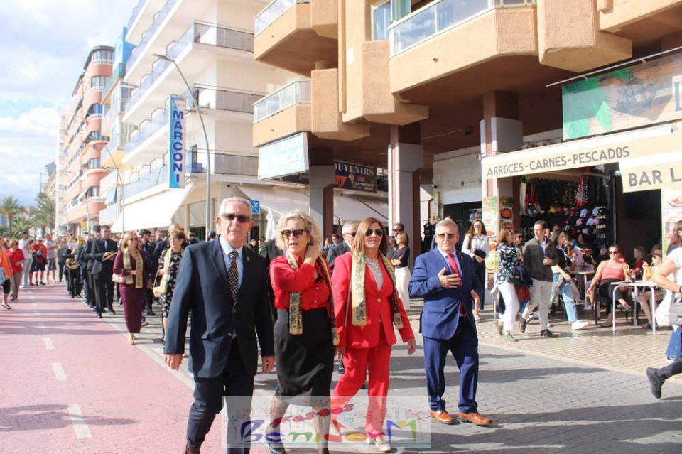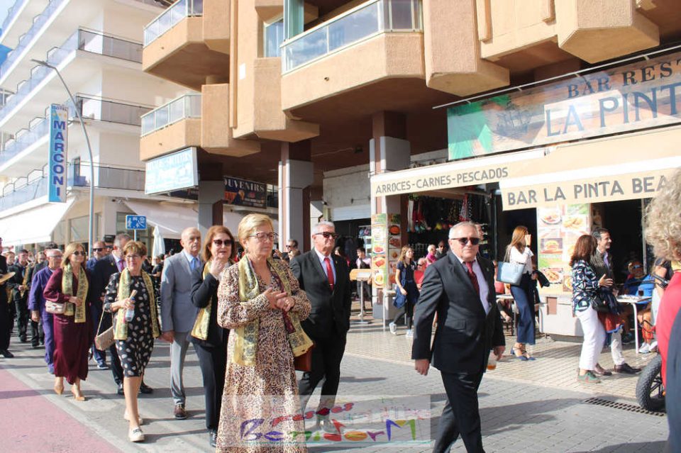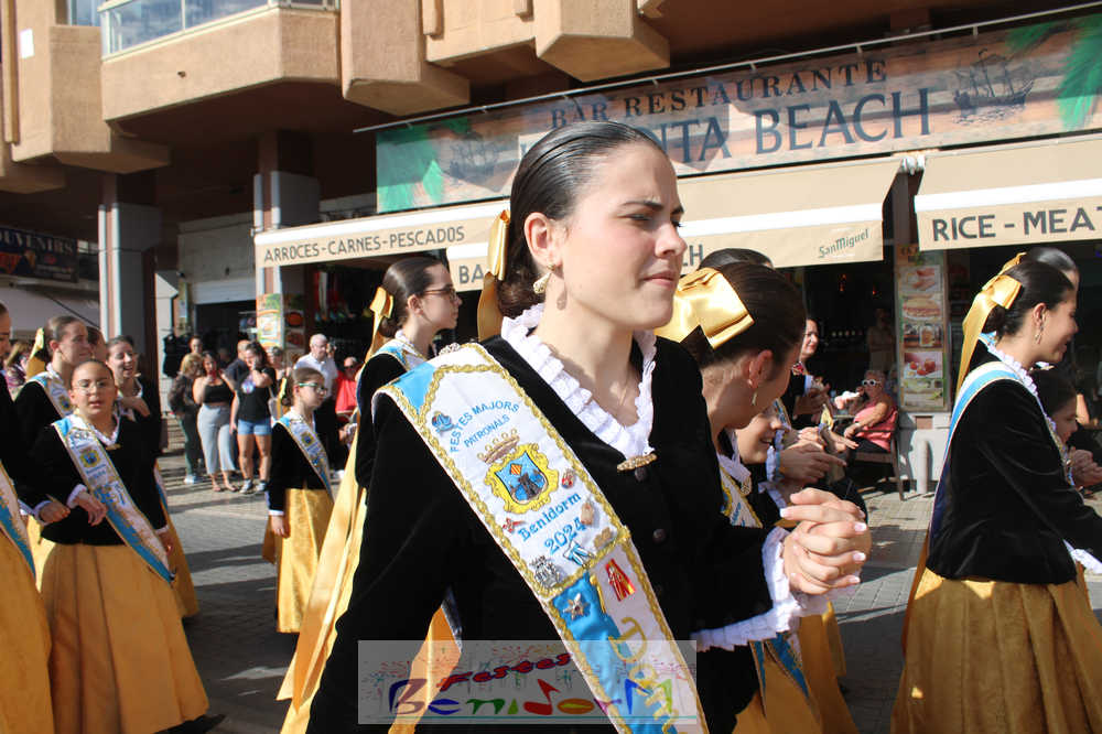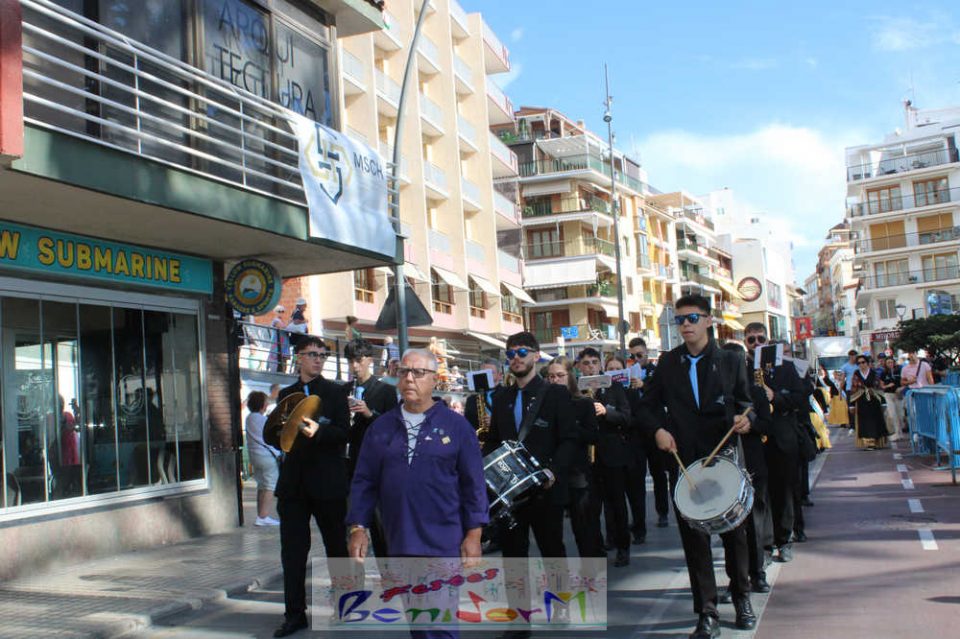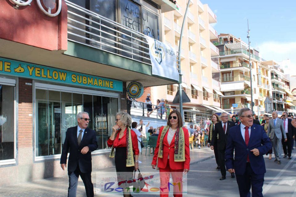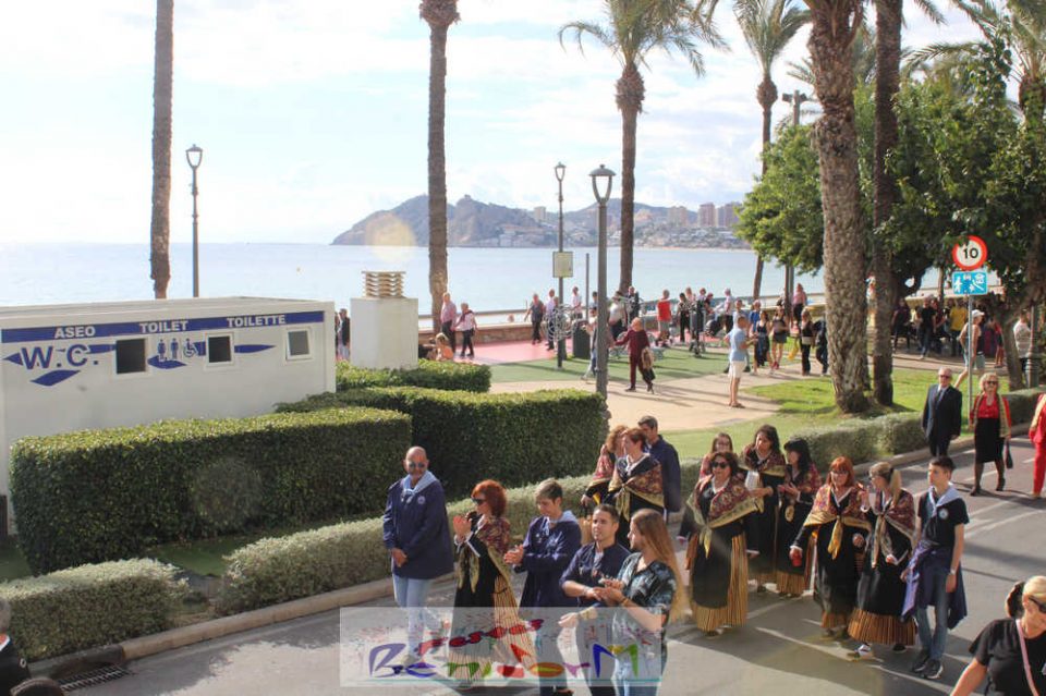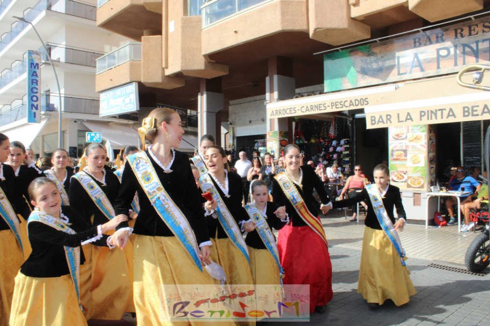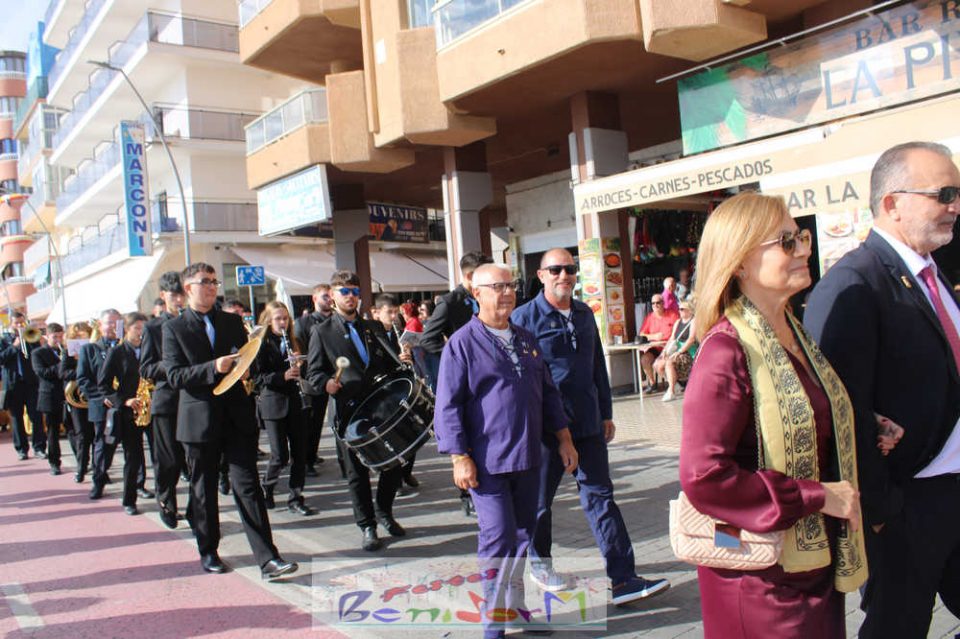 Con posterioridad, mayorales y autoridades han recogido a las reinas mayores, Valentina Alomodóbar y Laia Zamora para recorrer, en pasacalle, acompañados por las tres bandas de Benidorm, Unión, La Nova y l’Illa, la distancia que separa el Ayuntamiento de la Iglesia en la Plaza de Sant Jaume donde, a las 11.30, ha tenido lugar la misa en honor del patrón.