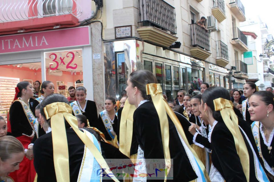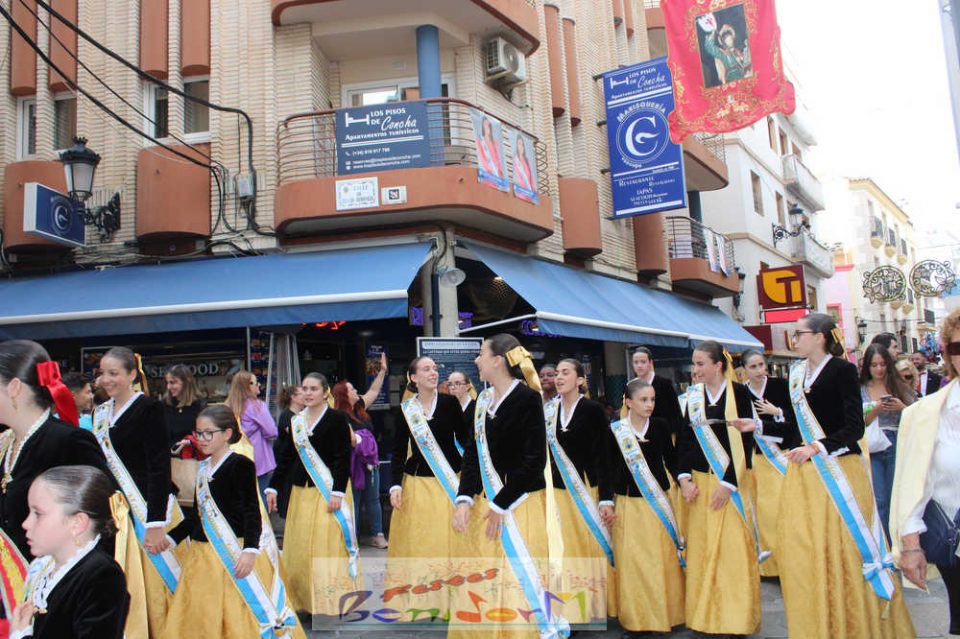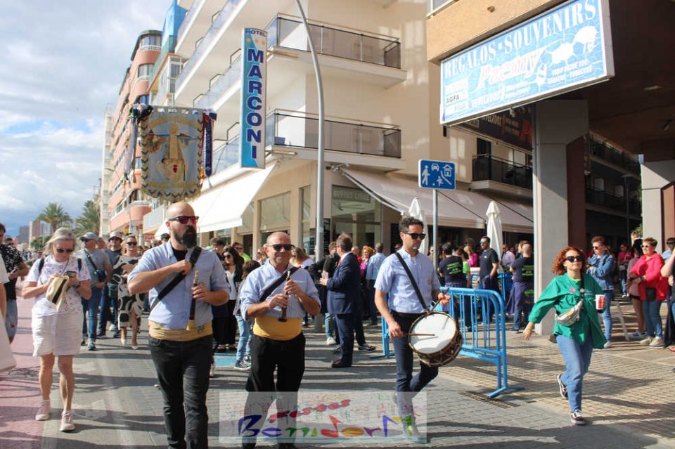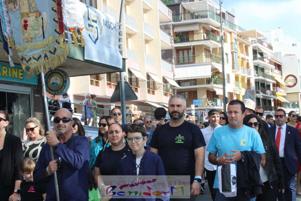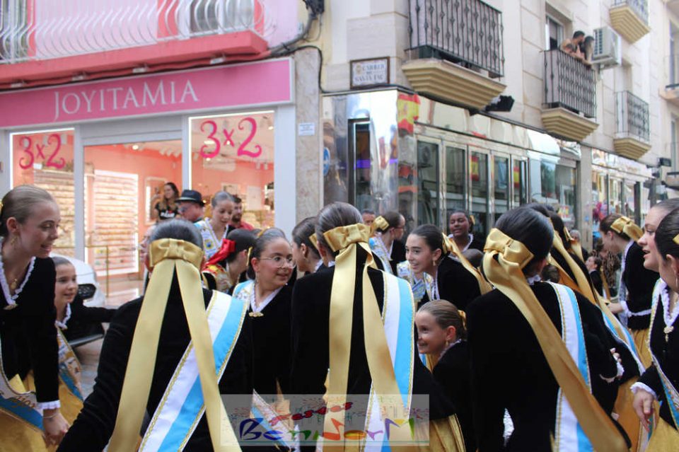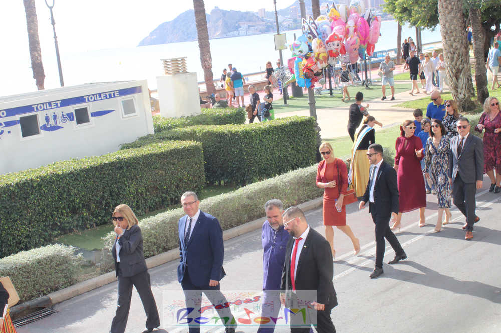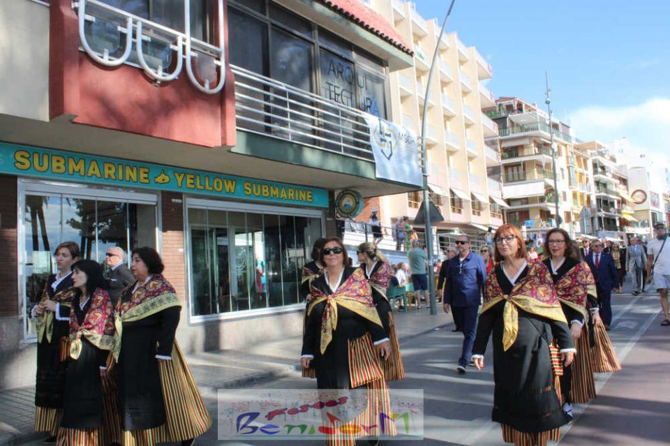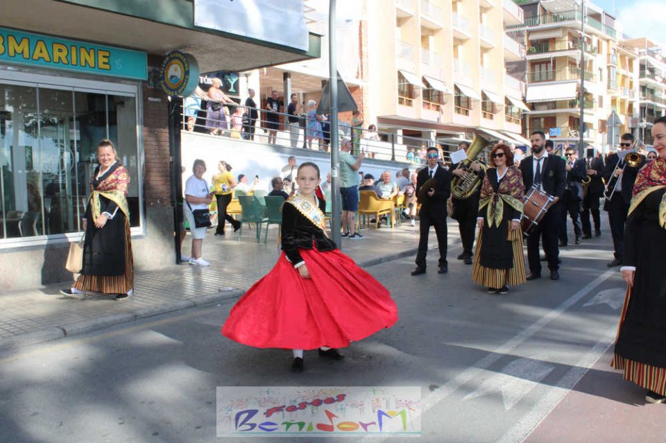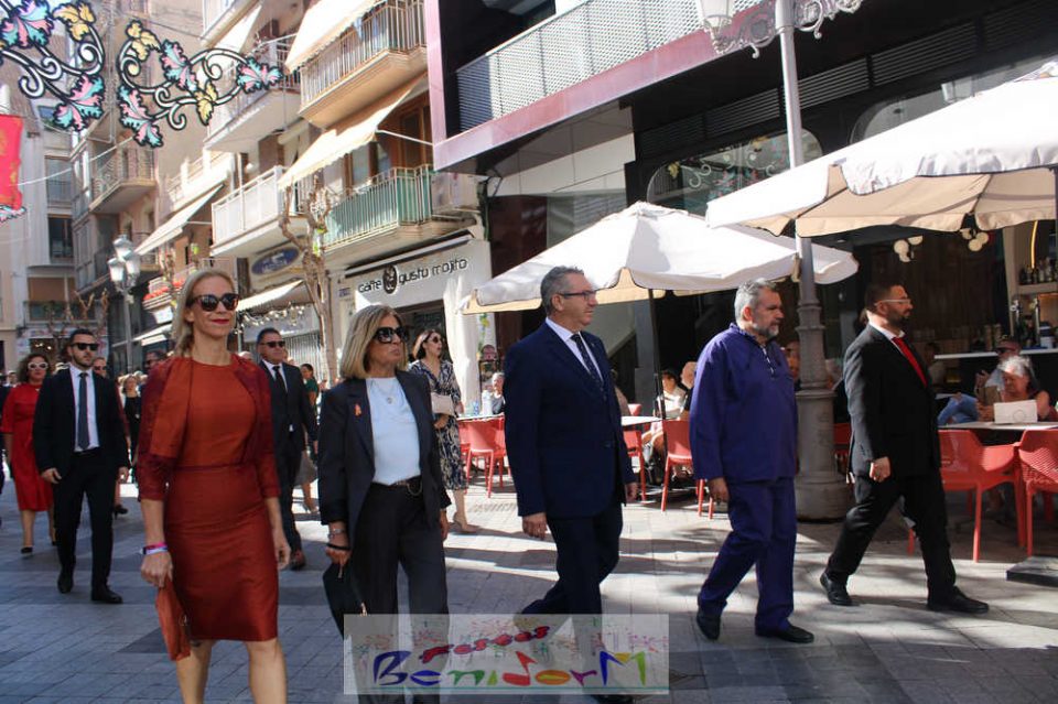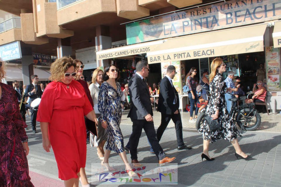 Con posterioridad, mayorales y autoridades han recogido a las reinas mayores, Valentina Alomodóbar y Laia Zamora para recorrer, en pasacalle, acompañados por las tres bandas de Benidorm, Unión, La Nova y l’Illa, la distancia que separa el Ayuntamiento de la Iglesia en la Plaza de Sant Jaume donde, a las 11.30, ha tenido lugar la misa en honor del patrón.