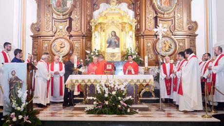 La eucaristía la ha oficiado el párroco de Redován, arcipreste y profesor del Seminario de Orihuela, Emilio Manuel Sánchez y en ella, además del titular, Juan Antonio González, han cooficiado una veintena de sacerdotes de Benidorm y localidades vecinas. La nota musical la ha puesto la Agrupación Coral de Sant Joan d’Alacant., bajo la dirección de Juan Antonio Espinosa.