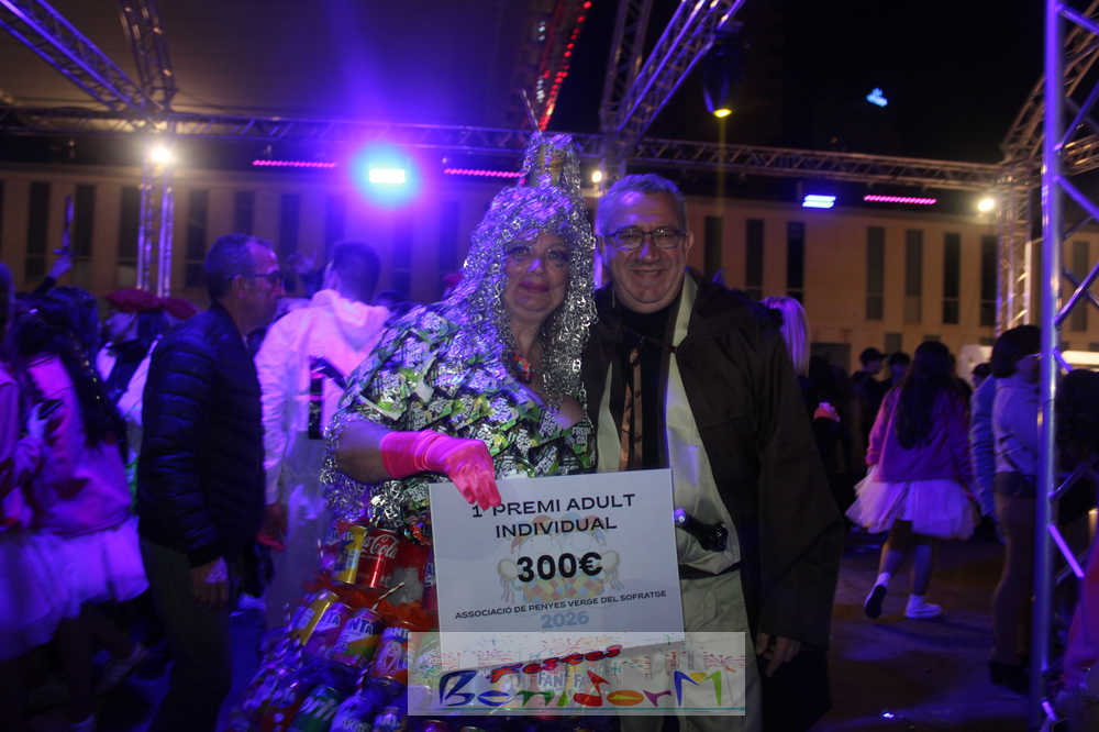 Pasada la 1:30 de la madrugada, ha sido el momento de los premios. En la categoría individual, el jurado ha otorgado el primer premio a ‘Refresco de reciclaje’, mientras que el segundo y el tercer puesto han recaído en ‘Ares es dios de la guerra’ y ‘Reina rosa de la samba’, respectivamente.