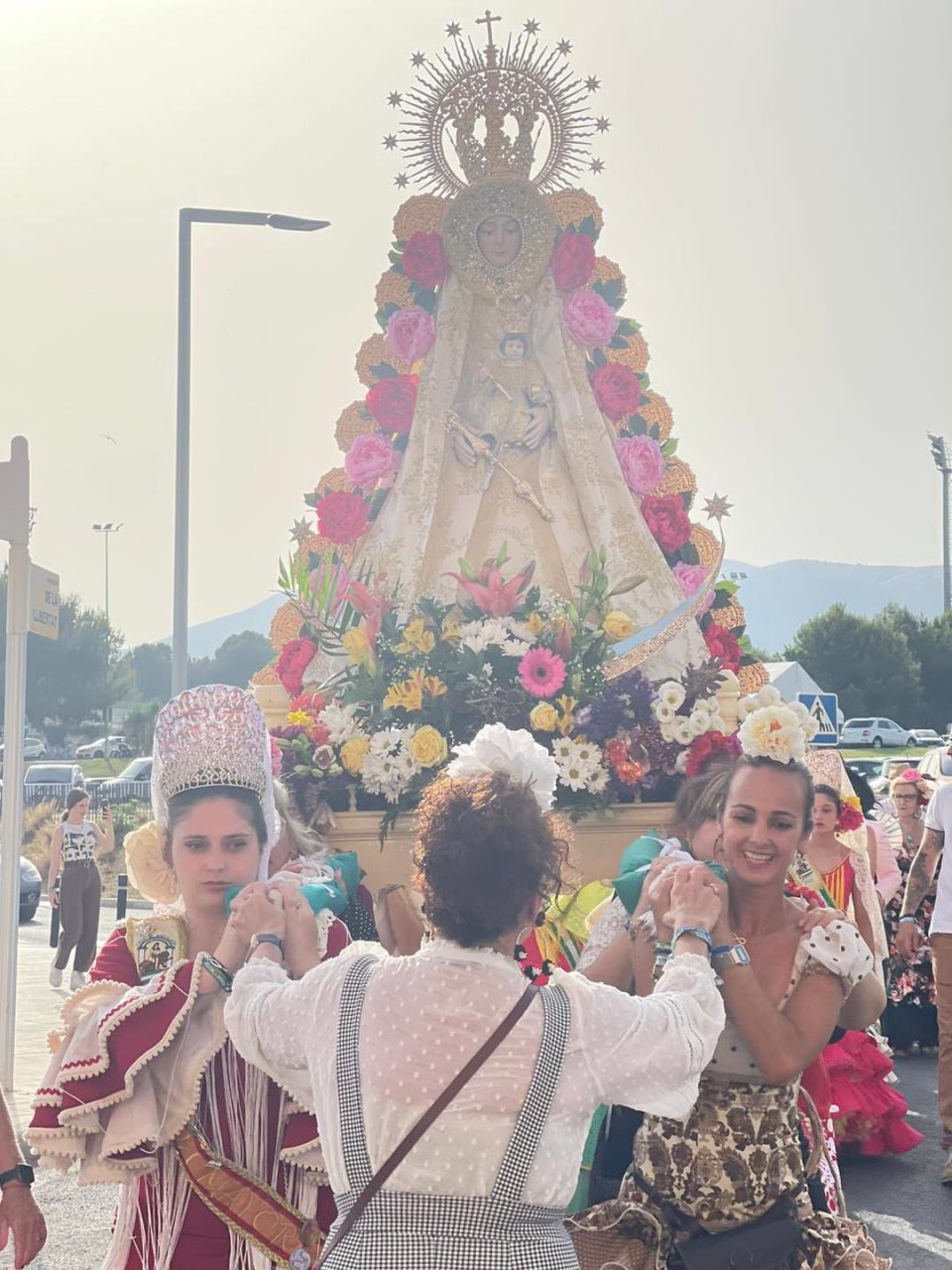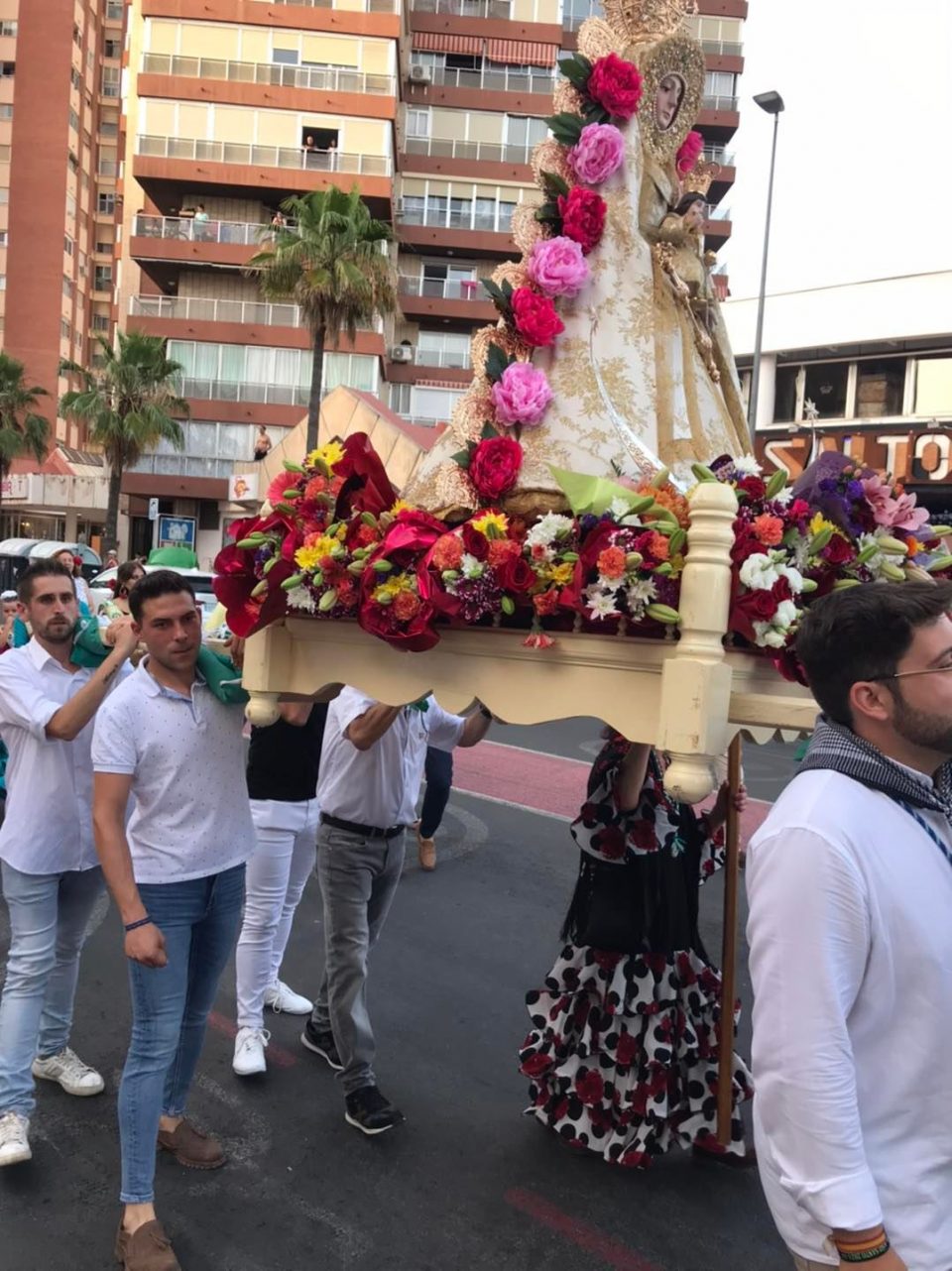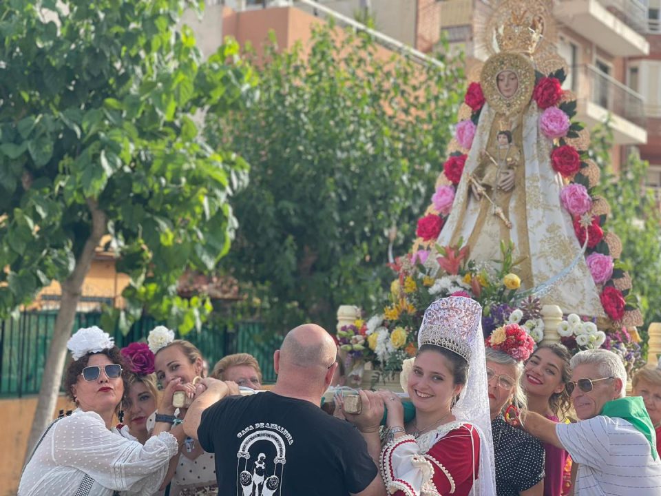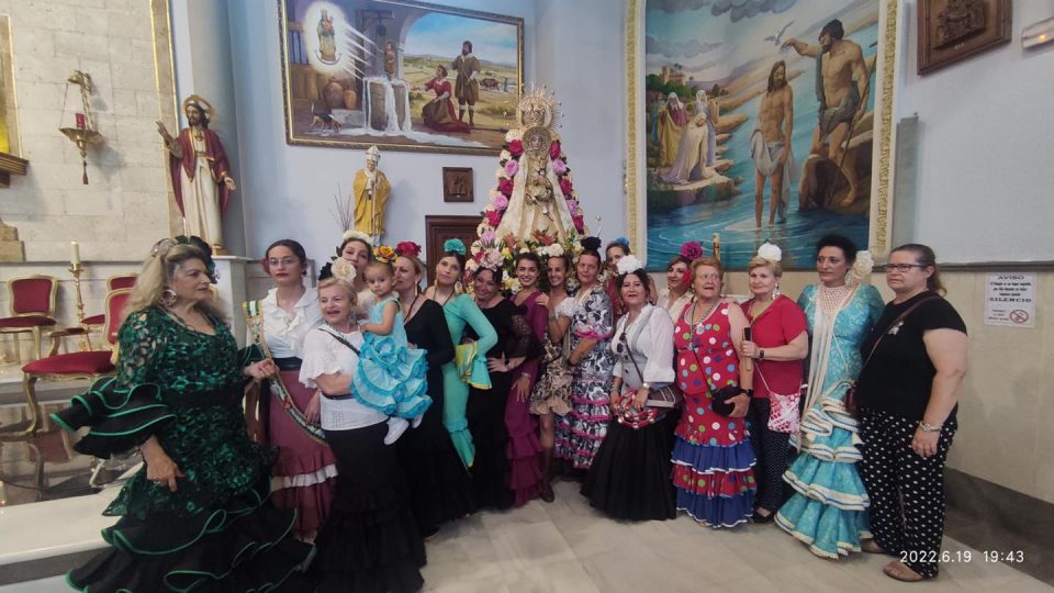 Pero toda fiesta tiene su fin, esta fue el domingo por la tarde, con “la baja” de la Virgen del Roció, que regresó a la Parroquia de Ntra. Sra. de La Almudena, esta vez a hombros de las mujeres, entre ellas su Reina Mayor, Raquel Rodríguez López de las Huertas.