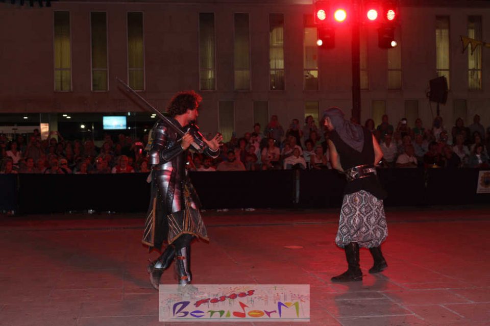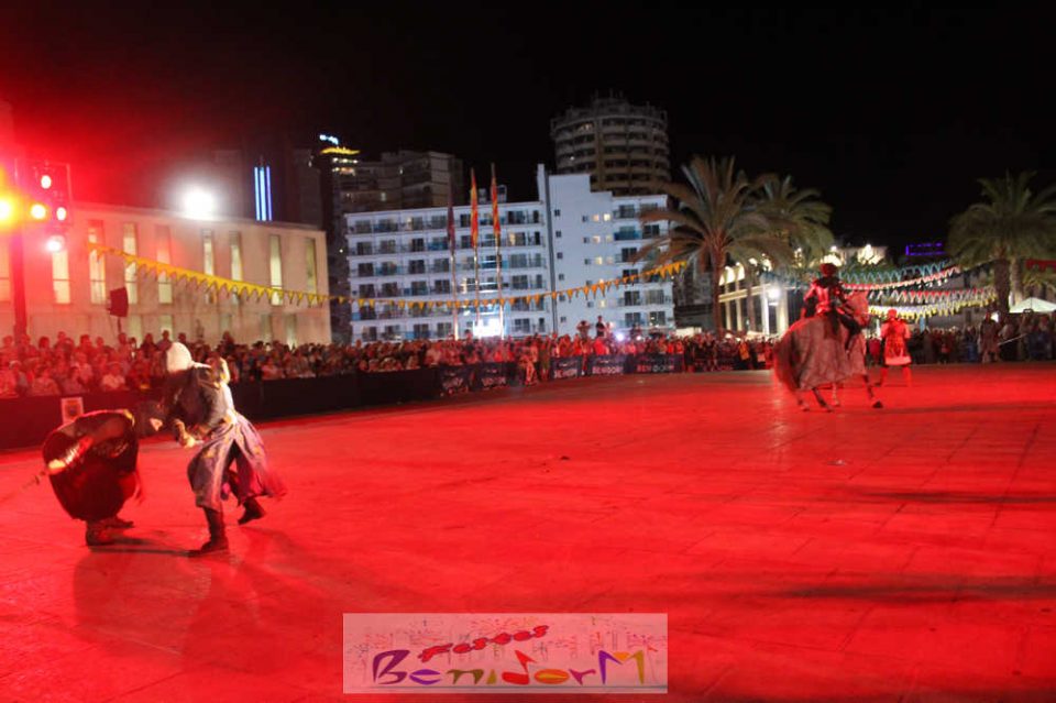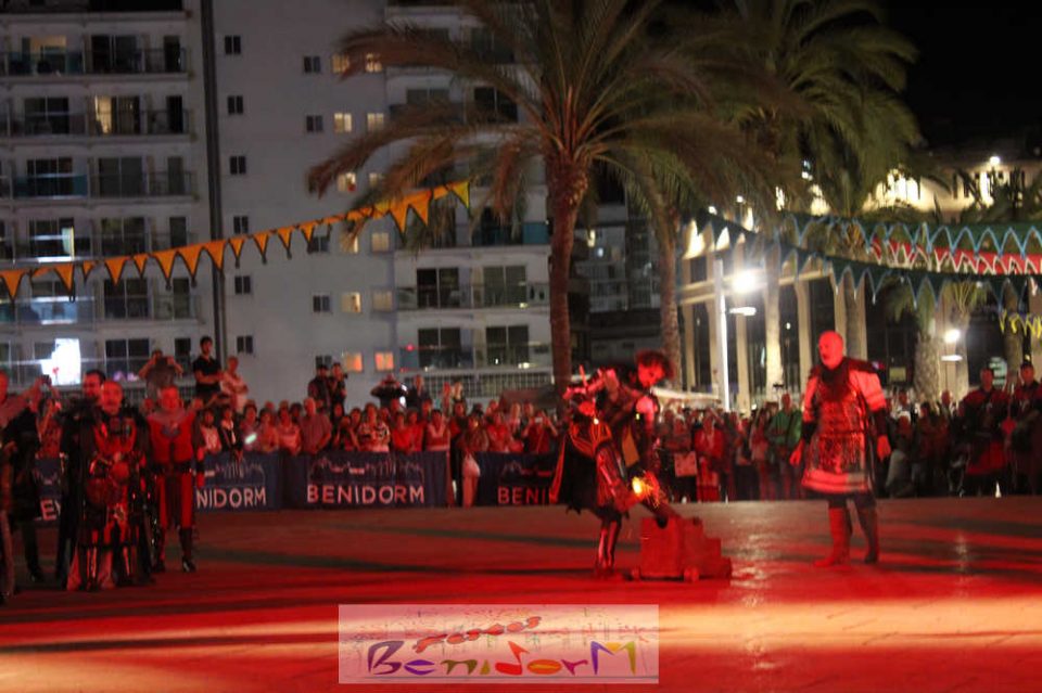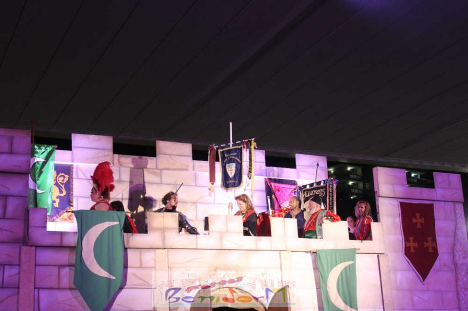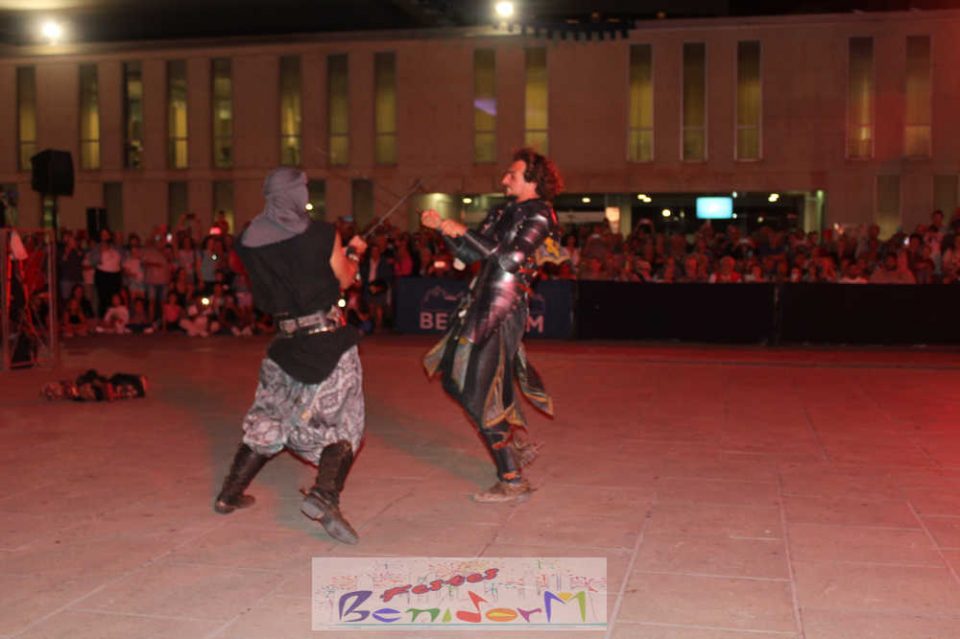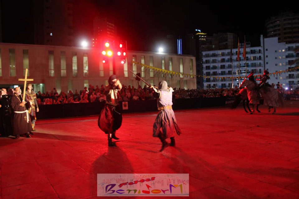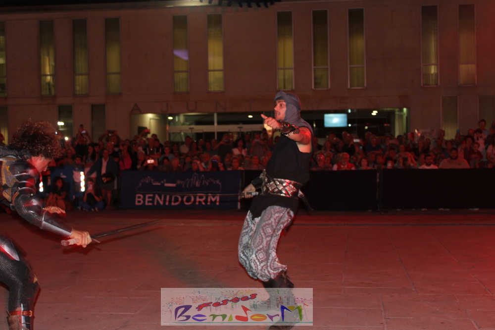 Centenares de personas disfrutaron del enfrentamiento, entre ellas la concejal de Fiestas, Mariló Cebreros y el de Eventos, Jesús Carrobles, que han acompañado al presidente de la Asociación de Moros y Cristianos de Benidorm, Arturo Mira, en los fastos del día.