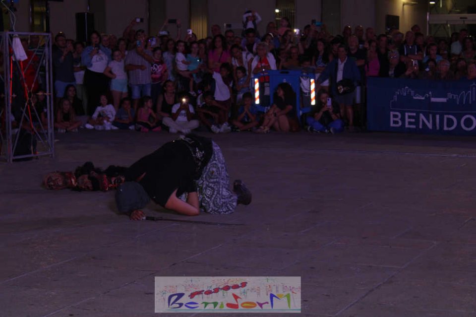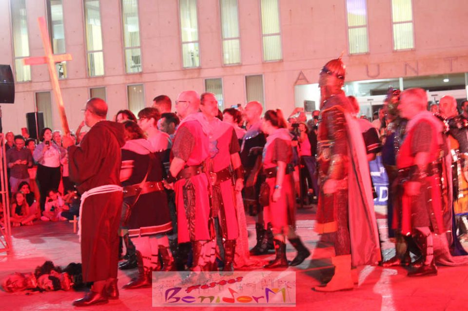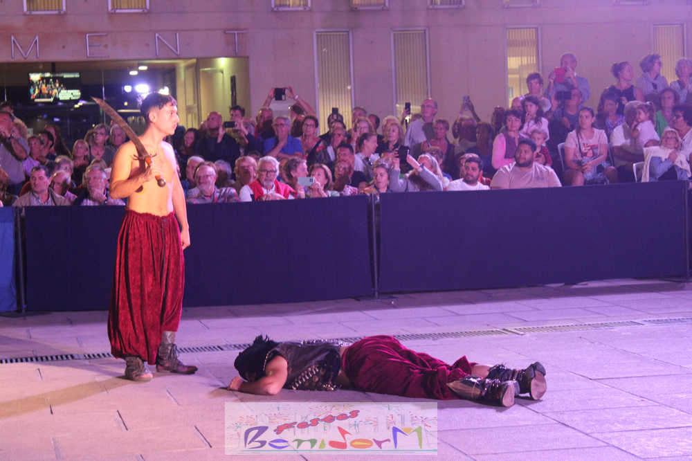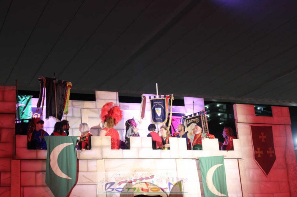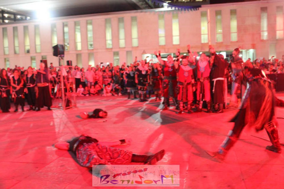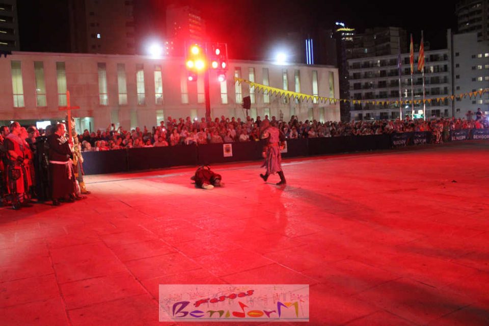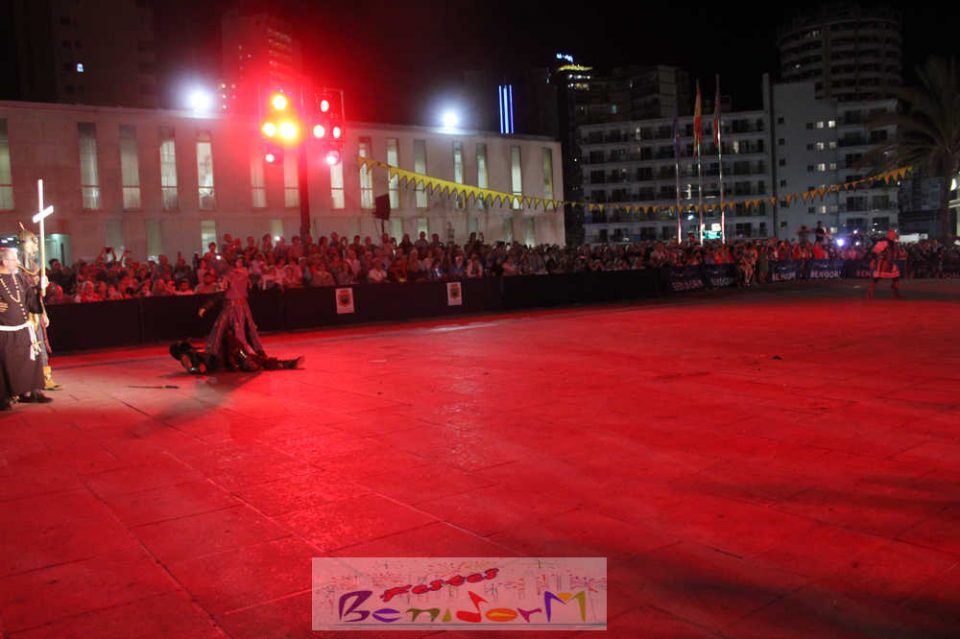 Centenares de personas disfrutaron del enfrentamiento, entre ellas la concejal de Fiestas, Mariló Cebreros y el de Eventos, Jesús Carrobles, que han acompañado al presidente de la Asociación de Moros y Cristianos de Benidorm, Arturo Mira, en los fastos del día.