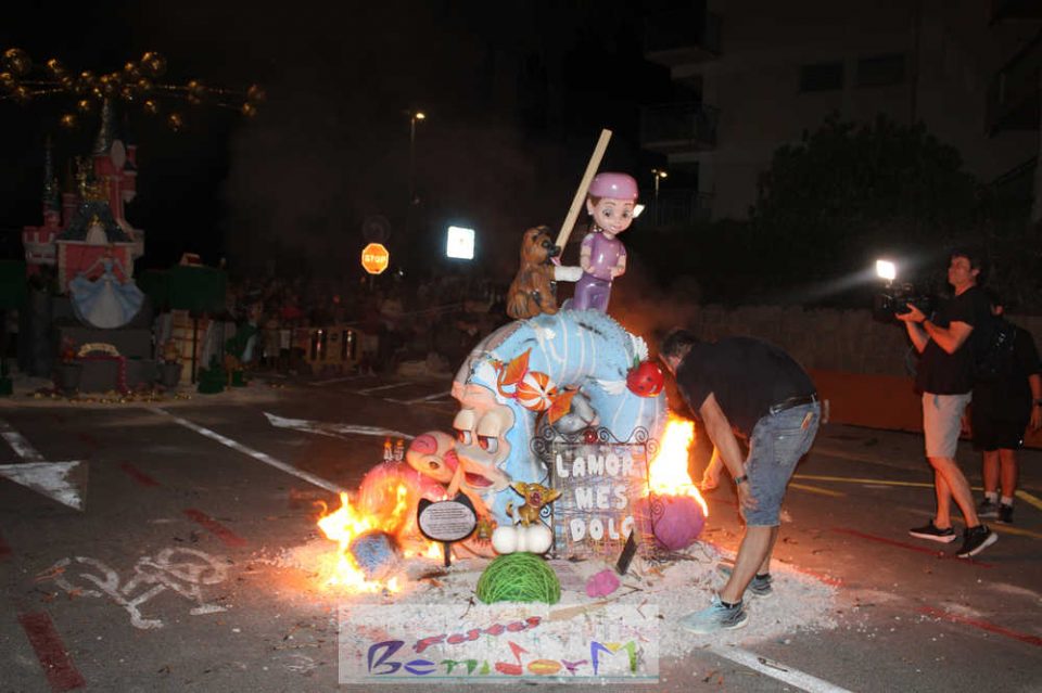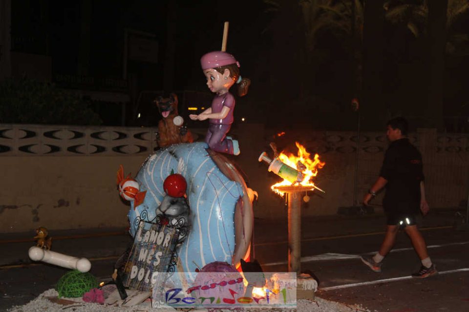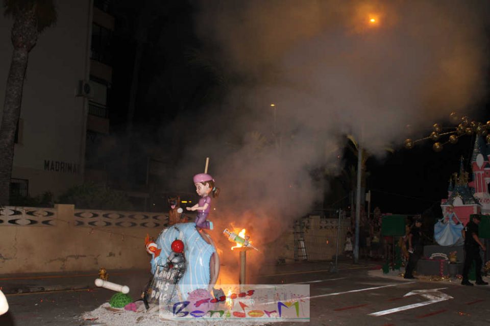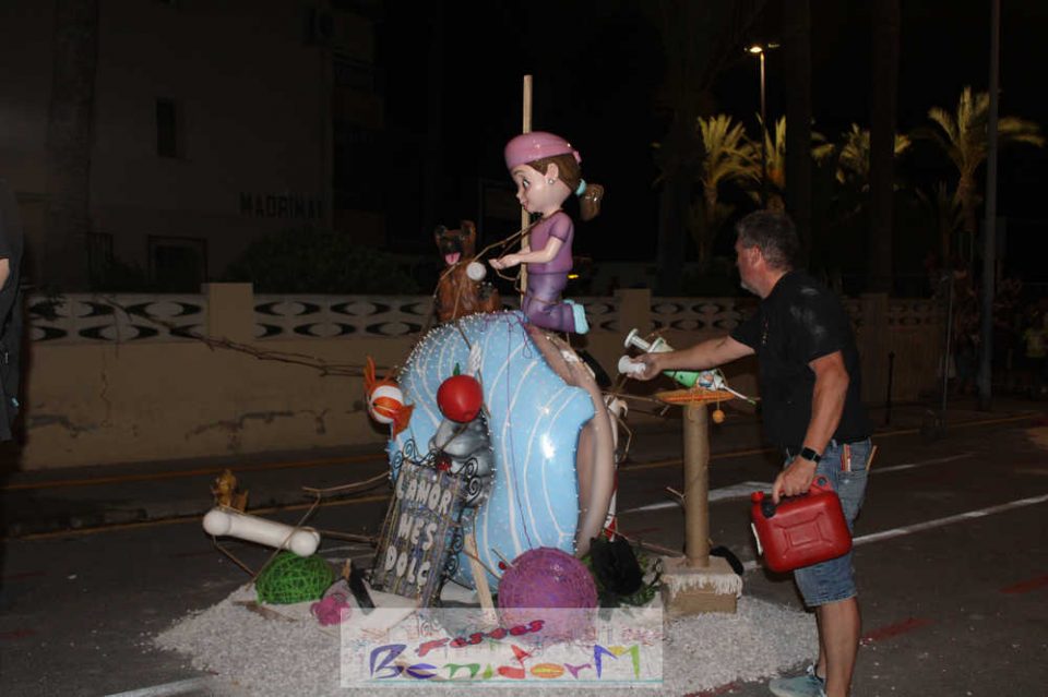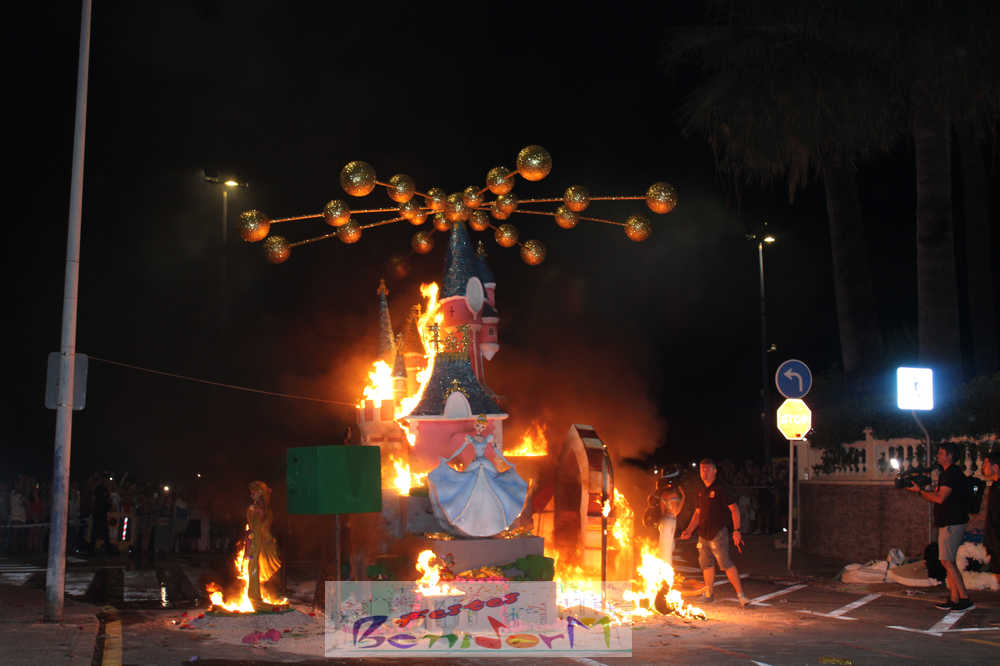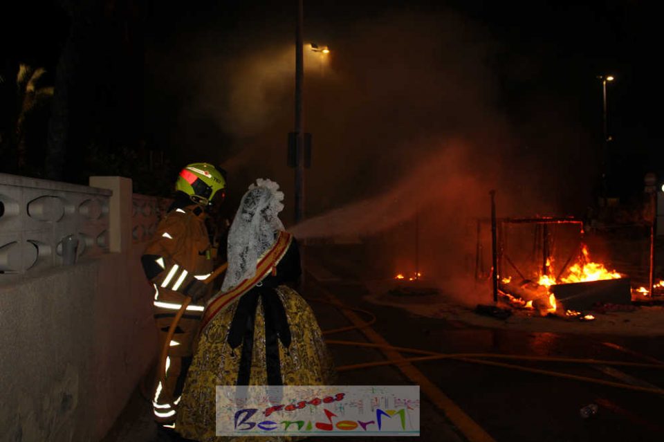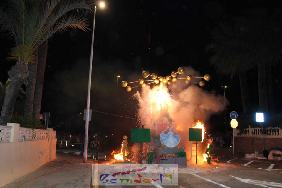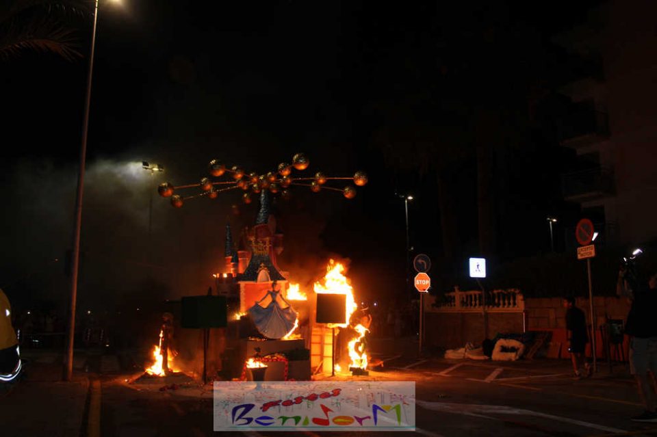 Benidorm puso fin pasada la medianoche de ayer a la fiesta de las Hogueras en el barrio de La Cala con una emotiva ‘Nit de la Cremà’ que cumplió fielmente con el ritual del fuego. El acto arrancó poco antes de las once de la noche, con la cremà de la hoguera infantil. Pocos minutos después de la medianoche le siguió la del monumento mayor. La ‘Bellesa’ Claudia Salas y la ‘Cremaora’ Paula González de Zárate fueron las encargadas de prender la mecha que acabó por devorar el monumento, no sin antes proceder al indulto de ‘ninots’ como recuerdo de este ejercicio festero. Por último, como manda la tradición, la velada finalizó con la tradicional ‘banyà’ de festeros y público. Antes del inicio de la ‘cremá’ varios centenares de personas se dieron cita en el paseo de la playa a la altura de la calle Murtal para no perderse detalle del evento.