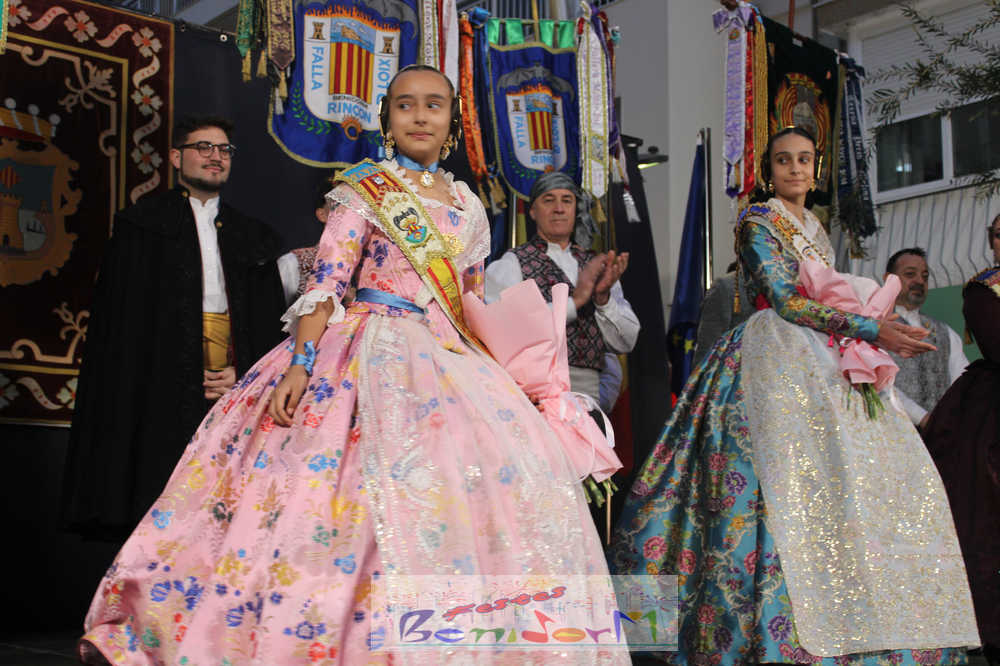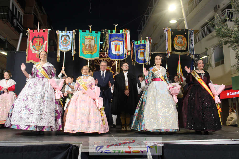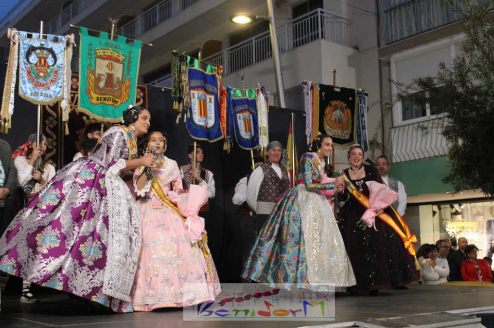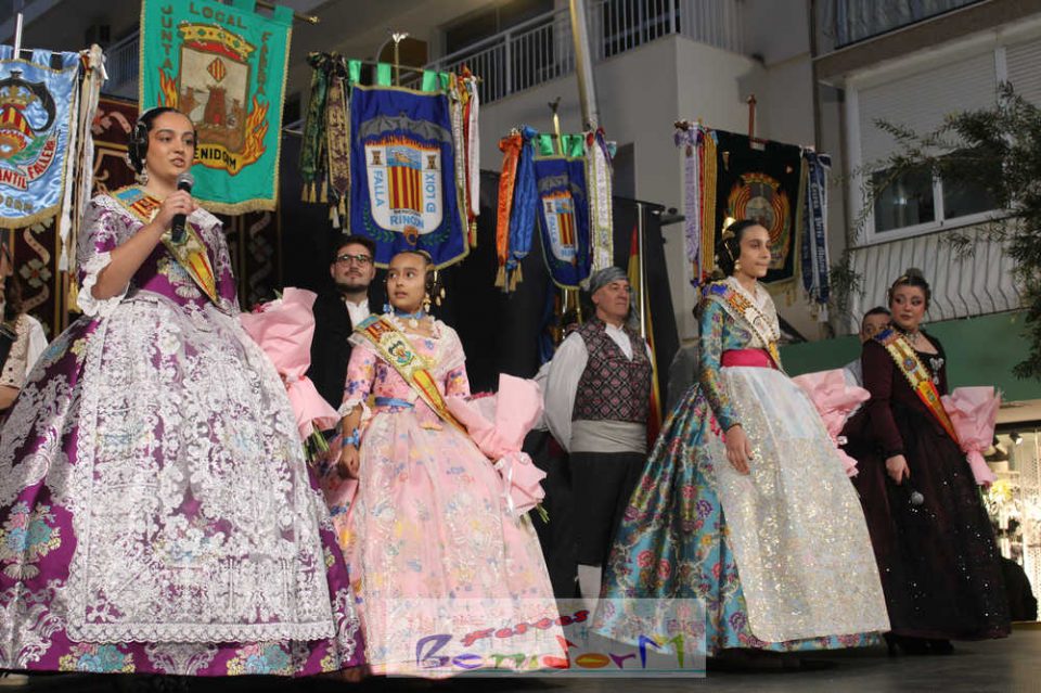 Una vez en este punto, subió al escenario el presidente de la Junta Local Fallera de Benidorm, Pablo Pérez, para recibir, una a una, a los cuadros de honor de las tres comisiones. La primera en hacerlo fue la fallera mayor de la Falla Els Tolls, Teresa Peris, que llegó acompañada de su padre y presidente de la comisión, Wenceslao Peris. Seguidamente, fue el turno de la fallera mayor infantil de la Falla Rincón de Loix, Nahia Fernández, junto a su presidente infantil, Samuel Cortés, y su presidente, Javier Rico. Las últimas en subir al estrado fueron Thais Jiménez y Jaira Rodríguez, fallera mayor infantil y fallera mayor de la Falla Benidorm Centro, a las que acompañaron sus respectivos presidentes, Carlos de Torres y Antonio de Torres.