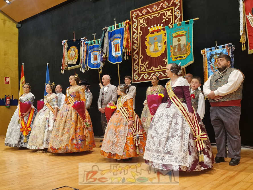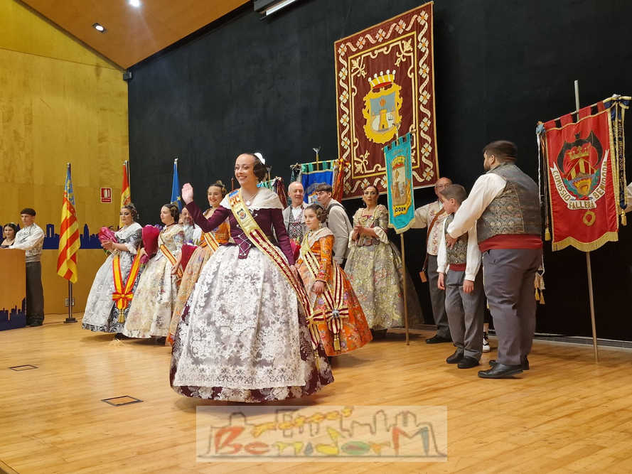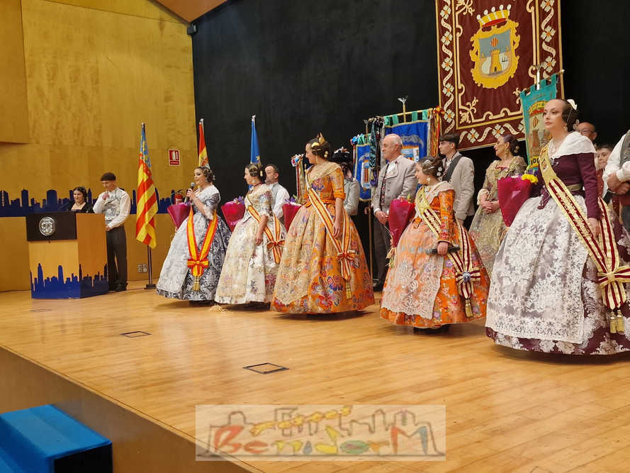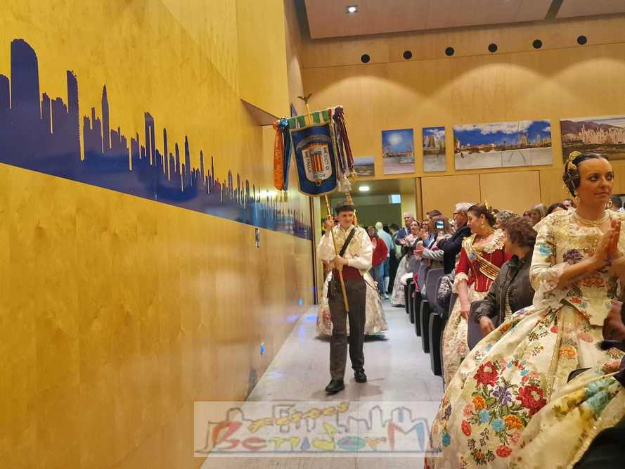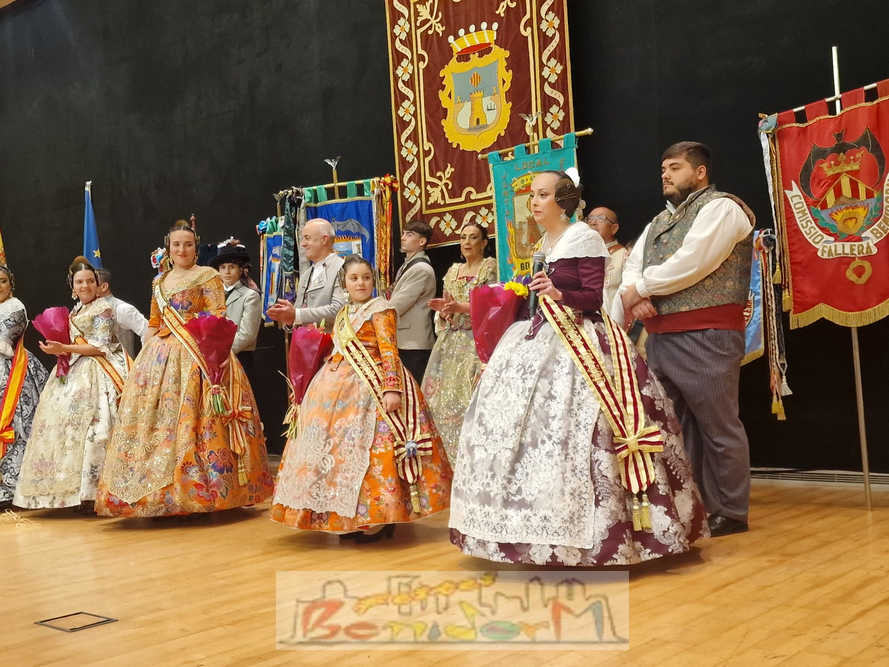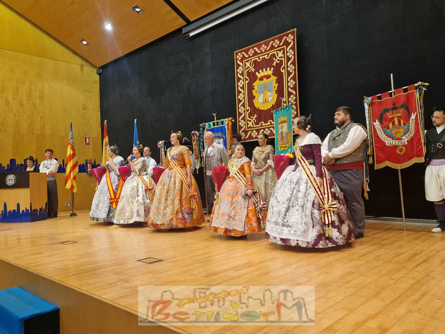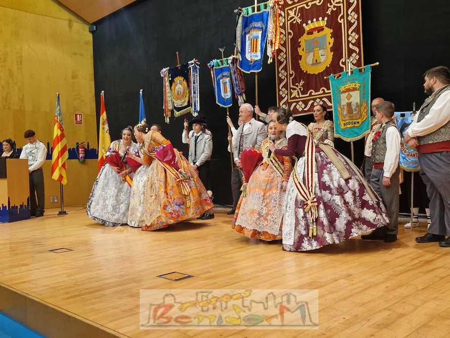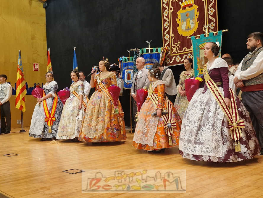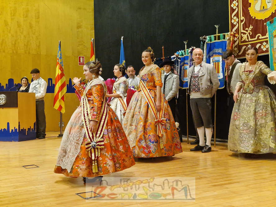 Sobre las 19.00 horas, se abría la ‘Crida’ con la subida al escenario de la presidenta de la Junta Local Fallera, María Ángeles Espinosa, acompañada por el miembro de la Junta Local, Marisa García. Después lo han hecho el estandarte de la Falla Els Tolls con su presidente Wenceslao Peris y su fallera Mayor Teresa Peris. A continuación, el estandarte de la Falla Rincón de Loix ha precedido a su presidente infantil y su fallera mayor infantil, Samuel Cortés y Ariadna Orgilés. Tras ellos han subido el estandarte de la comisión con Javier Rico, presidente, y Olaya García, fallera mayor. Por último, el estandarte de la comisión infantil de la Falla Benidorm Centro ha hecho su aparición con el presidente infantil, Carlos de Torres, y la fallera mayor infantil, Adriana Baldó. Finalmente, el presidente de la comisión Benidorm Centro, Vicente Jorro y la fallera mayor, Laura Pascual, también han subido al escenario.