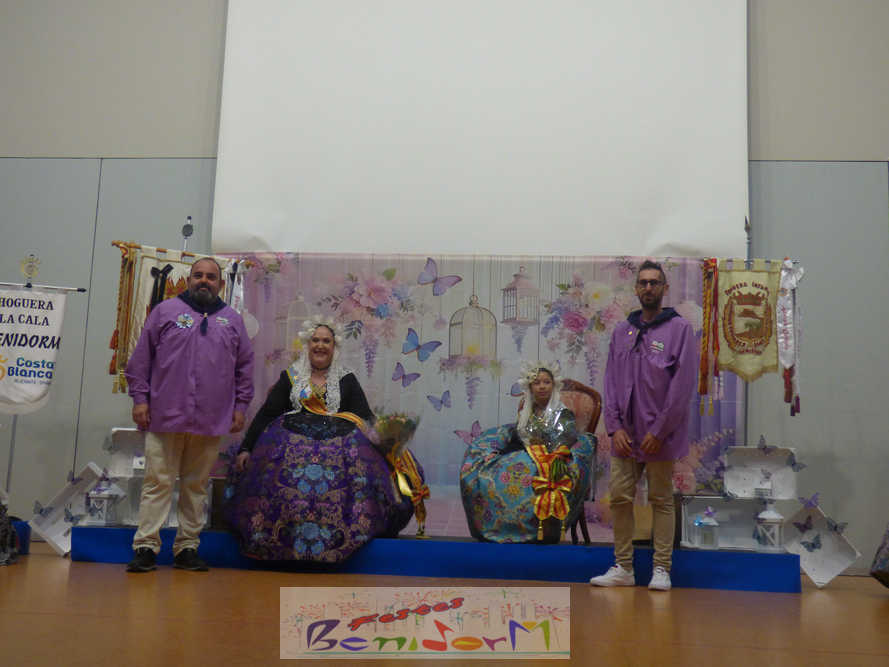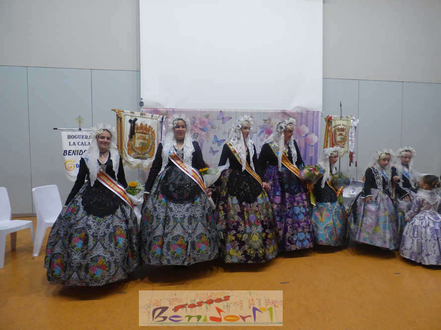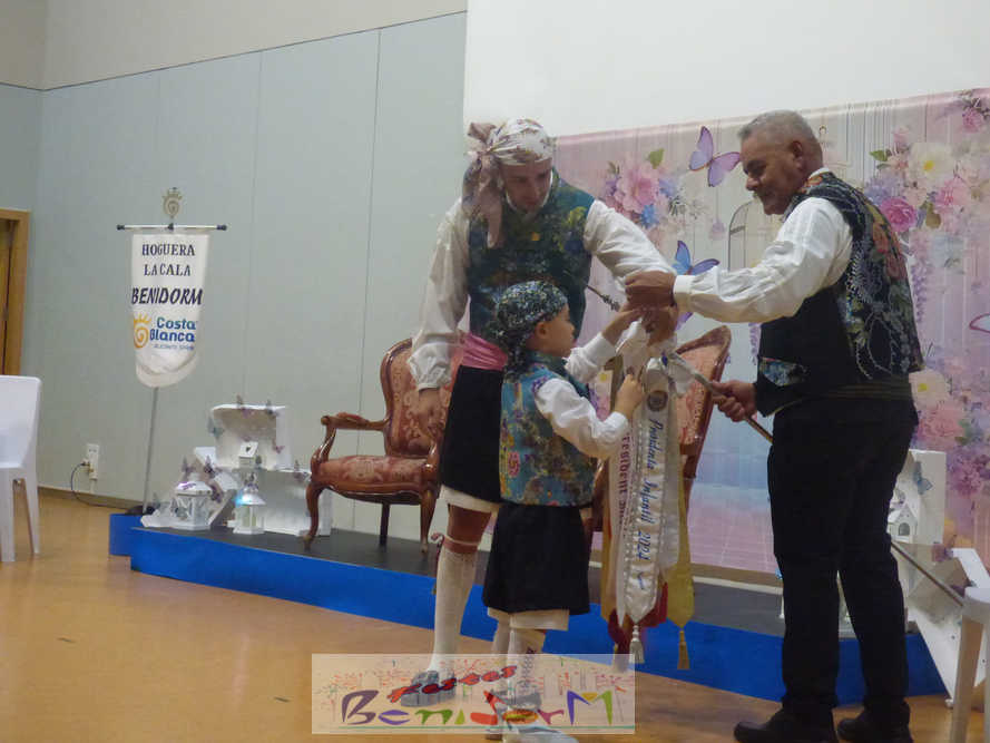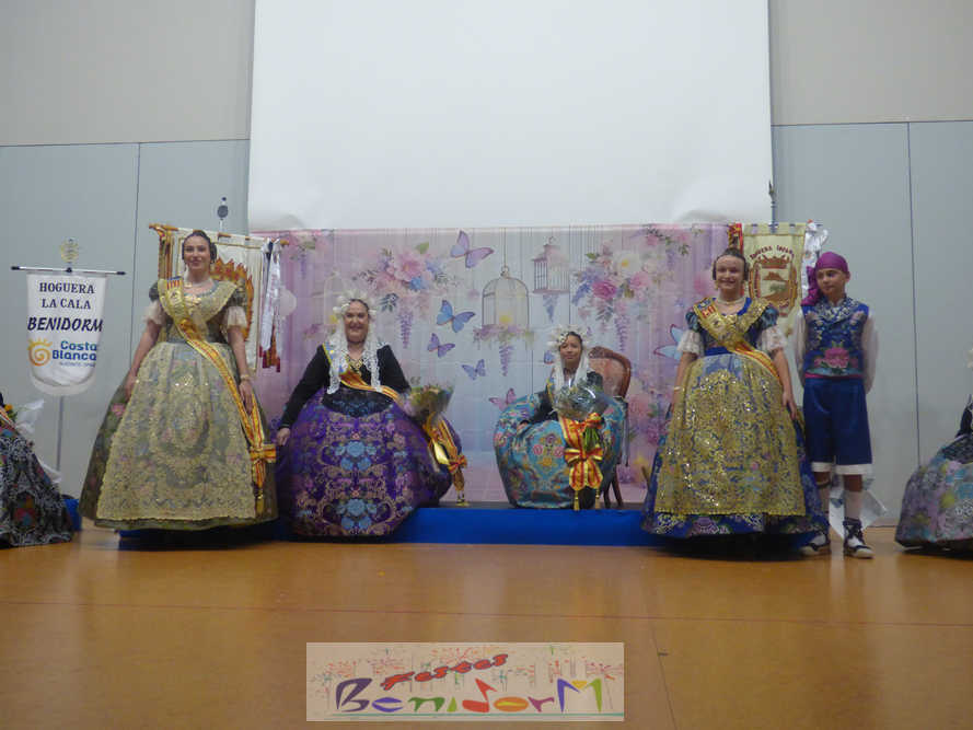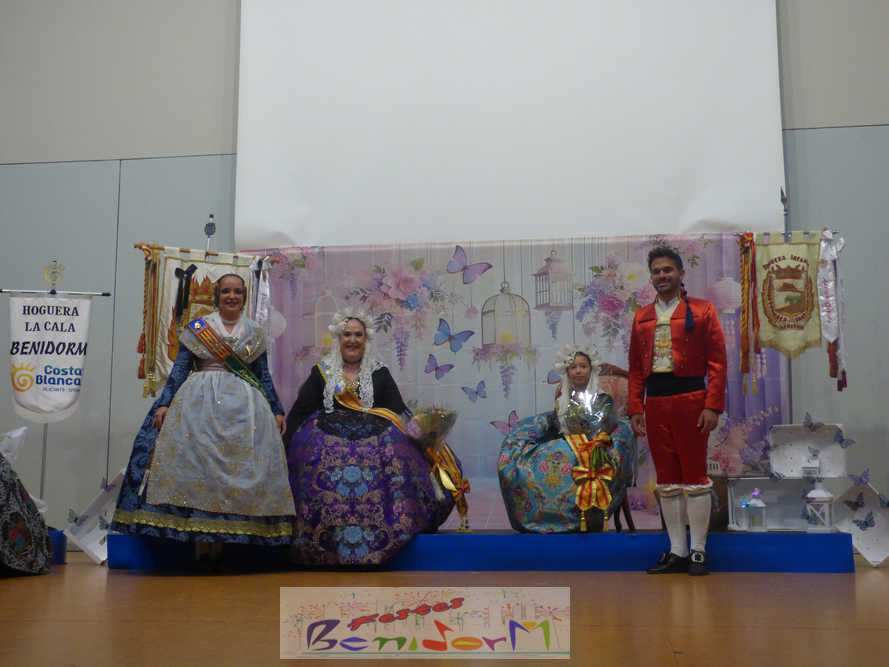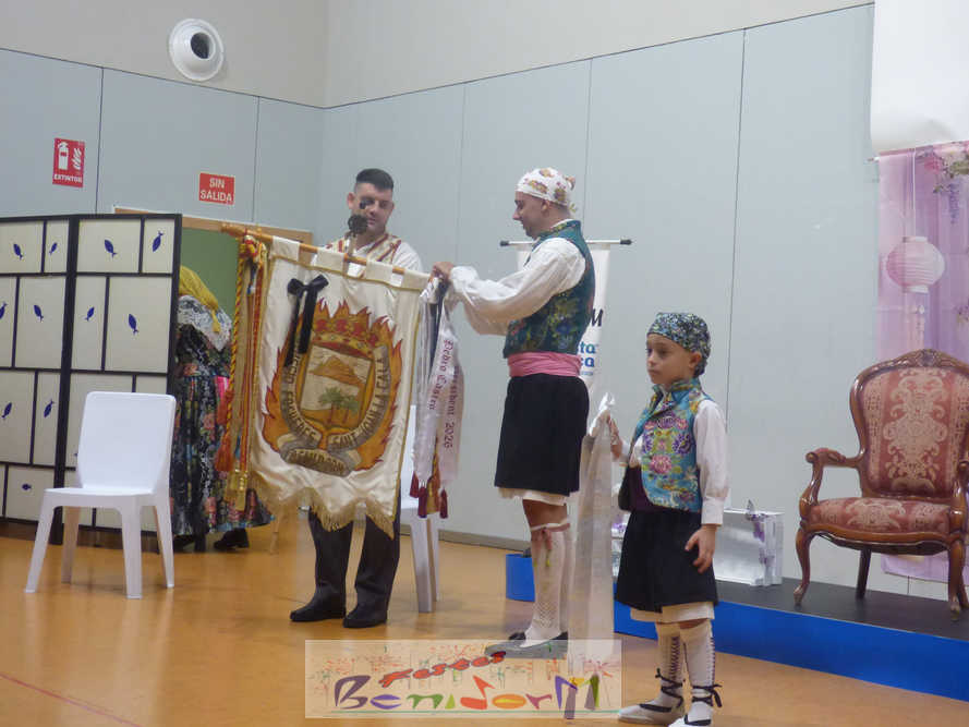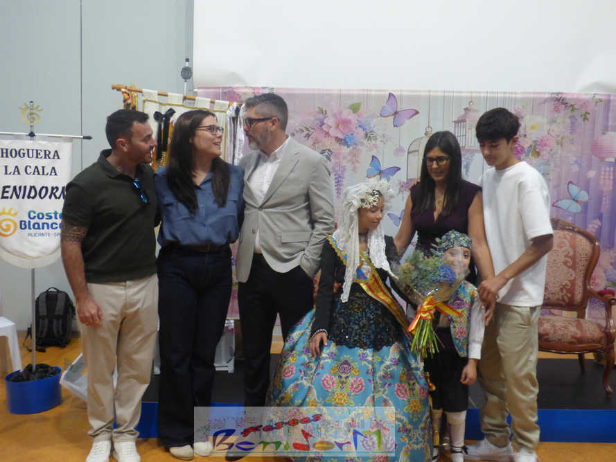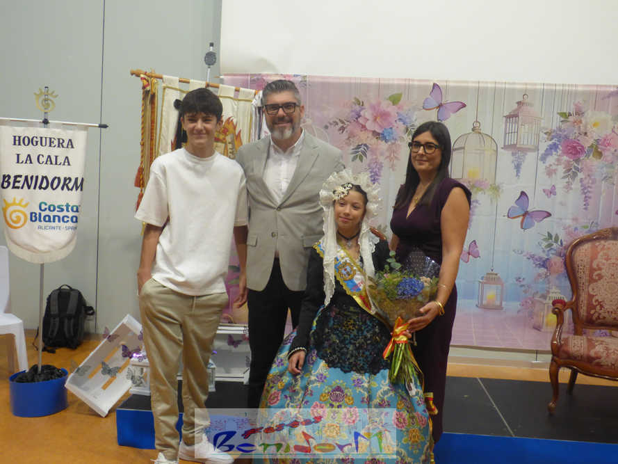Seguidamente, los presidentes de la Hoguera La Cala, don Pedro Castro y el niño Héctor Quirante, subieron al escenario para imponer los corbatines a los estandartes de la Hoguera, símbolo de un año de trabajo y dedicación. La ceremonia continuó con la Bellezas y las Damas de honor de la belleza del Foc de Benidorm 2026, comenzando por la Dama de Honor infantil, la niña Valentina Baldo, y la Belleza del foc infantil 2025, Nerea Cerrato y Claudia Salas Belleza del foc infantil 2025