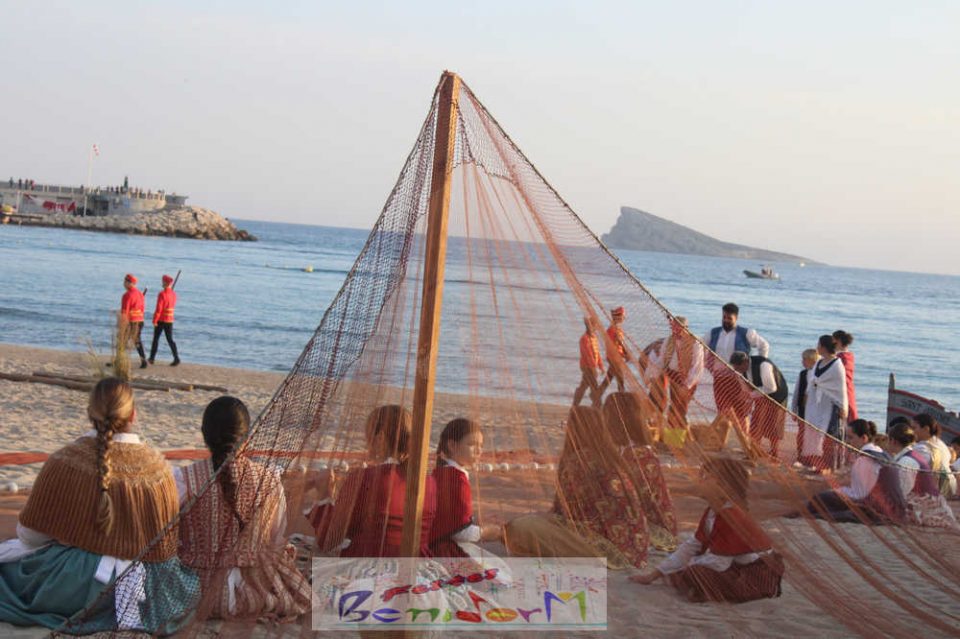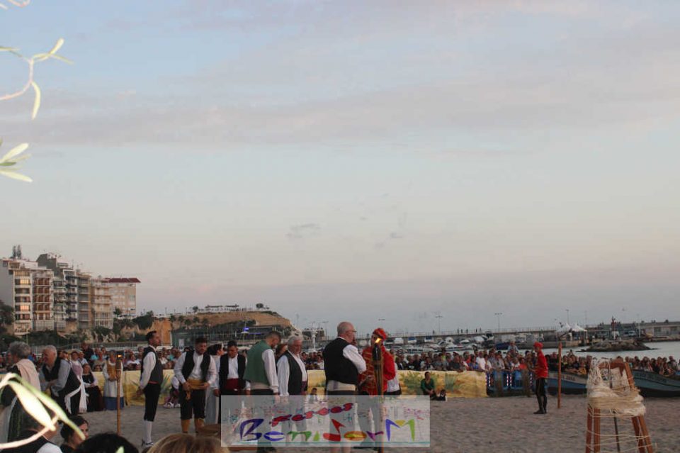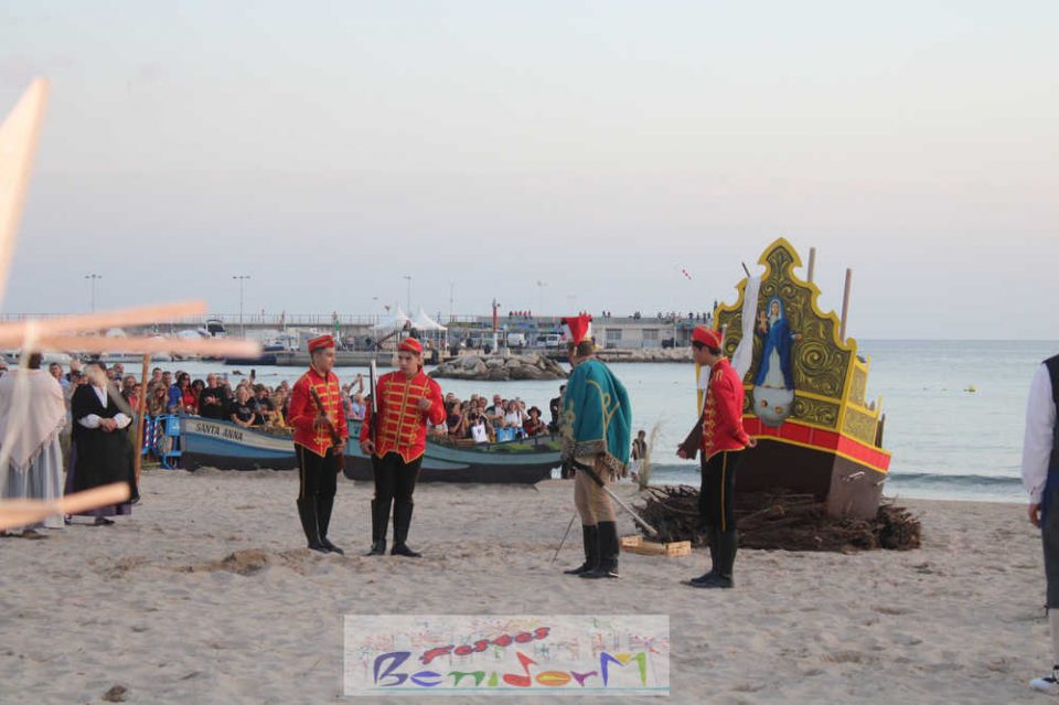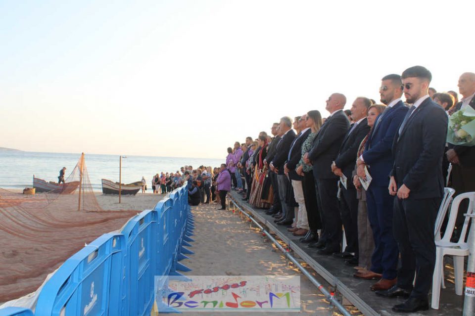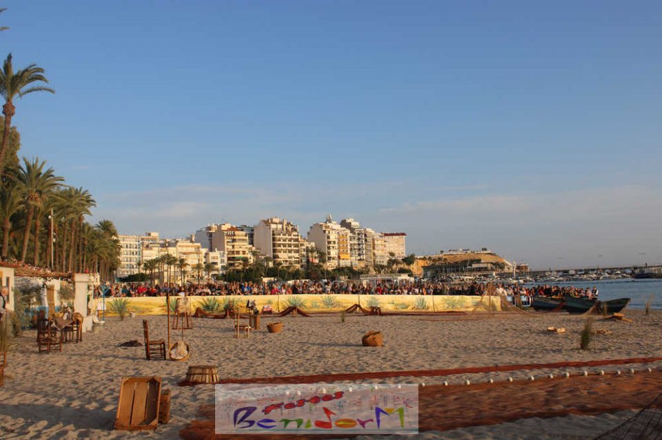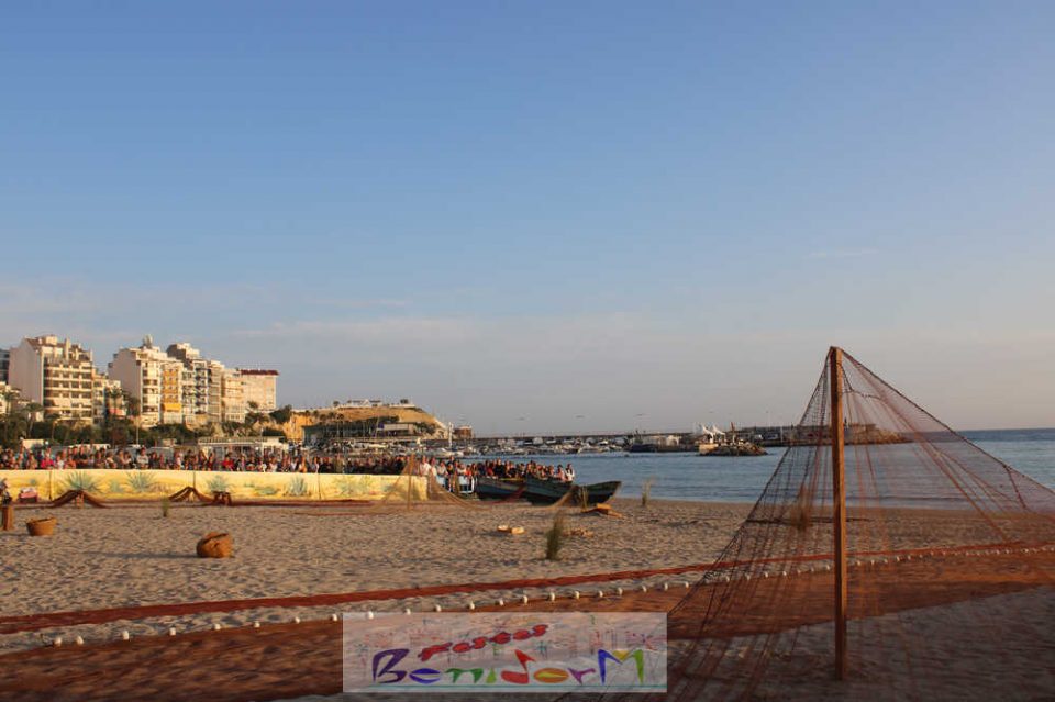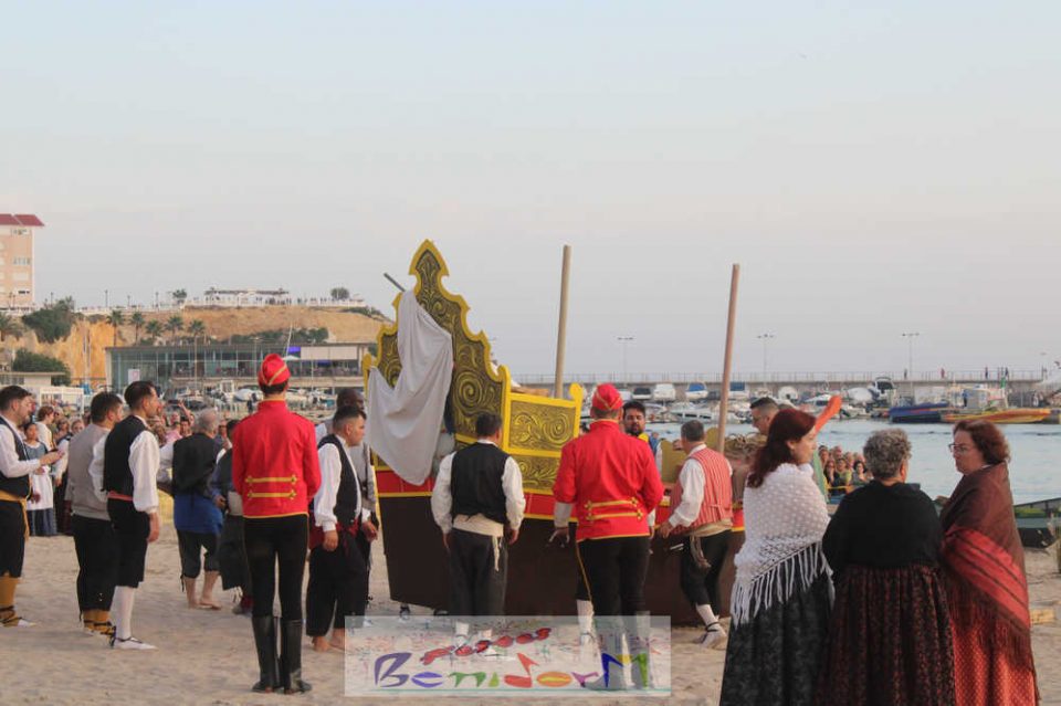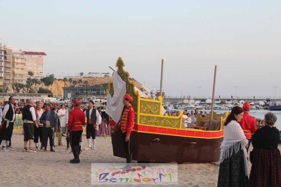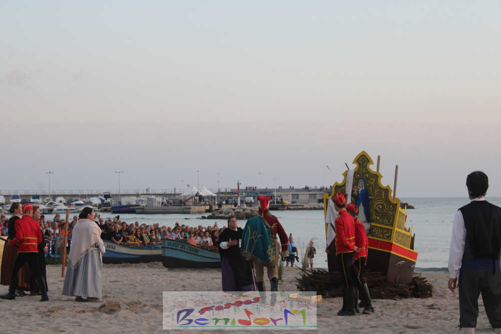 Lo hacía a bordo de una embarcación que navegaba sin tripulación, a la deriva, y que fue remolcada hasta la costa por tres marineros de Benidorm. La Escenificación del Hallazgo, declarada Fiesta de Interés Turístico de la Comunidad Valenciana, volvió a reunir en la arena de Poniente a varios centenares de personas para poder presenciar en directo el acto, que representa cada año desde 1971 la Associació Cultural y Recreativa La Barqueta. Antes de comenzar, sin embargo, se guardó un respetuoso minuto de silencio por las víctimas de la DANA de Valencia y por Jaume Climent, miembro de la ACR La Barqueta, fallecido hace menos de un año.