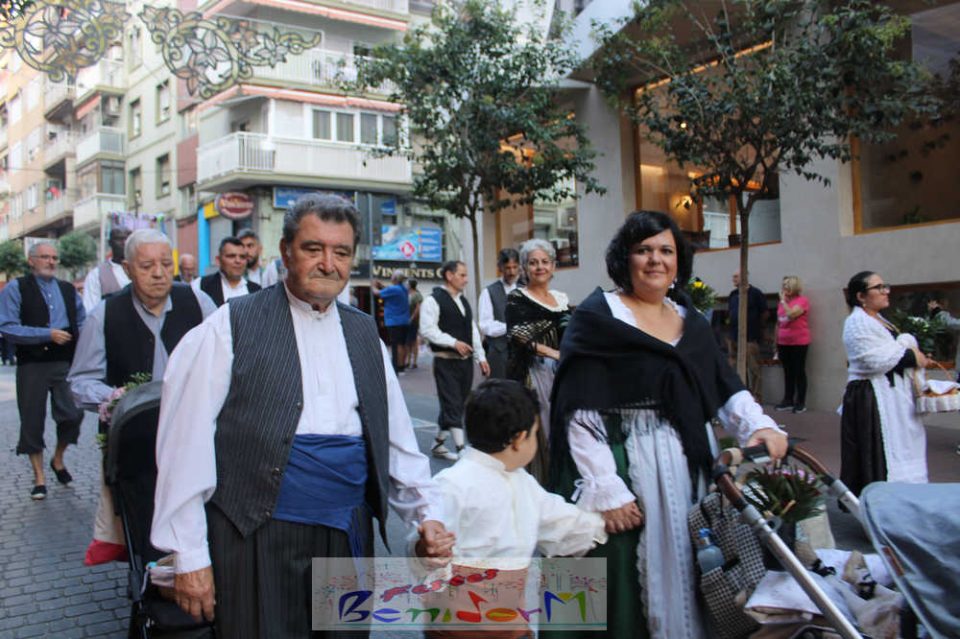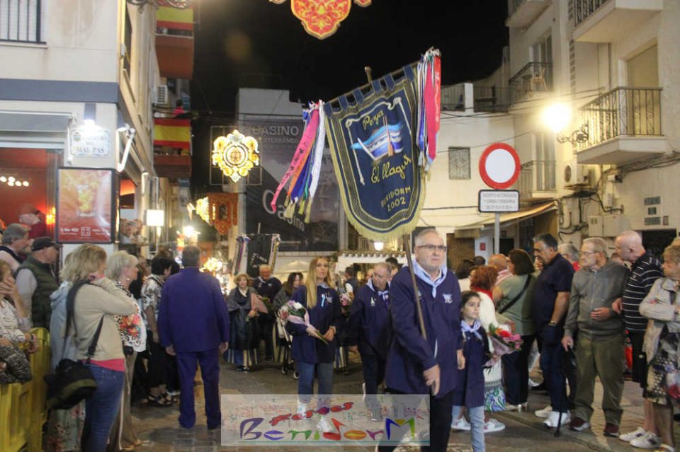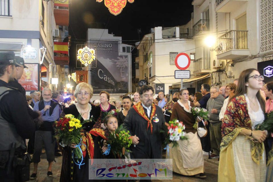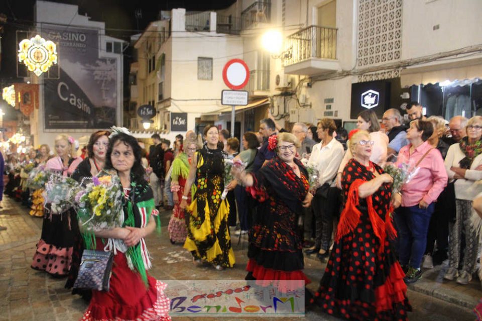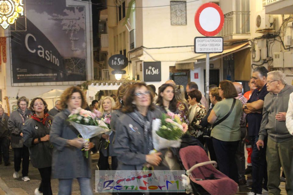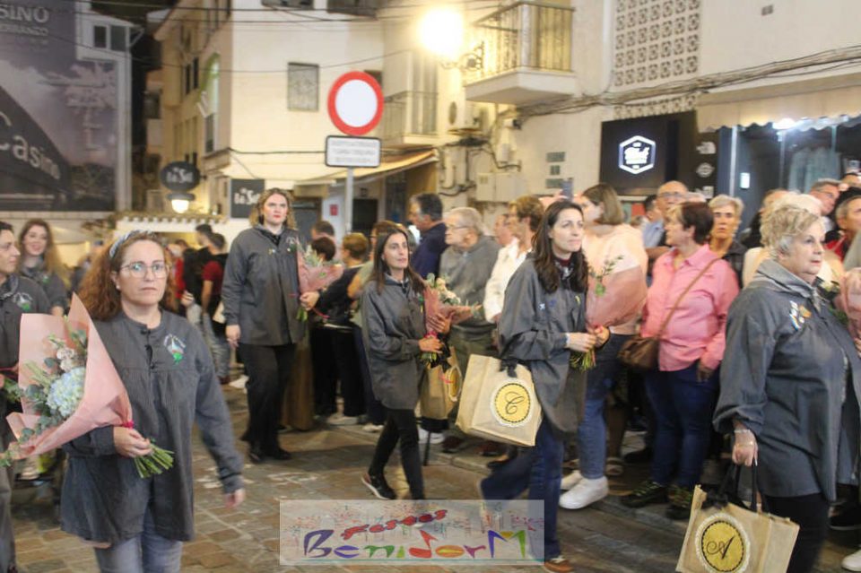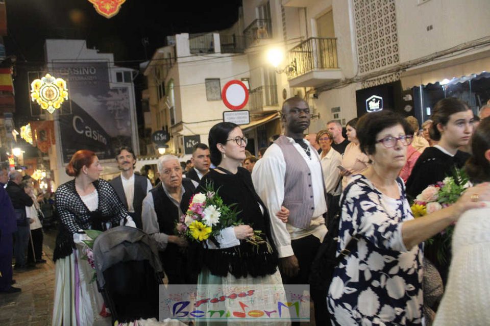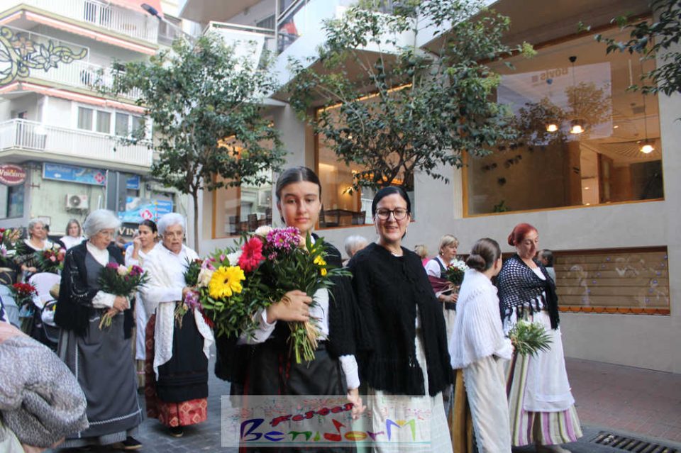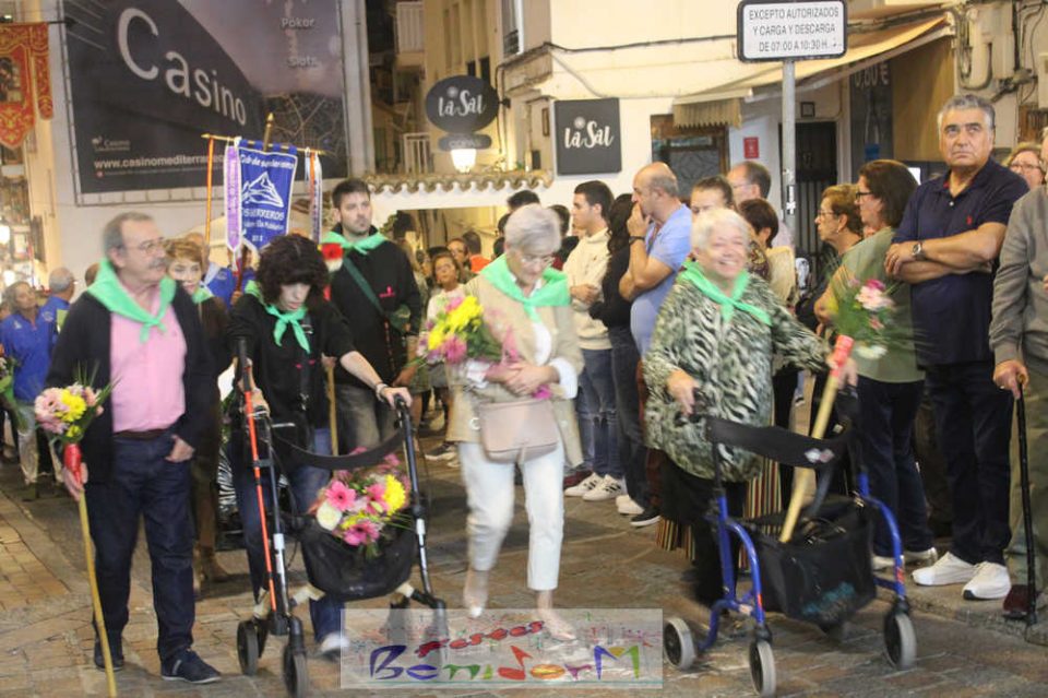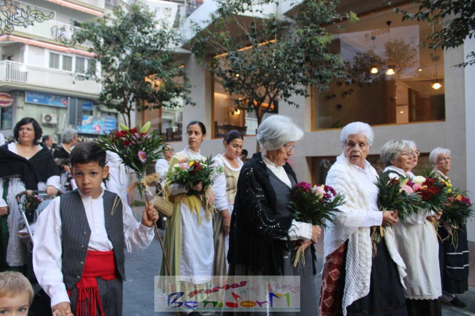 Centenares de benidormenses, vecinos de otras poblaciones y turistas participaron o aplaudieron este desfile a lo largo de todo el recorrido. Y quienes salieron en él lo hicieron portando vistosos y coloridos ramos o cestas de flores en señal de devoción a la patrona, a la que lanzaron besos, pidieron protección o ante la cual derramaron lágrimas de emoción o tristeza por el recuerdo de seres queridos.