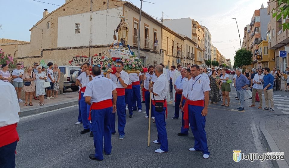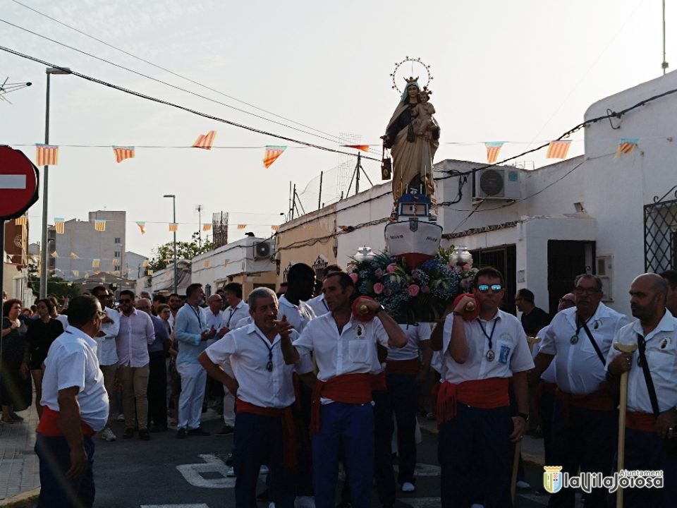 Tras la misa, la imagen fue trasladada en procesión por las calles de Villajoyosa, desde la iglesia del Carmen hasta el puerto pesquero, acompañada de marineros y marineras, así como el Patrón Mayor de la Cofradía de Pescadores, Mateo Espín, el Alcalde Marcos Zaragoza, los miembros de la Corporación municipal y de la Cofradía de Pescadores y vecinos del pueblo.