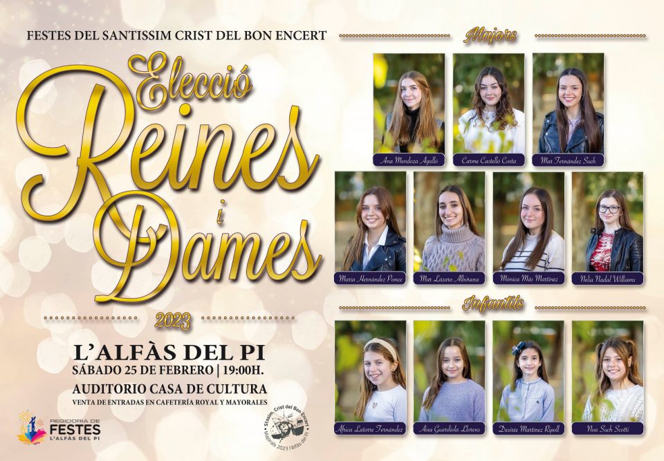 El próximo sábado 25 de febrero la Casa de Cultura de l’Alfàs del Pi acogerá, a las 19 horas, el acto de elección de las reinas y damas de las próximas Fiestas del Jubileo y del Santísimo Cristo del Buen Acierto. Un acto organizado por los Mayorales de 2023, en colaboración con la concejalía de Fiestas del Ayuntamiento de l’Alfàs del Pi. Son 4 niñas y 7 jóvenes las que optan a ser elegidas reinas de las fiestas, convirtiéndose en las grandes protagonistas de la velada.