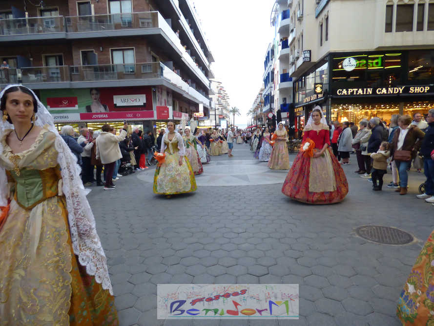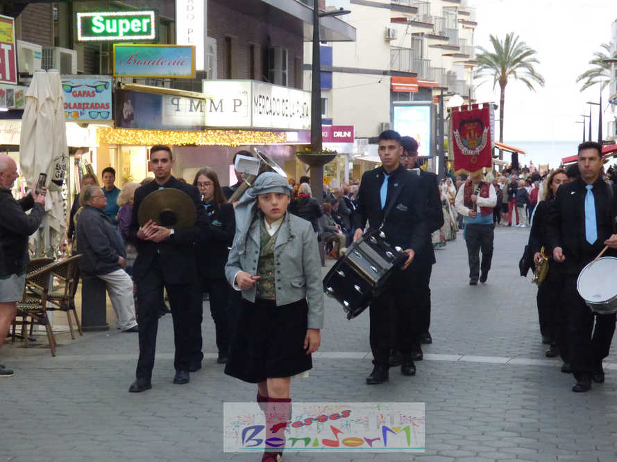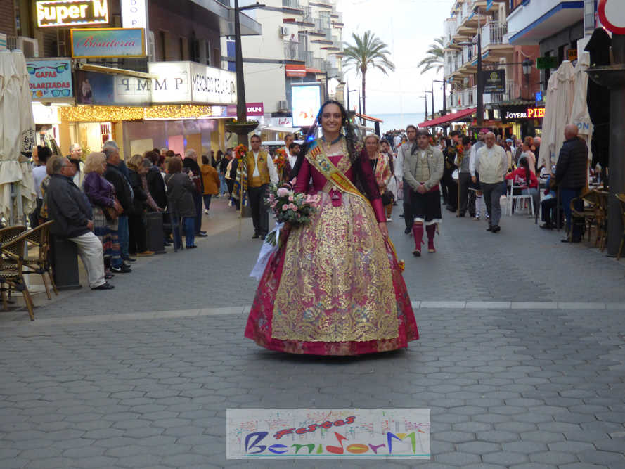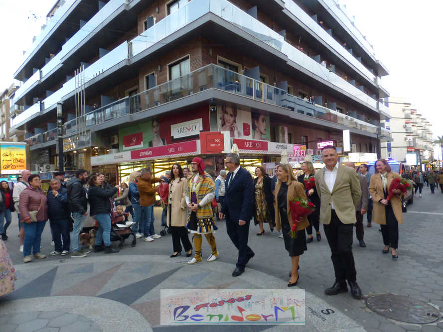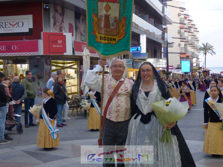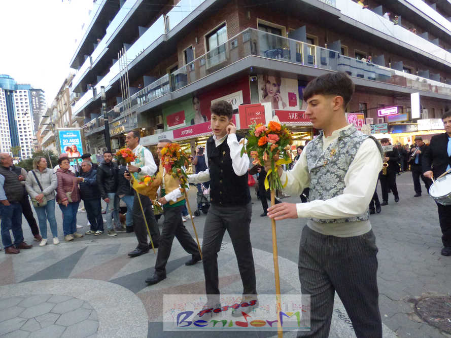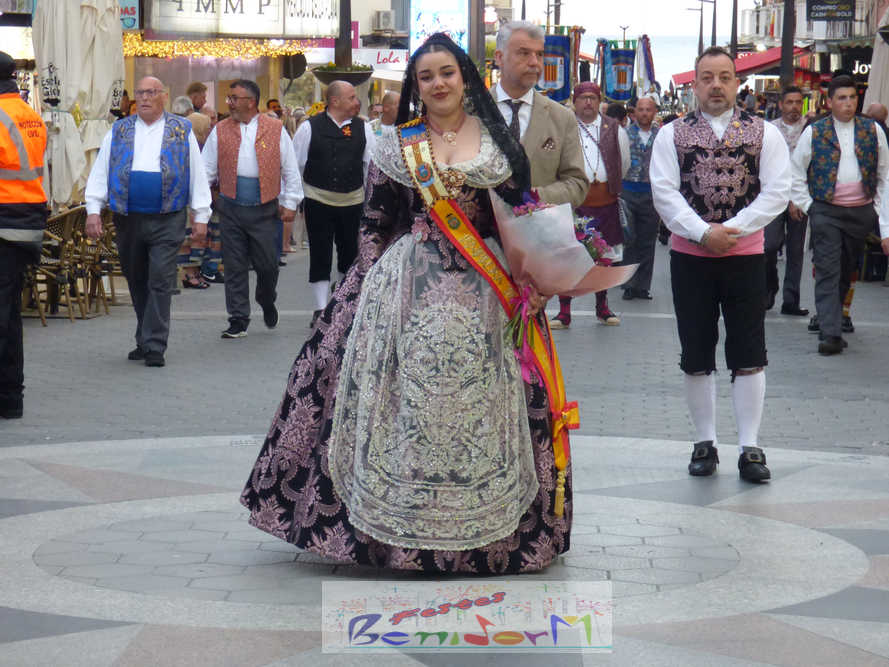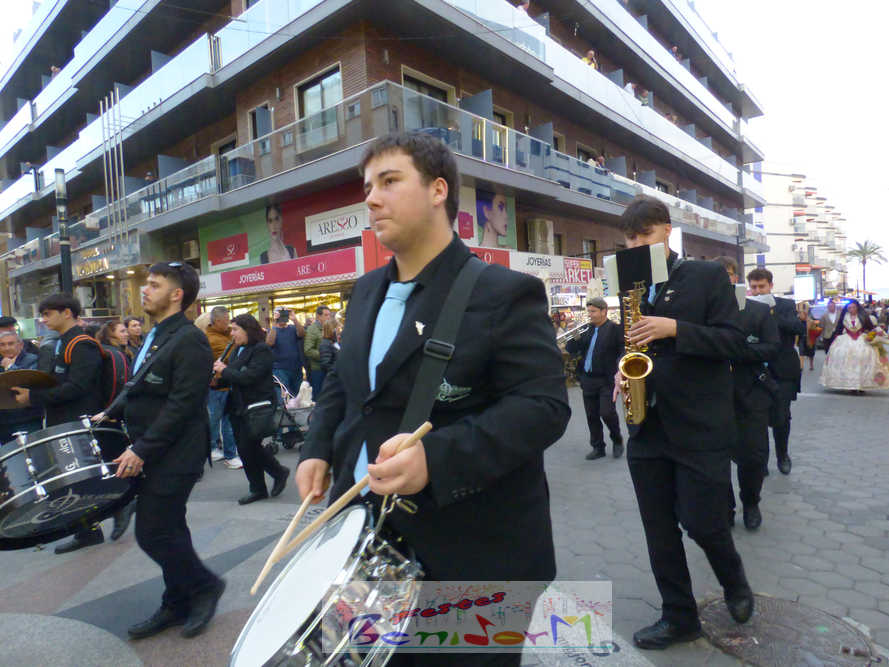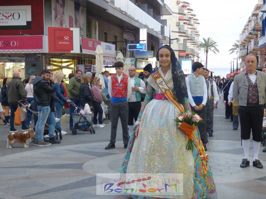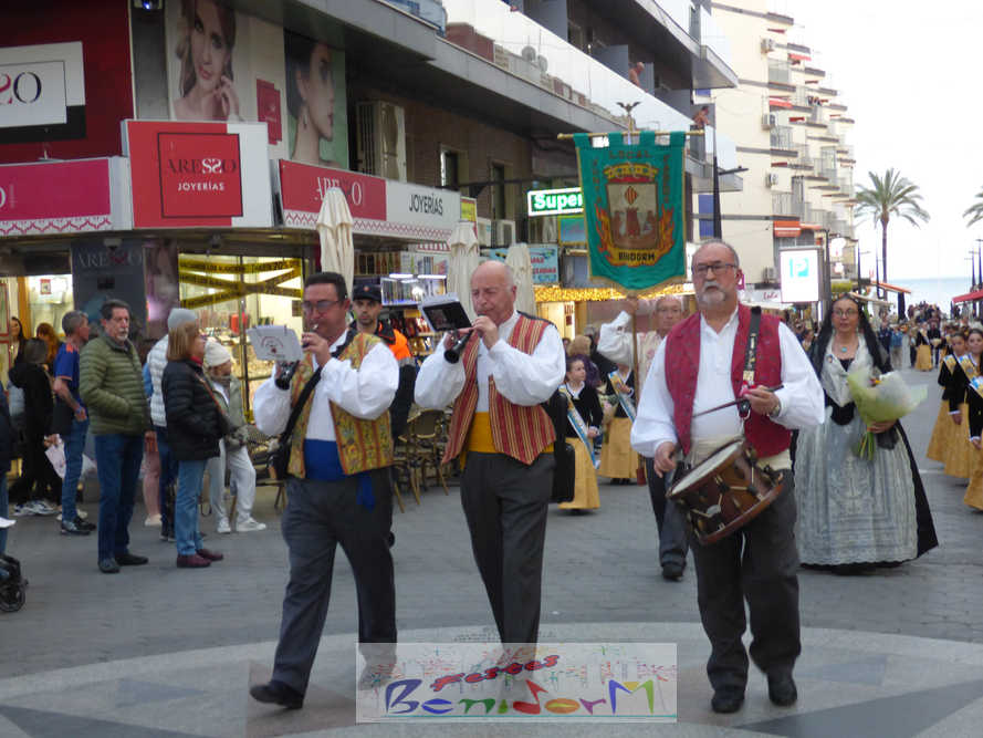 El estandarte de la Junta Local Fallera ha encabezado una comitiva en la que han desfilado, por orden de antigüedad, las fallas de Els Tolls, encabezada por su fallera mayor y su presidente, Teresa Peris y Wenceslao Peris; la Falla Rincón de Loix, con su fallera mayor infantil, Nahia Fernández, junto a su presidente infantil, Samuel Cortés, y su presidente, Javier Rico; y la Falla Benidorm Centro, que este año está representada por su fallera mayor infantil y presidente infantil, Thais Jiménez y Carlos de Torres, su fallera mayor, Jaira Rodríguez, y su presidente, Antonio de Torres, todos ellos acompañados por bandas de música interpretando pasodobles falleros y melodías de ‘xirimita’ y ‘tabalet’.