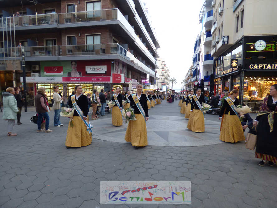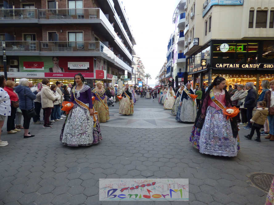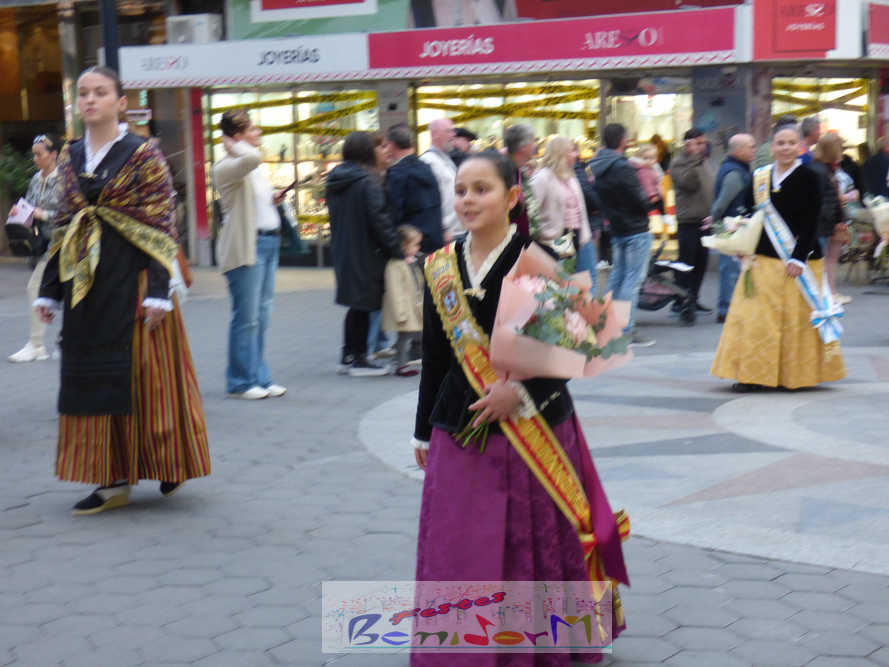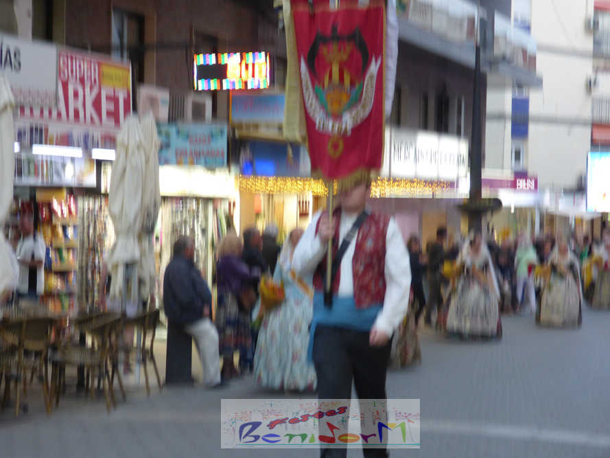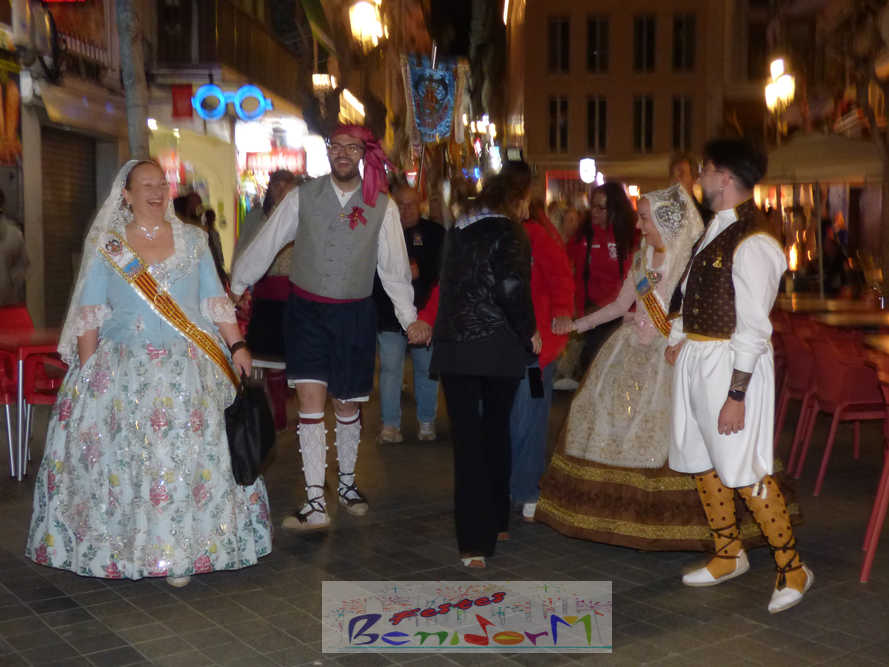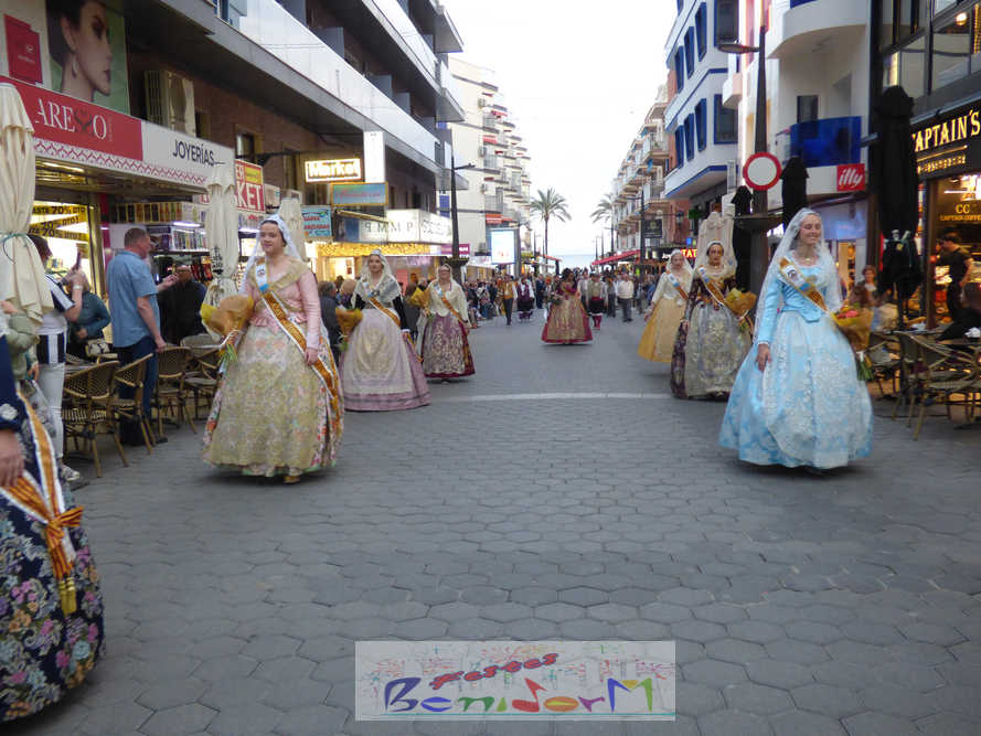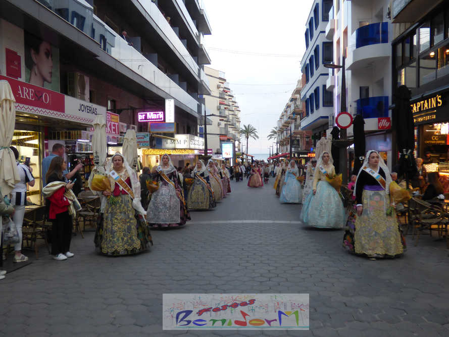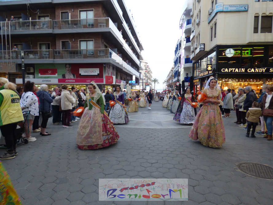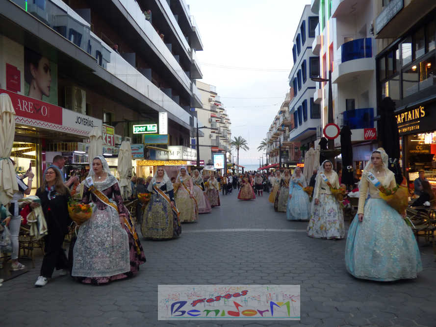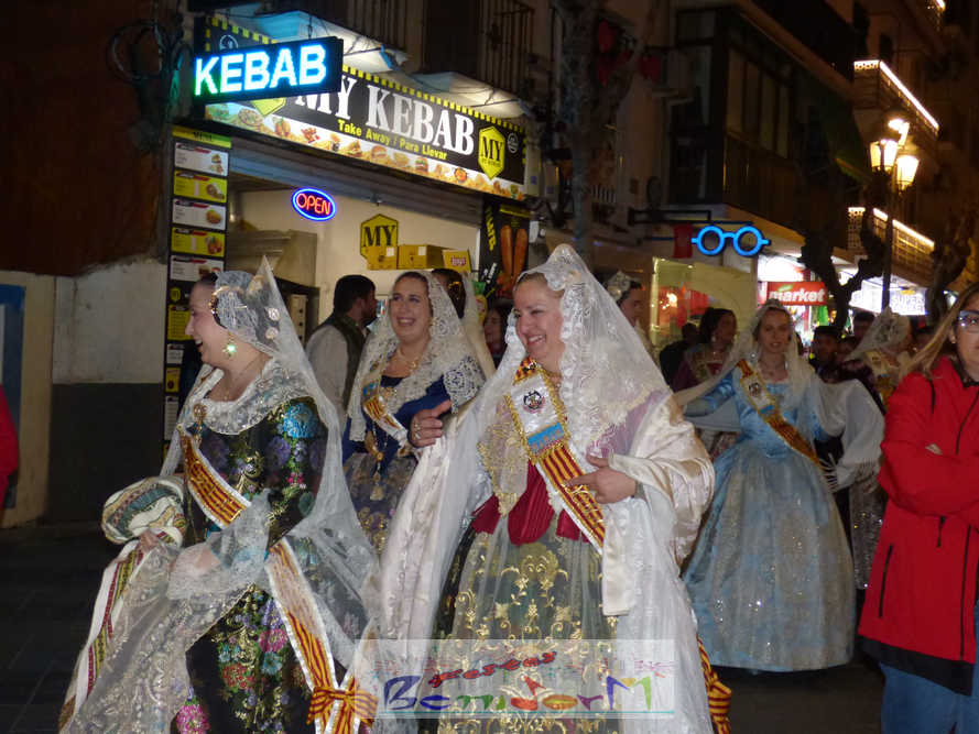 El estandarte de la Junta Local Fallera ha encabezado una comitiva en la que han desfilado, por orden de antigüedad, las fallas de Els Tolls, encabezada por su fallera mayor y su presidente, Teresa Peris y Wenceslao Peris; la Falla Rincón de Loix, con su fallera mayor infantil, Nahia Fernández, junto a su presidente infantil, Samuel Cortés, y su presidente, Javier Rico; y la Falla Benidorm Centro, que este año está representada por su fallera mayor infantil y presidente infantil, Thais Jiménez y Carlos de Torres, su fallera mayor, Jaira Rodríguez, y su presidente, Antonio de Torres, todos ellos acompañados por bandas de música interpretando pasodobles falleros y melodías de ‘xirimita’ y ‘tabalet’.