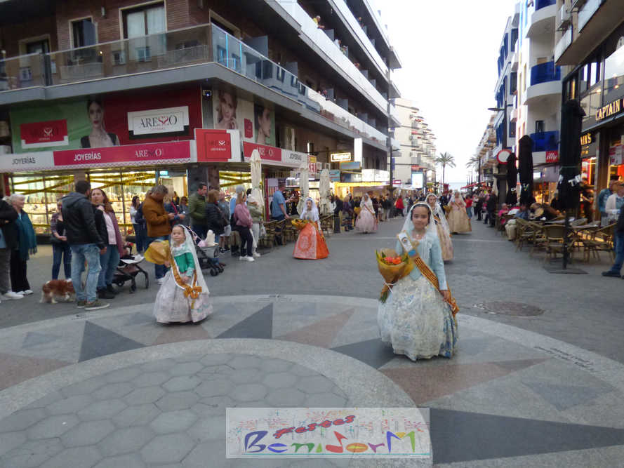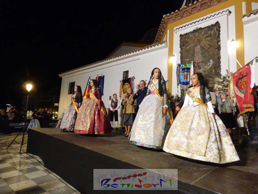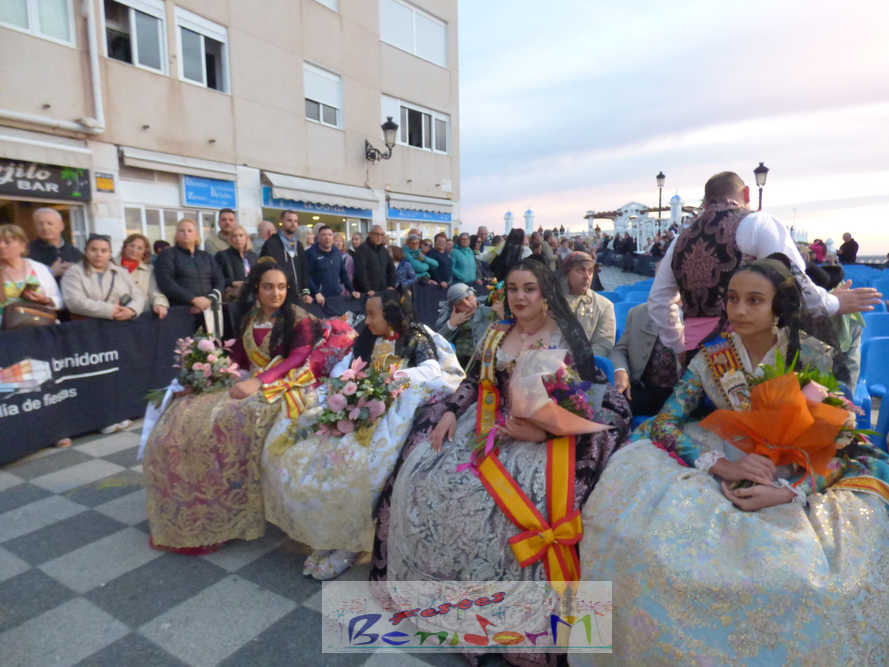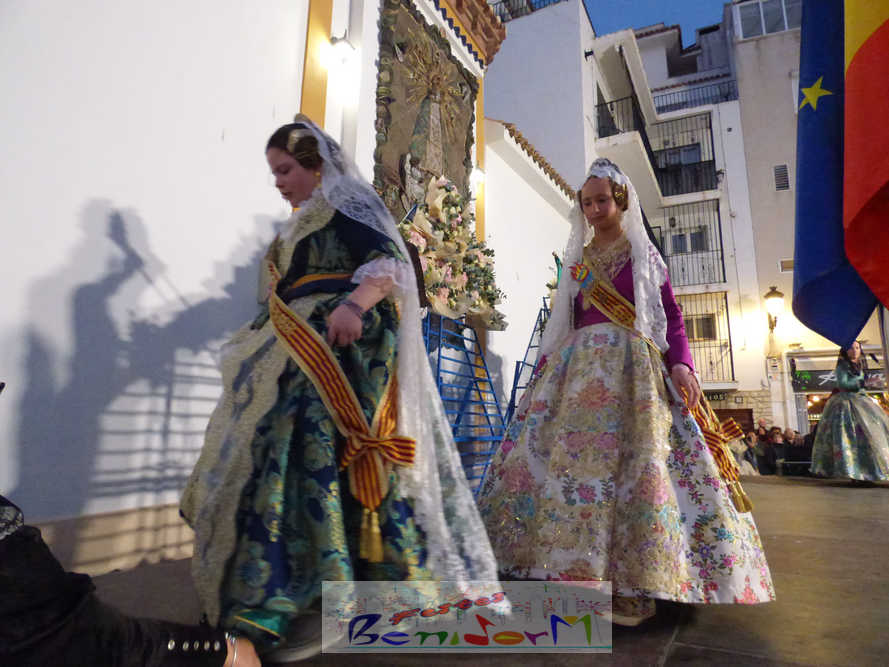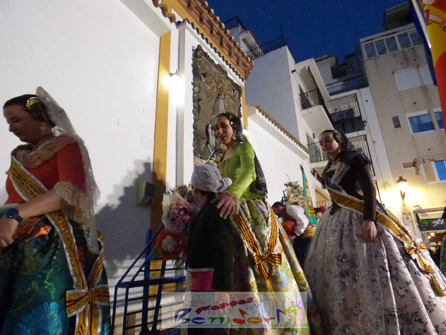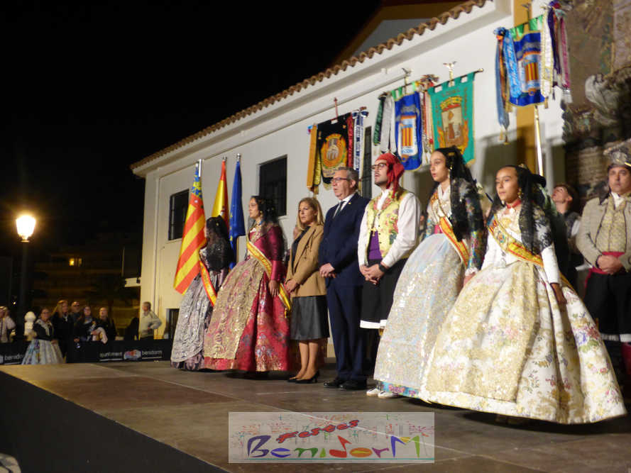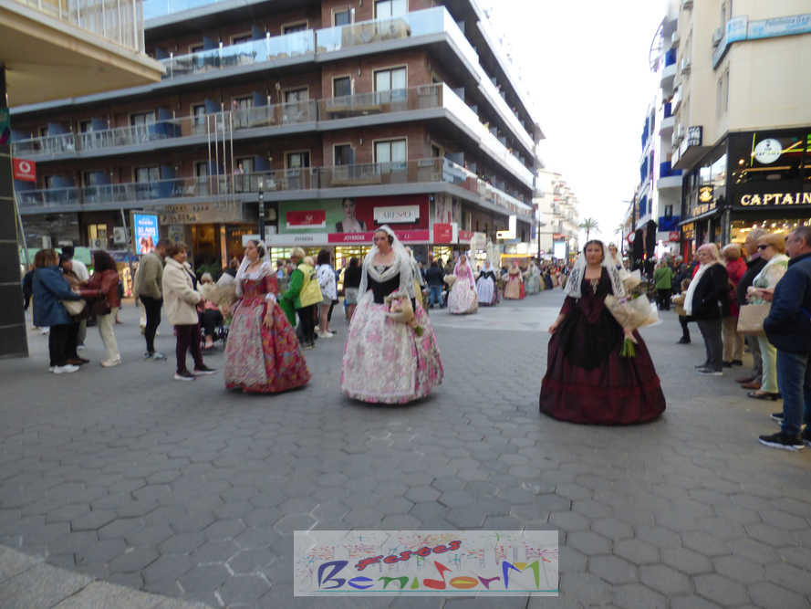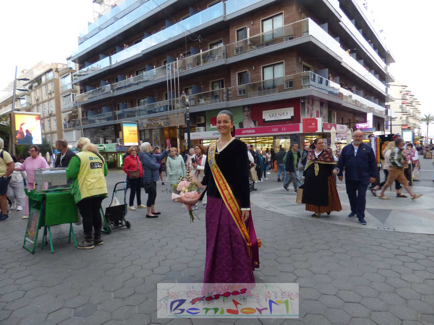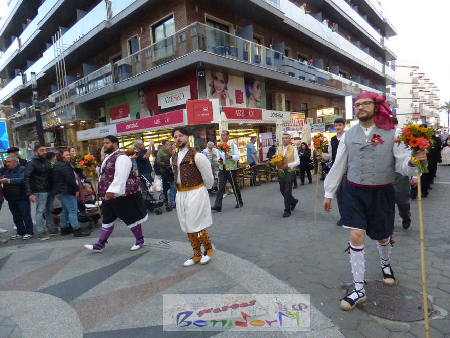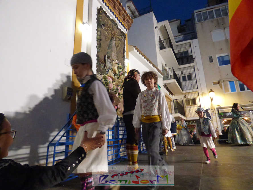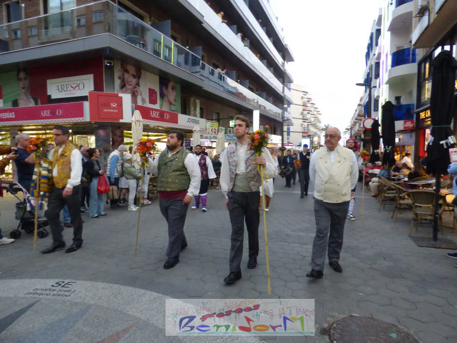 El estandarte de la Junta Local Fallera ha encabezado una comitiva en la que han desfilado, por orden de antigüedad, las fallas de Els Tolls, encabezada por su fallera mayor y su presidente, Teresa Peris y Wenceslao Peris; la Falla Rincón de Loix, con su fallera mayor infantil, Nahia Fernández, junto a su presidente infantil, Samuel Cortés, y su presidente, Javier Rico; y la Falla Benidorm Centro, que este año está representada por su fallera mayor infantil y presidente infantil, Thais Jiménez y Carlos de Torres, su fallera mayor, Jaira Rodríguez, y su presidente, Antonio de Torres, todos ellos acompañados por bandas de música interpretando pasodobles falleros y melodías de ‘xirimita’ y ‘tabalet’.