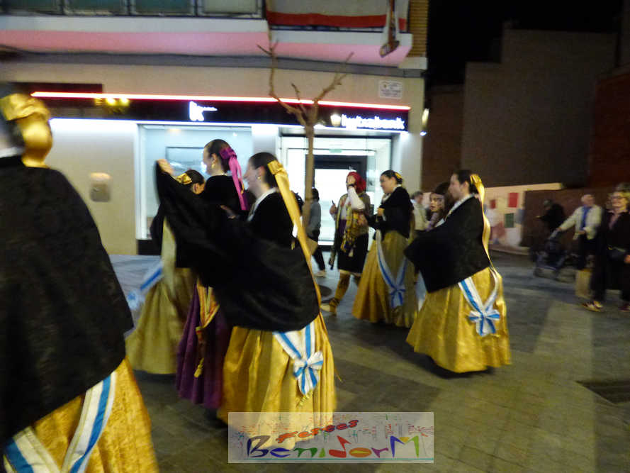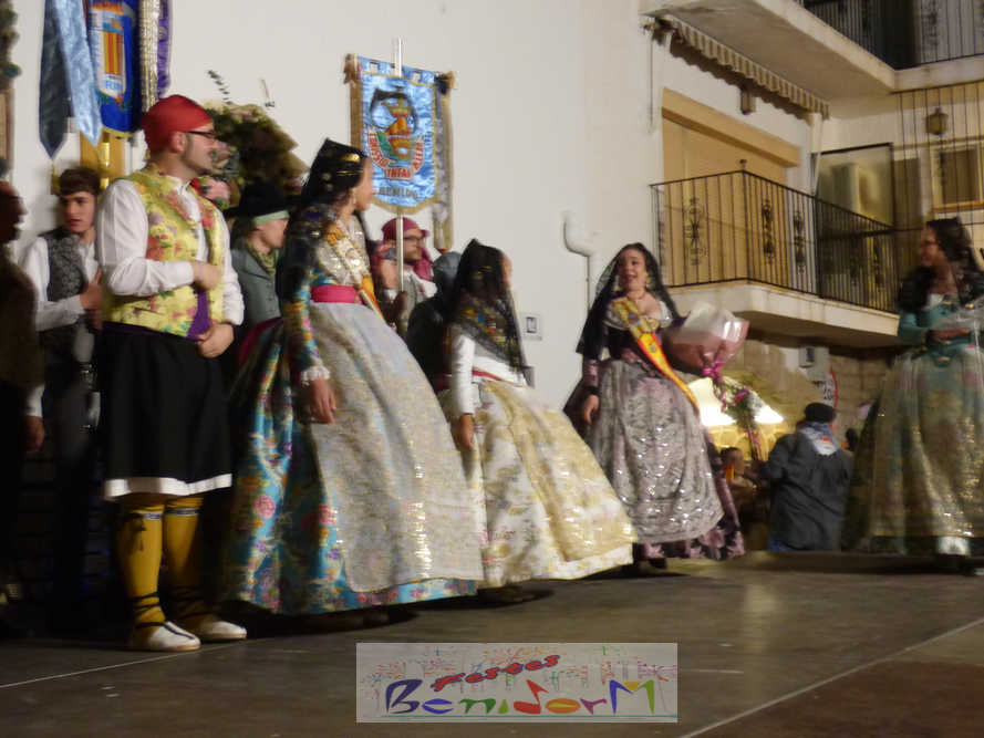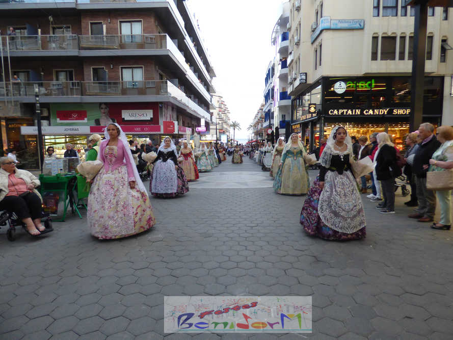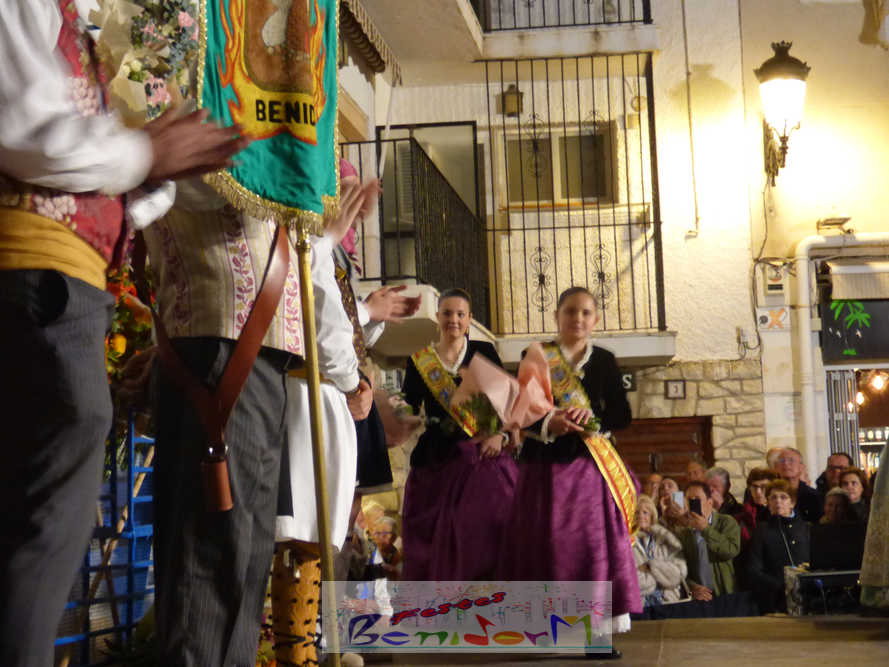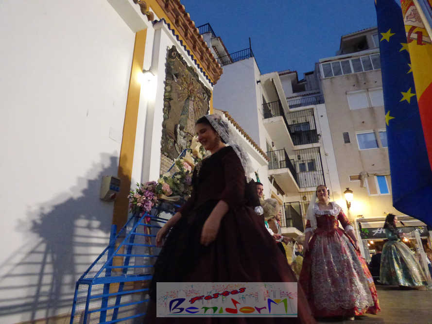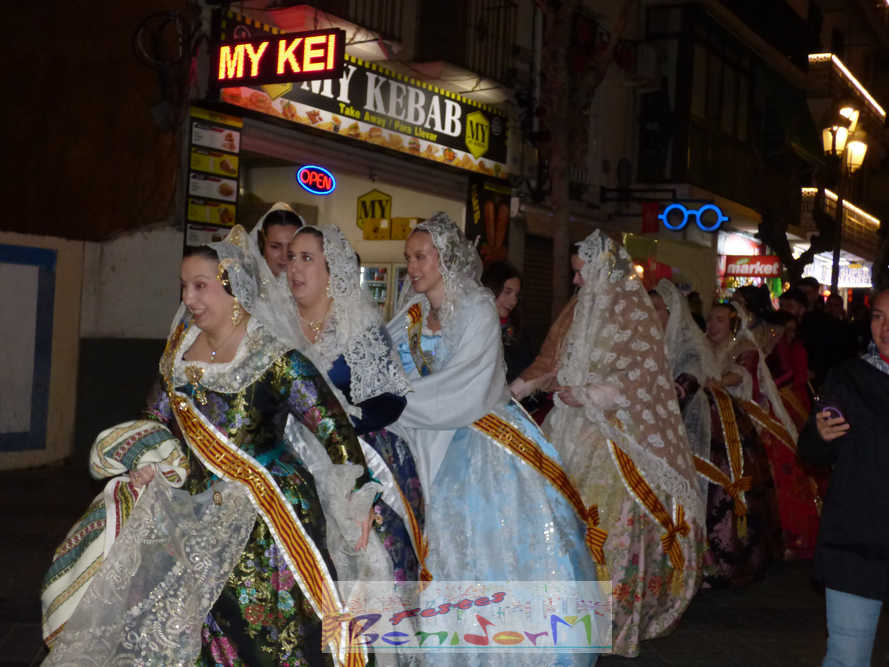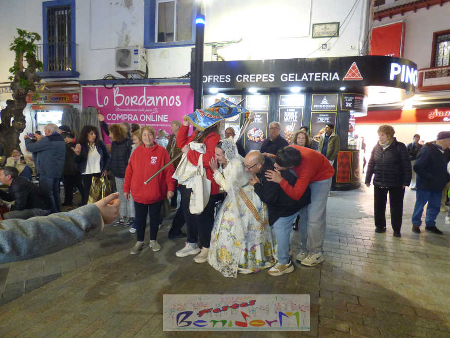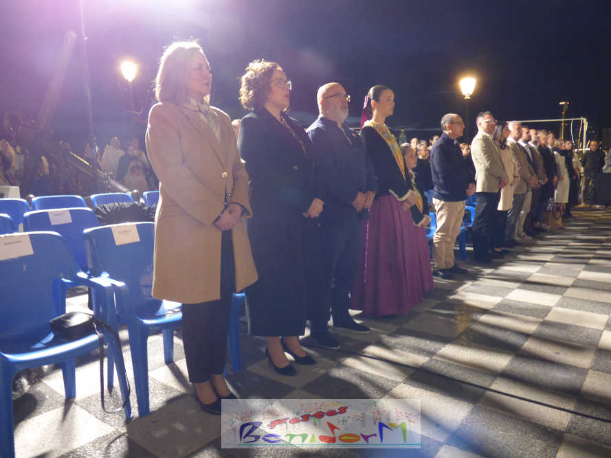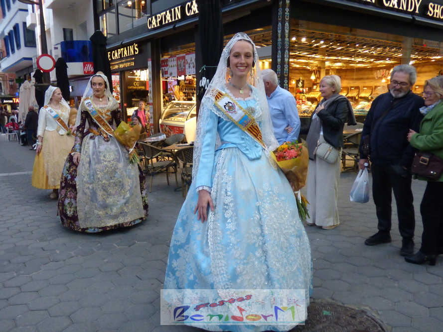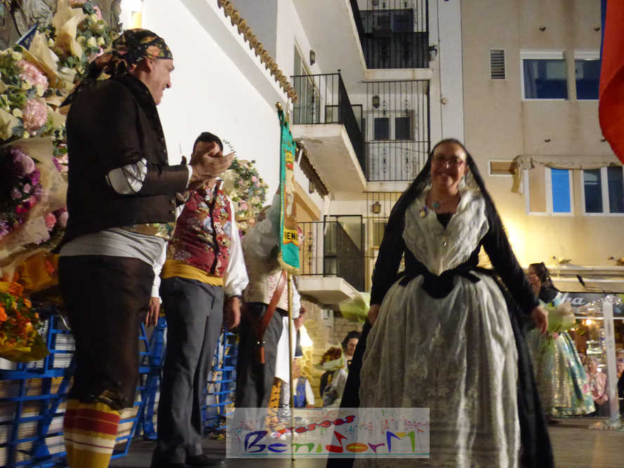 El estandarte de la Junta Local Fallera ha encabezado una comitiva en la que han desfilado, por orden de antigüedad, las fallas de Els Tolls, encabezada por su fallera mayor y su presidente, Teresa Peris y Wenceslao Peris; la Falla Rincón de Loix, con su fallera mayor infantil, Nahia Fernández, junto a su presidente infantil, Samuel Cortés, y su presidente, Javier Rico; y la Falla Benidorm Centro, que este año está representada por su fallera mayor infantil y presidente infantil, Thais Jiménez y Carlos de Torres, su fallera mayor, Jaira Rodríguez, y su presidente, Antonio de Torres, todos ellos acompañados por bandas de música interpretando pasodobles falleros y melodías de ‘xirimita’ y ‘tabalet’.