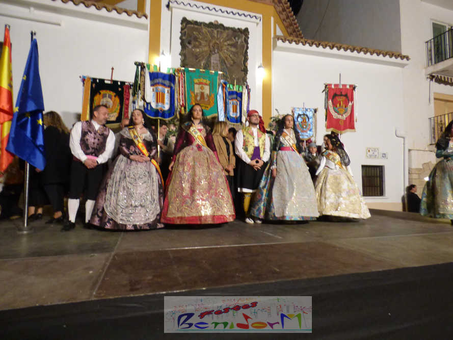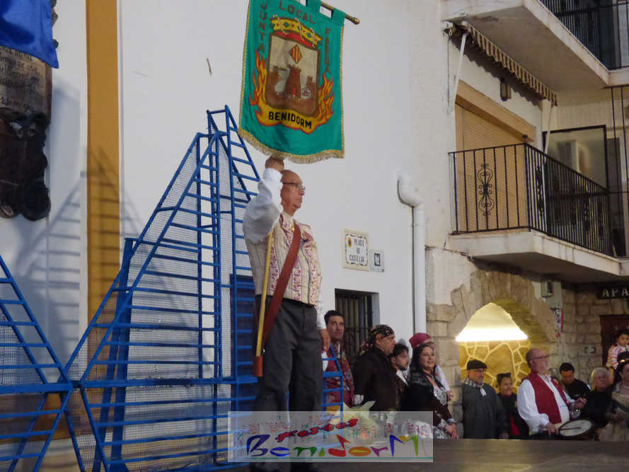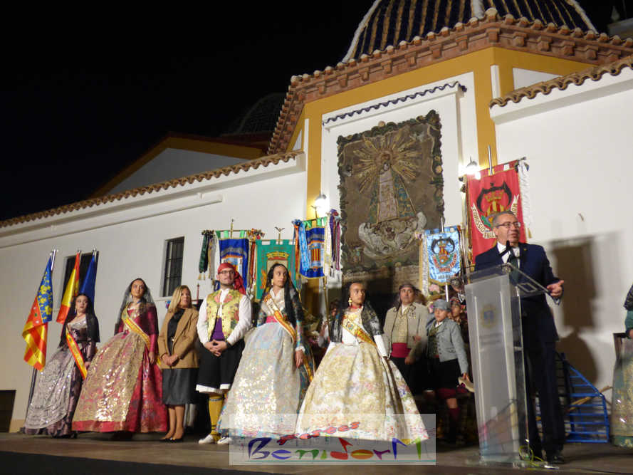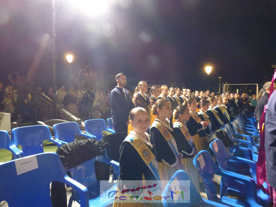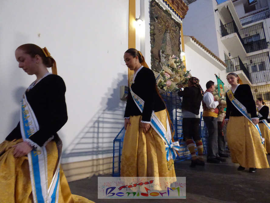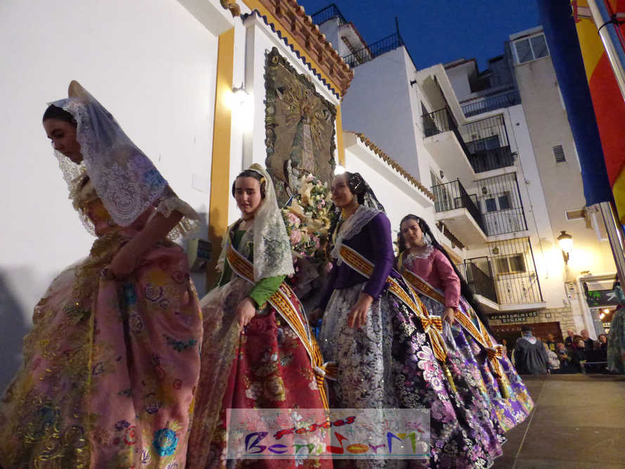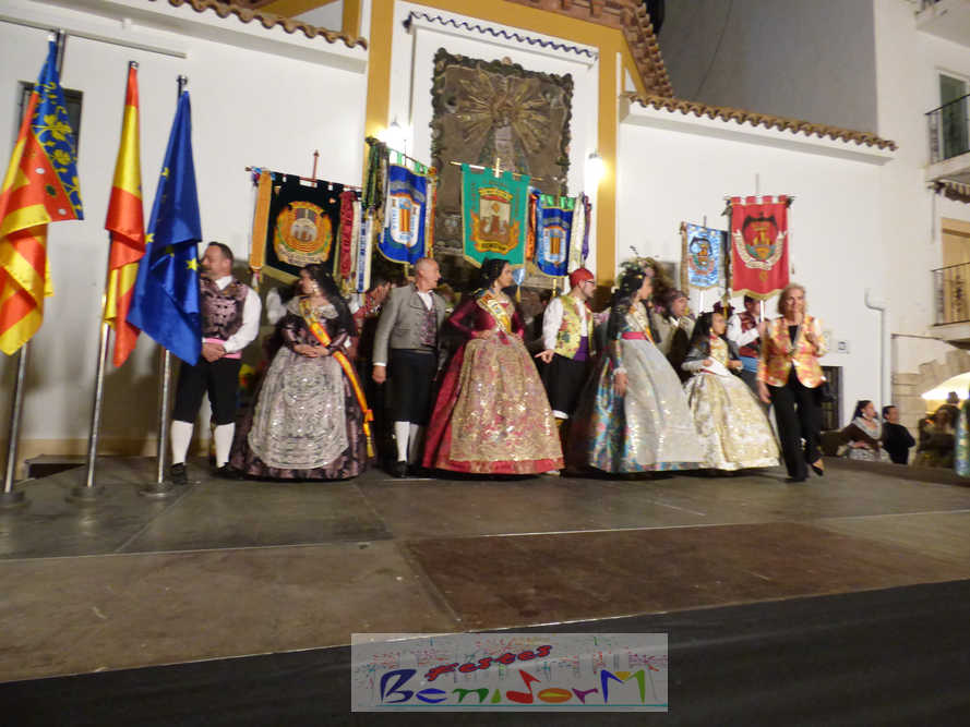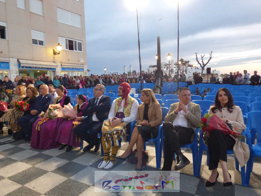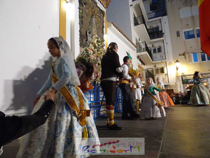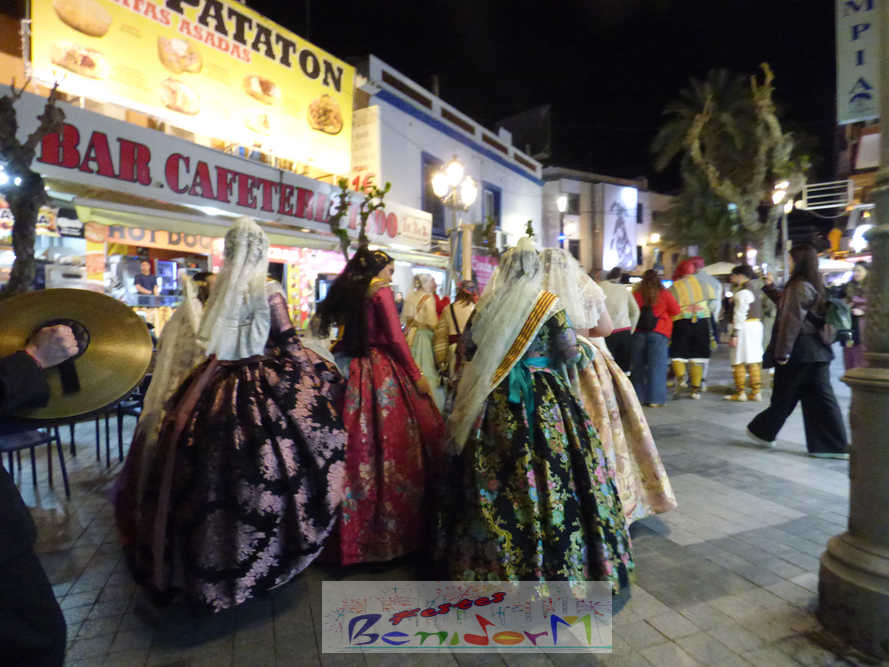 El estandarte de la Junta Local Fallera ha encabezado una comitiva en la que han desfilado, por orden de antigüedad, las fallas de Els Tolls, encabezada por su fallera mayor y su presidente, Teresa Peris y Wenceslao Peris; la Falla Rincón de Loix, con su fallera mayor infantil, Nahia Fernández, junto a su presidente infantil, Samuel Cortés, y su presidente, Javier Rico; y la Falla Benidorm Centro, que este año está representada por su fallera mayor infantil y presidente infantil, Thais Jiménez y Carlos de Torres, su fallera mayor, Jaira Rodríguez, y su presidente, Antonio de Torres, todos ellos acompañados por bandas de música interpretando pasodobles falleros y melodías de ‘xirimita’ y ‘tabalet’.