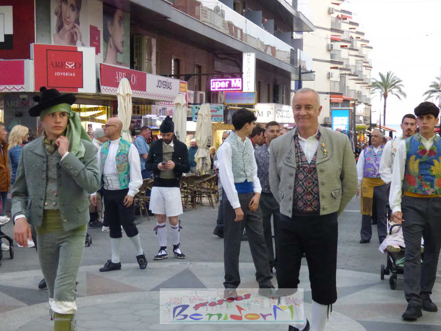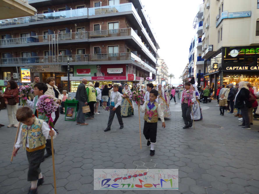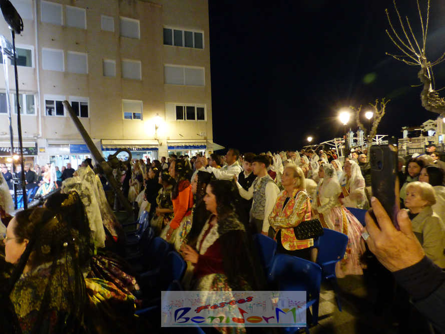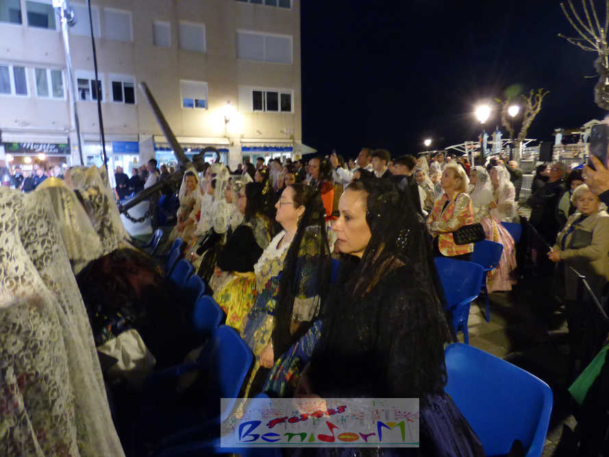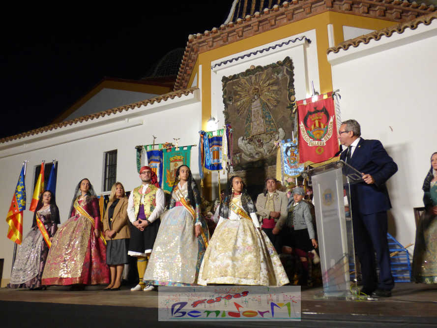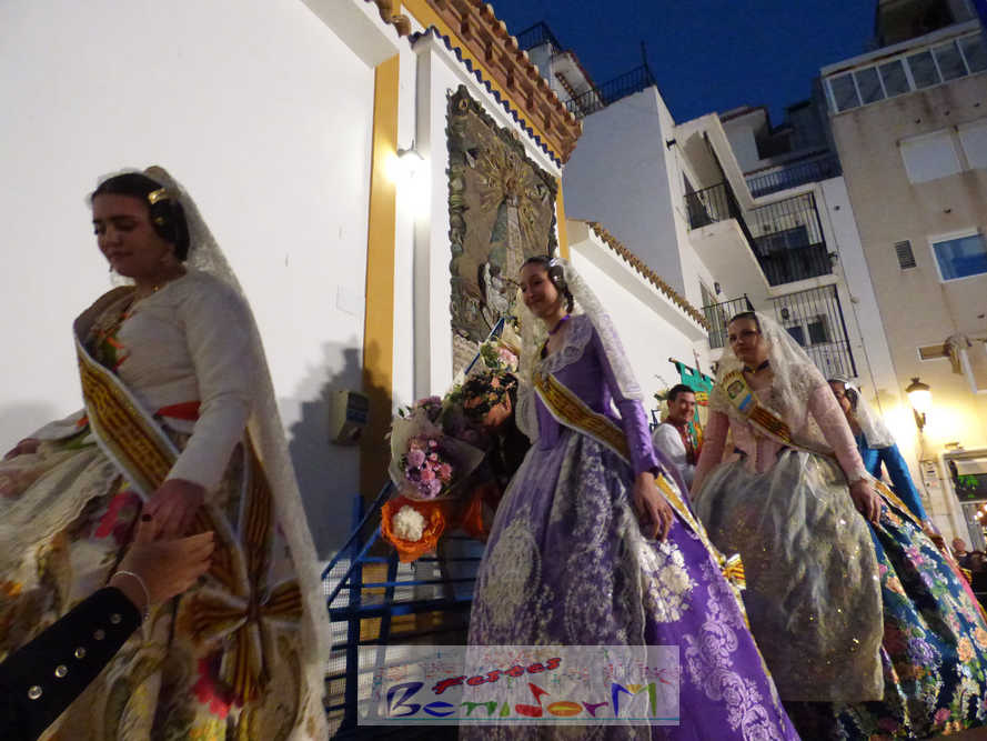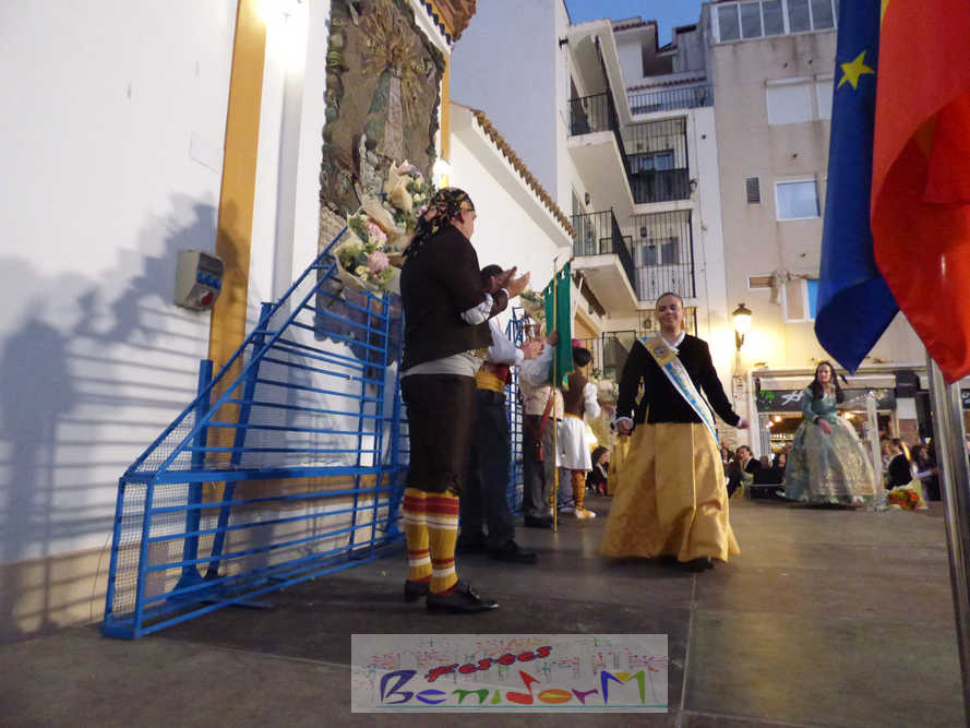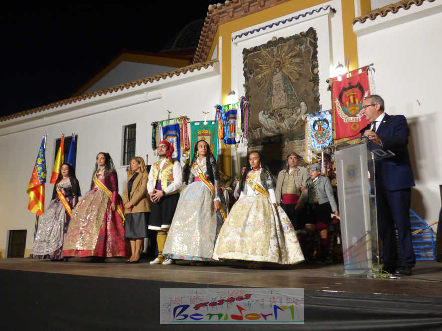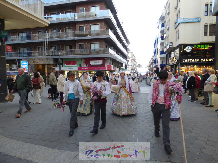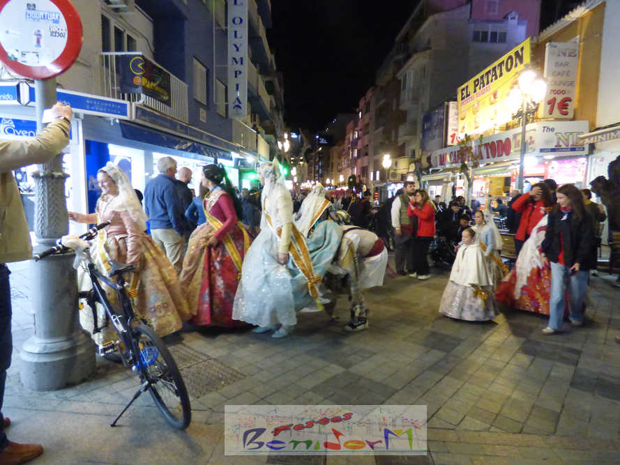 El estandarte de la Junta Local Fallera ha encabezado una comitiva en la que han desfilado, por orden de antigüedad, las fallas de Els Tolls, encabezada por su fallera mayor y su presidente, Teresa Peris y Wenceslao Peris; la Falla Rincón de Loix, con su fallera mayor infantil, Nahia Fernández, junto a su presidente infantil, Samuel Cortés, y su presidente, Javier Rico; y la Falla Benidorm Centro, que este año está representada por su fallera mayor infantil y presidente infantil, Thais Jiménez y Carlos de Torres, su fallera mayor, Jaira Rodríguez, y su presidente, Antonio de Torres, todos ellos acompañados por bandas de música interpretando pasodobles falleros y melodías de ‘xirimita’ y ‘tabalet’.