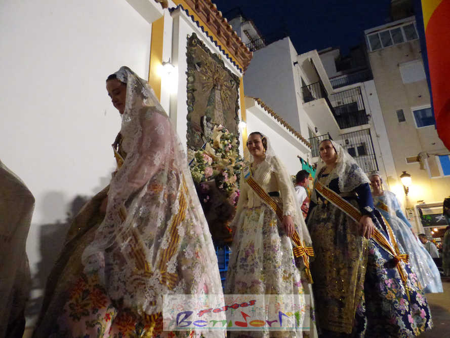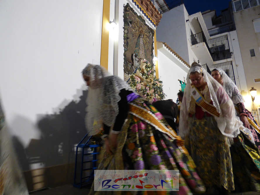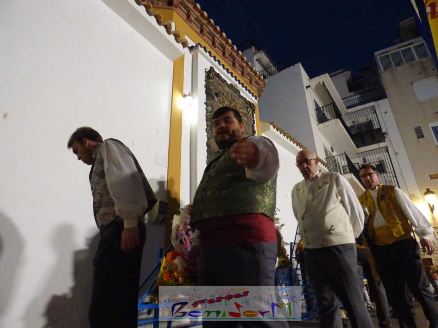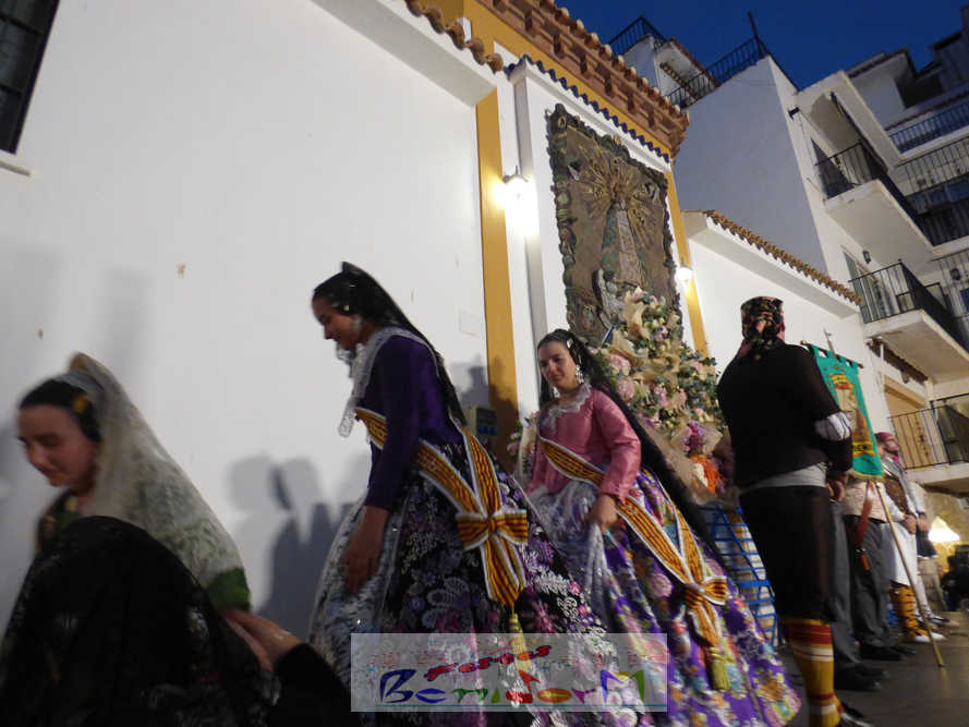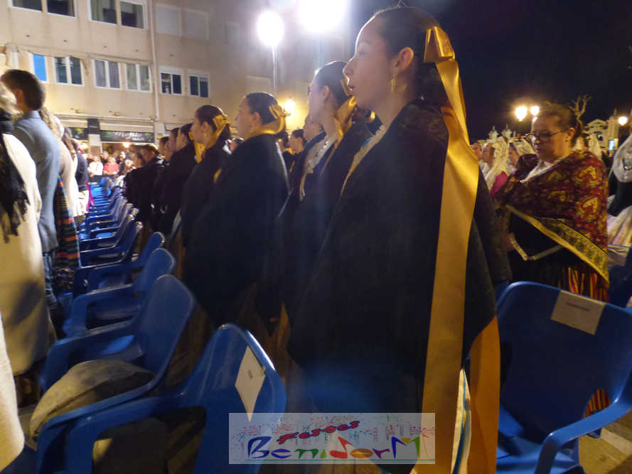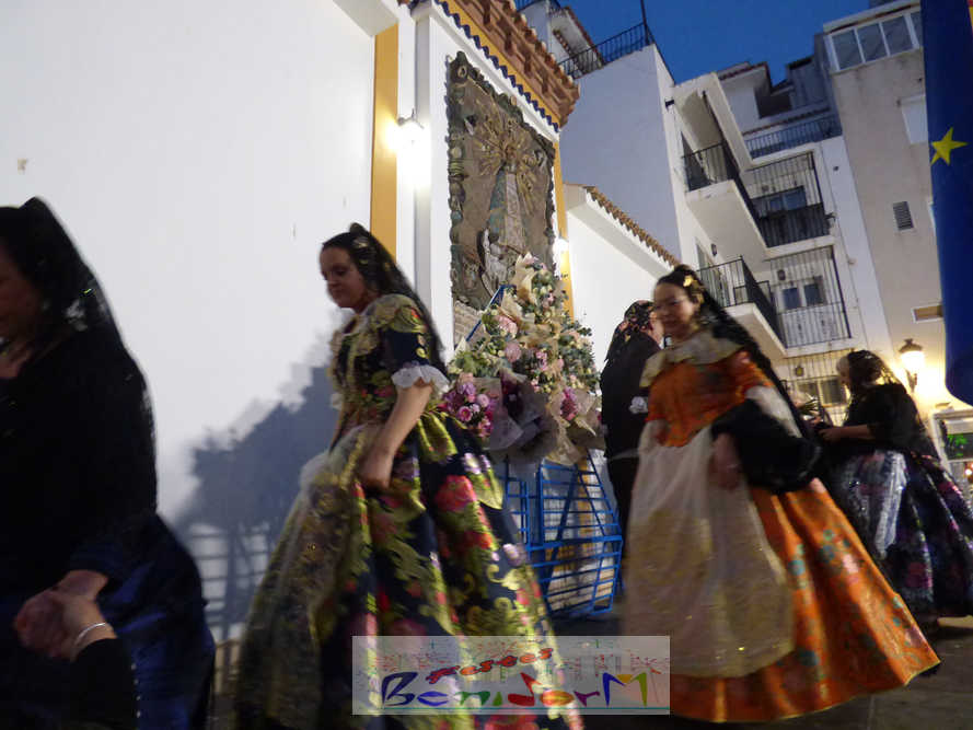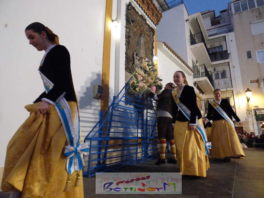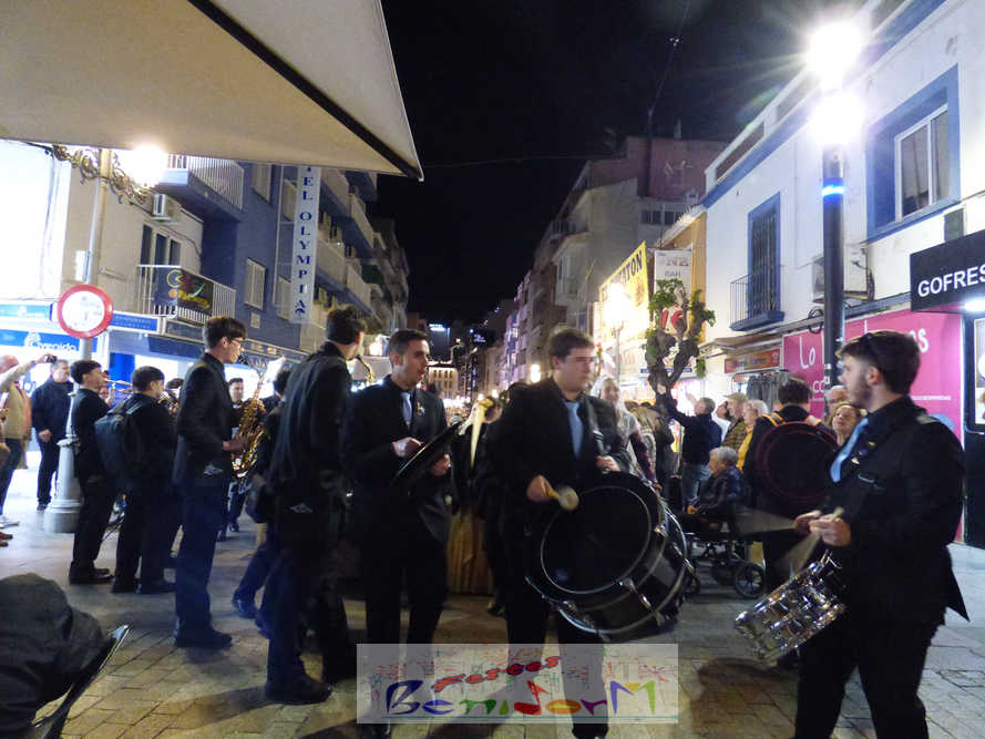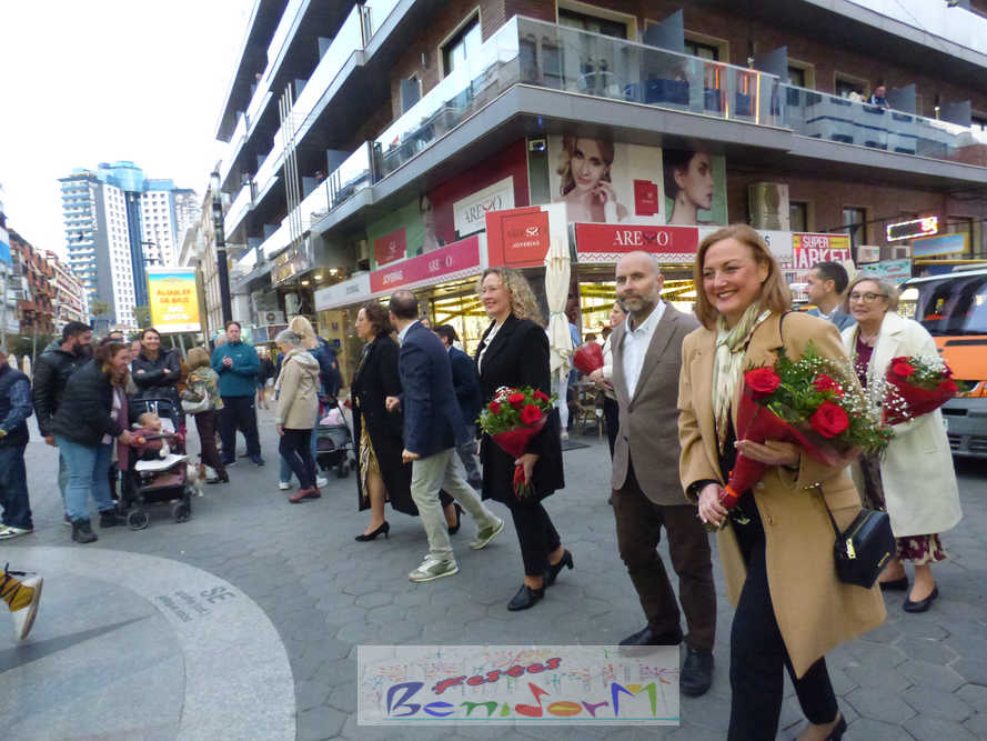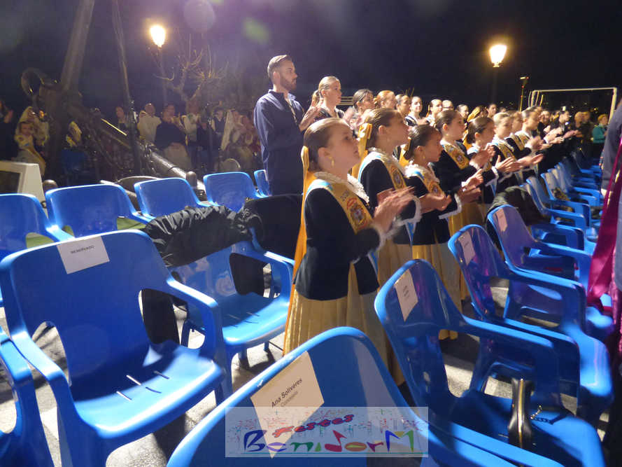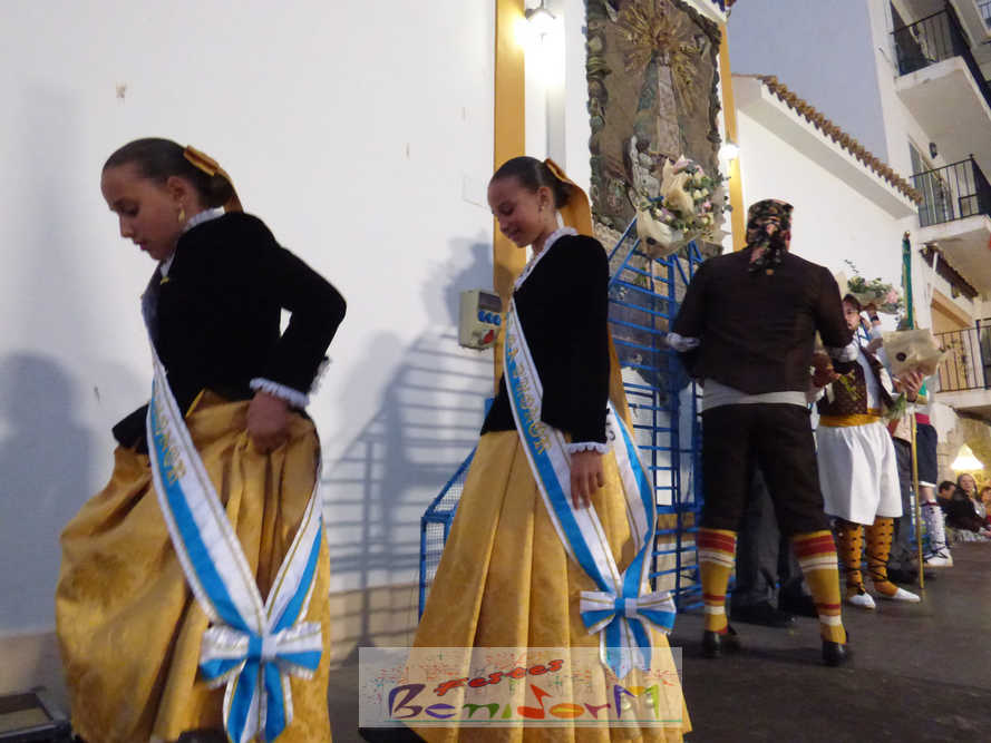 El estandarte de la Junta Local Fallera ha encabezado una comitiva en la que han desfilado, por orden de antigüedad, las fallas de Els Tolls, encabezada por su fallera mayor y su presidente, Teresa Peris y Wenceslao Peris; la Falla Rincón de Loix, con su fallera mayor infantil, Nahia Fernández, junto a su presidente infantil, Samuel Cortés, y su presidente, Javier Rico; y la Falla Benidorm Centro, que este año está representada por su fallera mayor infantil y presidente infantil, Thais Jiménez y Carlos de Torres, su fallera mayor, Jaira Rodríguez, y su presidente, Antonio de Torres, todos ellos acompañados por bandas de música interpretando pasodobles falleros y melodías de ‘xirimita’ y ‘tabalet’.