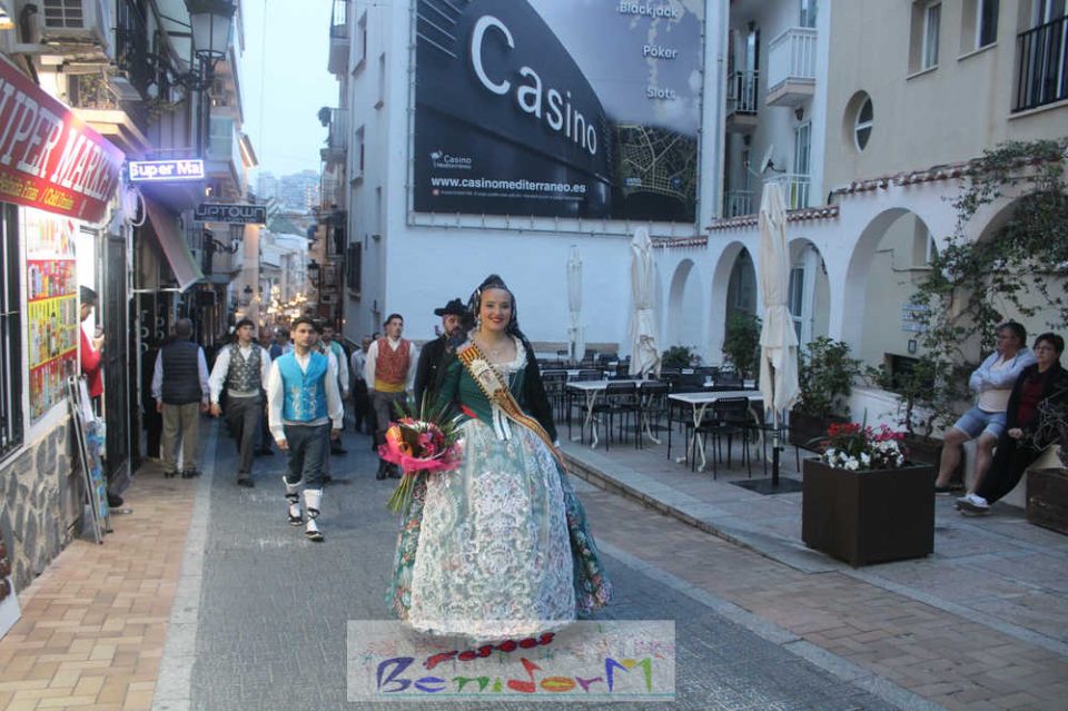 Encabezaba la comitiva el estandarte de la Junta Local Fallera, tras el cual desfilaron las reinas de les Festes Majors Patronals, Valentina Almodóbar y Laia Zamora, acompañadas por sus damas. En el pasacalles marchaban también la presidenta de la Junta Local Fallera, Esther García Durán; y las falleras mayor e infantil de las Fallas Rincón de Loix, Benidorm Centro y Els Tolls, Ariadna Orgilés, Olaya García, Aitana Torres, Alejandra Tomás y Noemí Alcántara, junto a miembros de las tres comisiones, todos ellos acompañados por pasodobles falleros y melodías de ‘xirimita’ y ‘tabalet’.