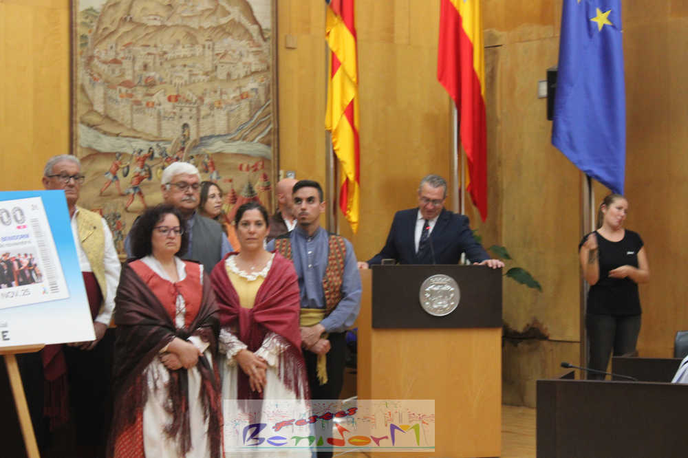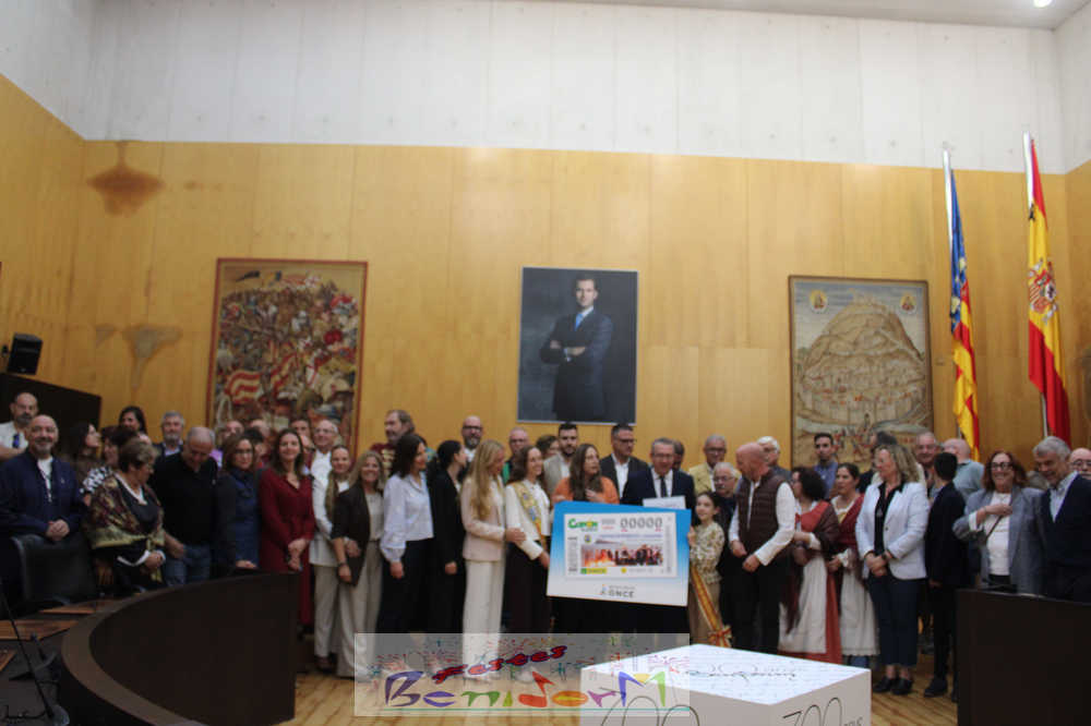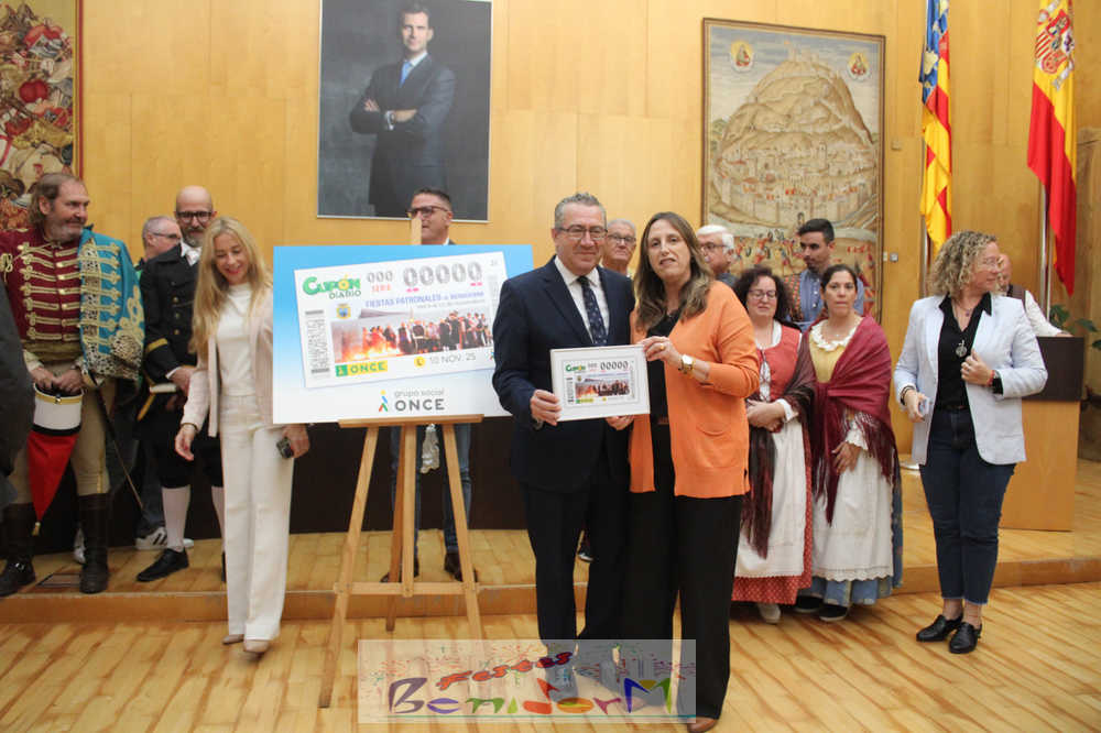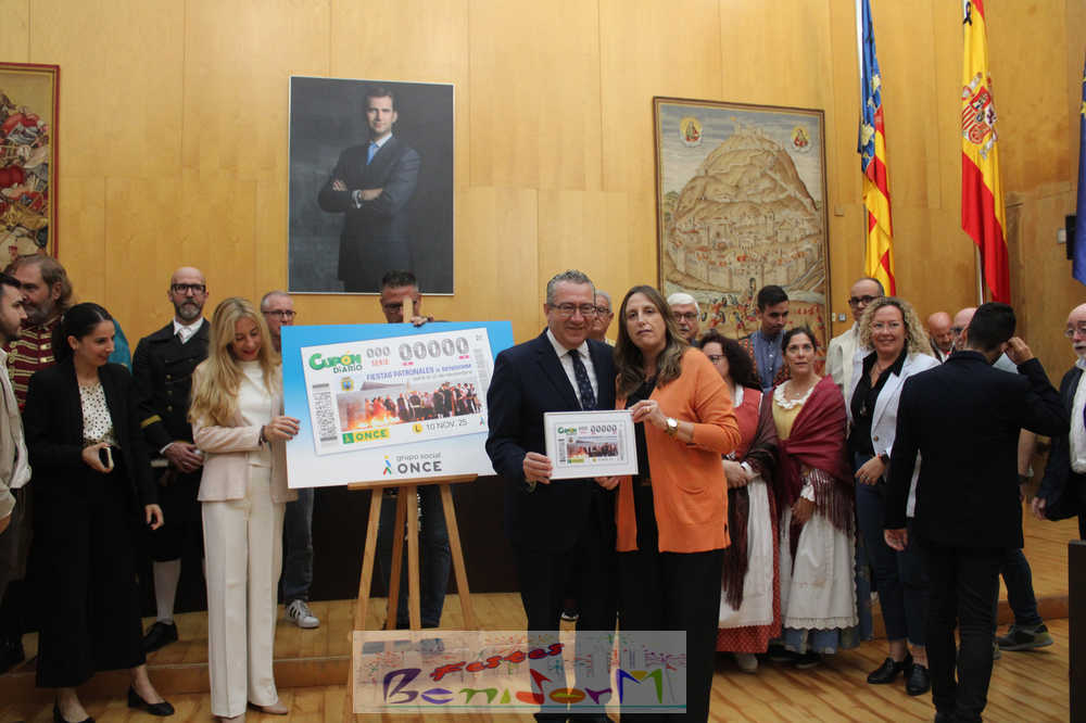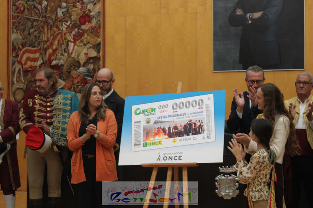 Las Festes Majors Patronals de Benidorm son las protagonistas de un cupón especial emitido por la Organización Nacional de Ciegos de España, ONCE, que se sorteará el próximo el lunes 10 de noviembre, en plena celebración de los días grandes de la ciudad. El cupón se ha presentado públicamente este miércoles en el Salón de Plenos municipal, en un acto en el que han participado el alcalde de la ciudad, Toni Pérez; la directora de la ONCE en Alicante, Estela Medina; el director en la Marina Baixa, Vicente Vázquez; y numerosos miembros de la Corporación municipal, representantes de la ONCE así como de entidades festeras, sociales y culturales del municipio. Entre ellas, las reinas de las Festes Majors Patronals 2025, Paula Pascual Sánchez y Aitana Pérez Gutiérrez.