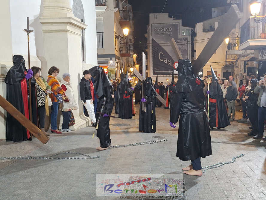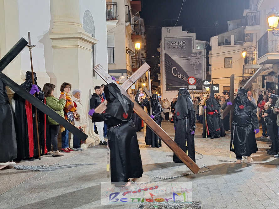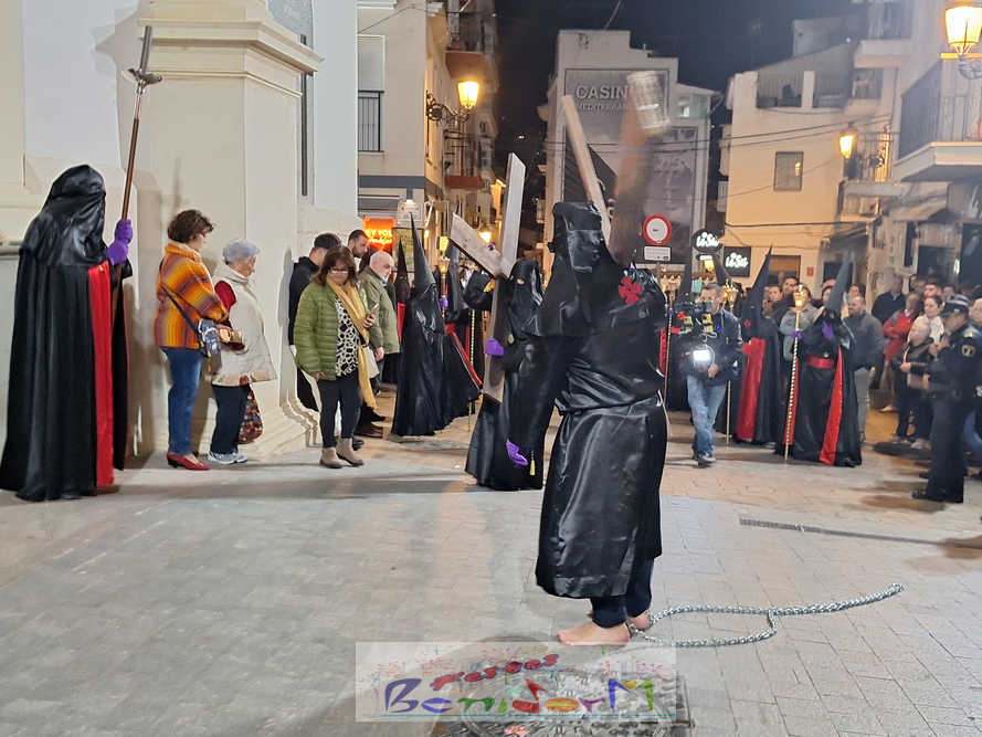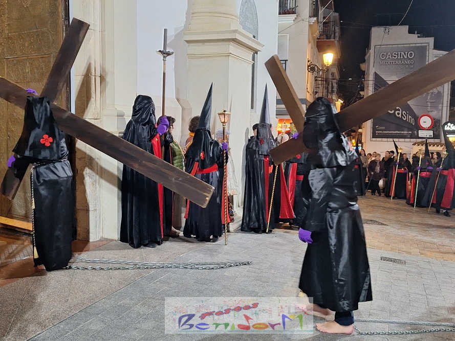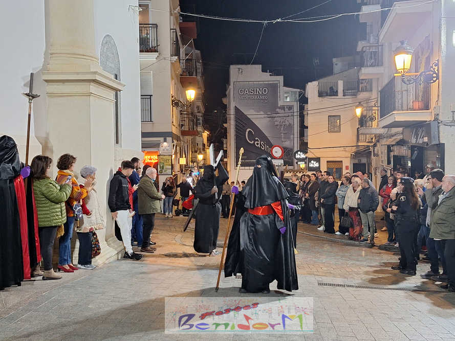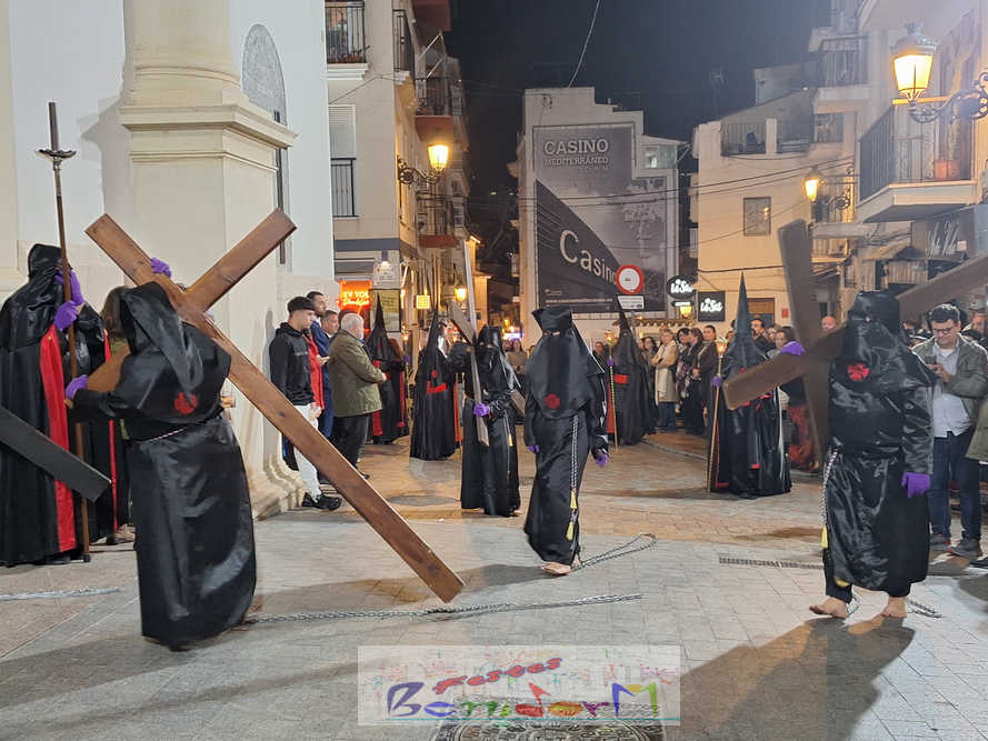 La Colla de Xirimiters de la Marina abría un desfile en el que han participado cofrades de todas las edades y en el que los niños han tenido especial protagonismo al representar escenas de la Pasión de Cristo. Han destacado también penitentes con el rostro cubierto arrastrando cruces y pesadas cadenas y, tras ellos, la imagen del Nazareno y miembros del Parque de Bomberos -que desde el año pasado es cuerpo cofrade de honor-, ‘manolas’ y vecinos a título individual. Cerraba la marcha la Societat MusicaL l’Illa de Benidorm.