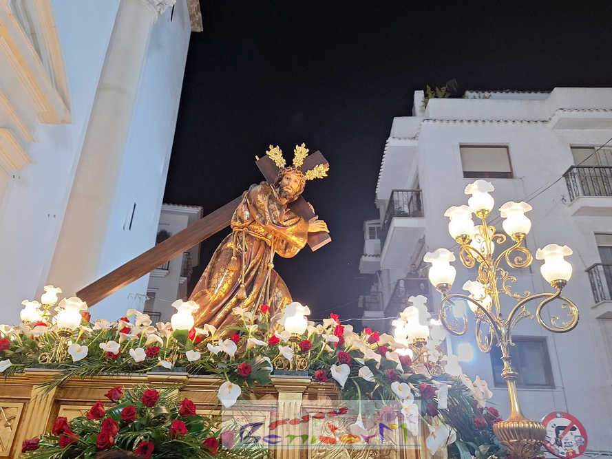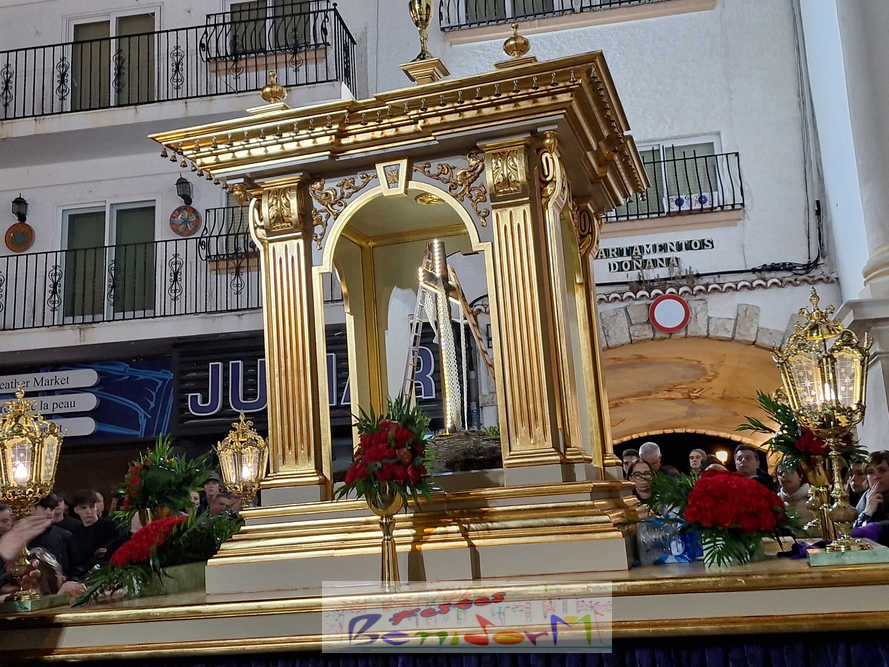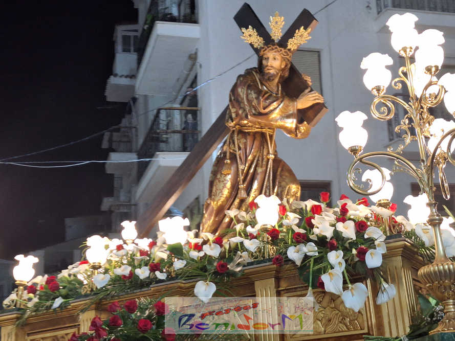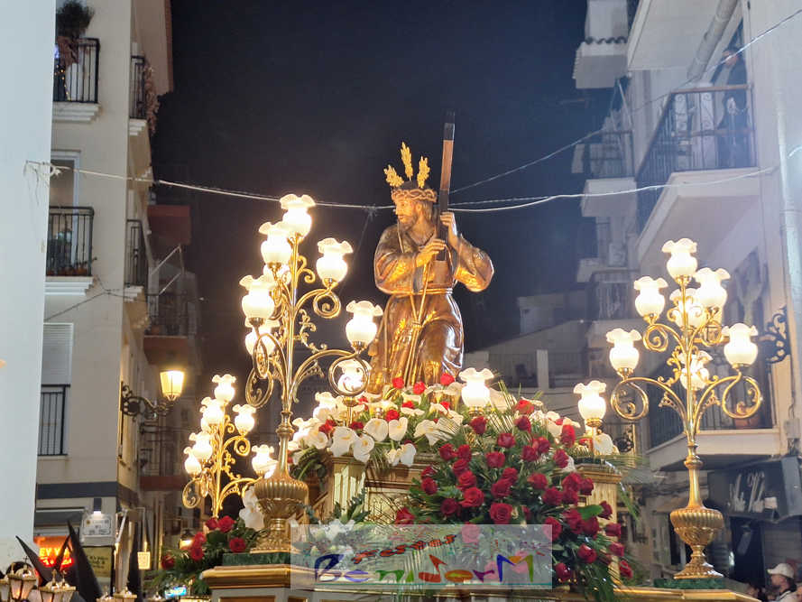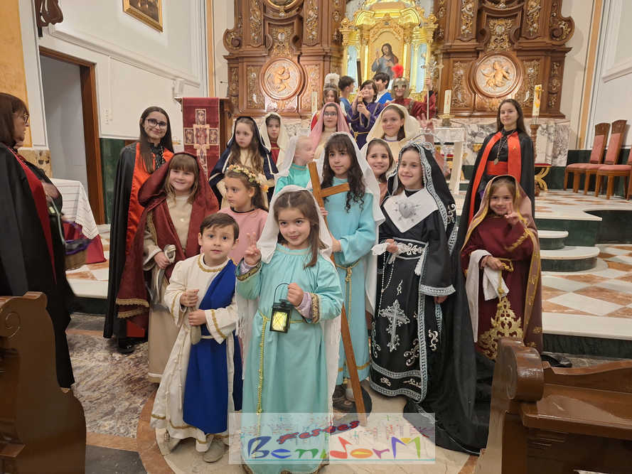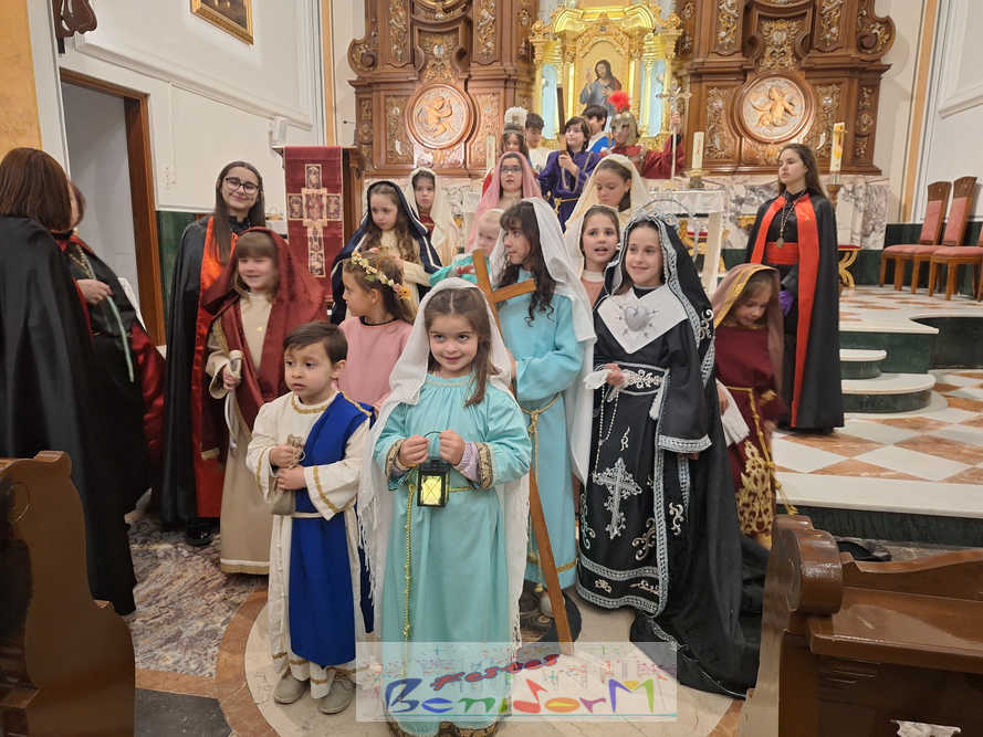 La Colla de Xirimiters de la Marina abría un desfile en el que han participado cofrades de todas las edades y en el que los niños han tenido especial protagonismo al representar escenas de la Pasión de Cristo. Han destacado también penitentes con el rostro cubierto arrastrando cruces y pesadas cadenas y, tras ellos, la imagen del Nazareno y miembros del Parque de Bomberos -que desde el año pasado es cuerpo cofrade de honor-, ‘manolas’ y vecinos a título individual. Cerraba la marcha la Societat MusicaL l’Illa de Benidorm.
