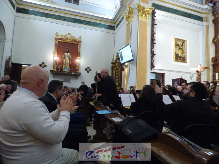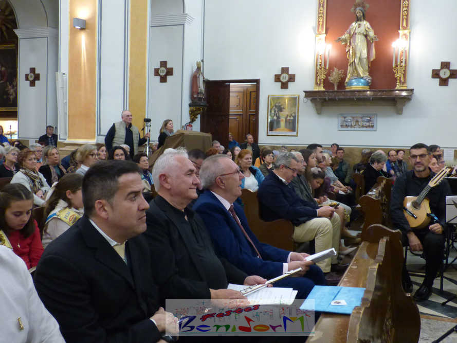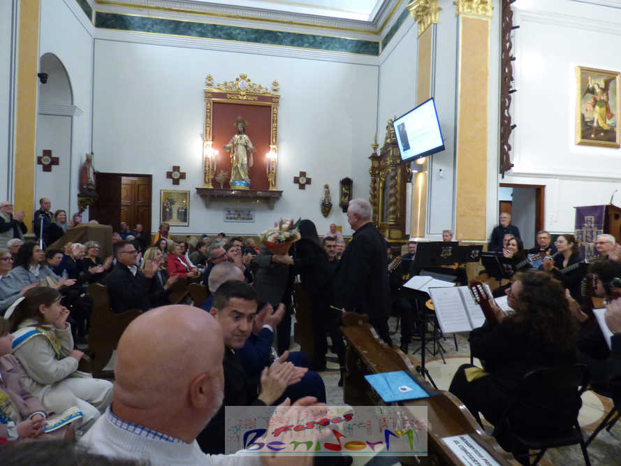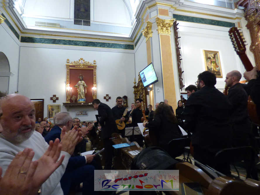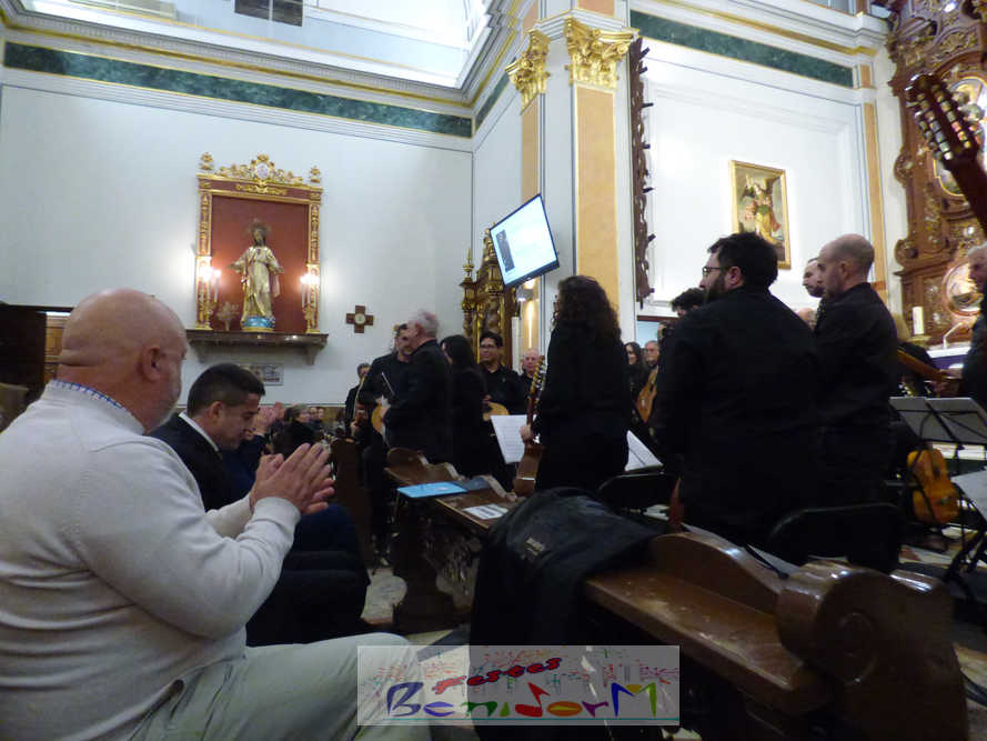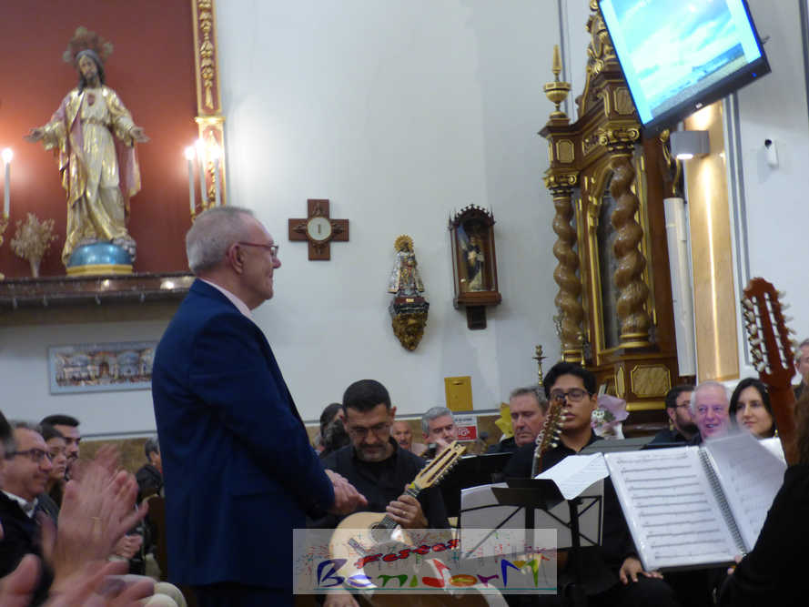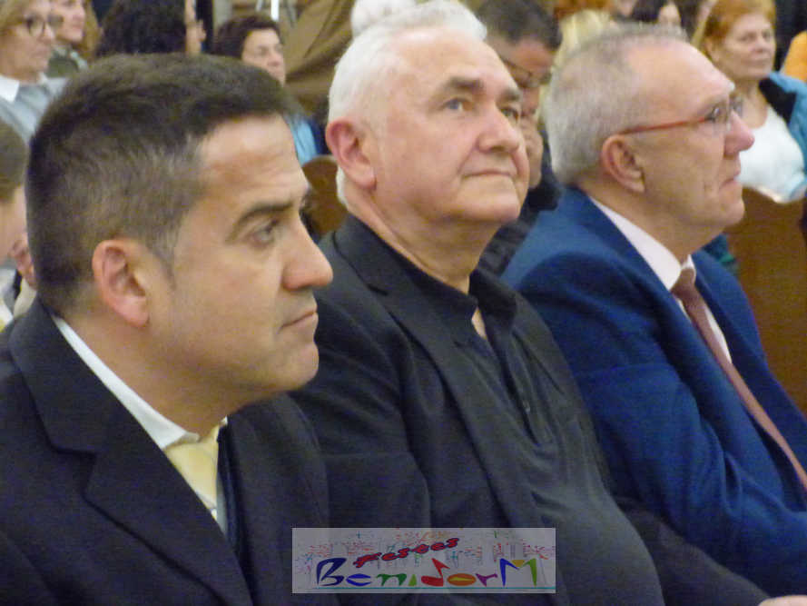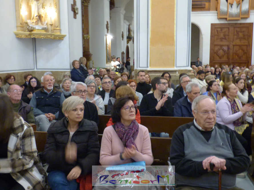 A las ocho de la tarde, el templo lleno a rebosar, ha dado la bienvenida a los integrantes de la formación musical, nombrados uno a uno desde megafonía. El alcalde de Benidorm, Toni Pérez; los concejales de Cultura y Fiestas, Jaime Jesús Pérez y Mariló Cebreros, otros miembros de la corporación municipal y el diputado autonómico, José Ramón González de Zárate, han conformado una representación institucional que, con su presencia, han mostrado su apoyo a la institución y a su presidente, Francisco Llorens, ‘Paco Rosera’, en su concierto homenaje.