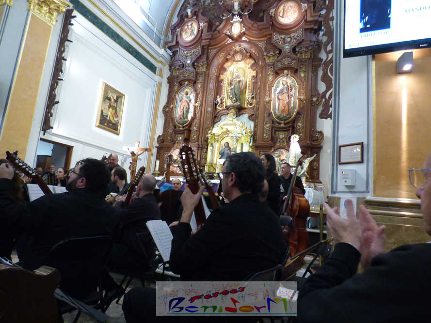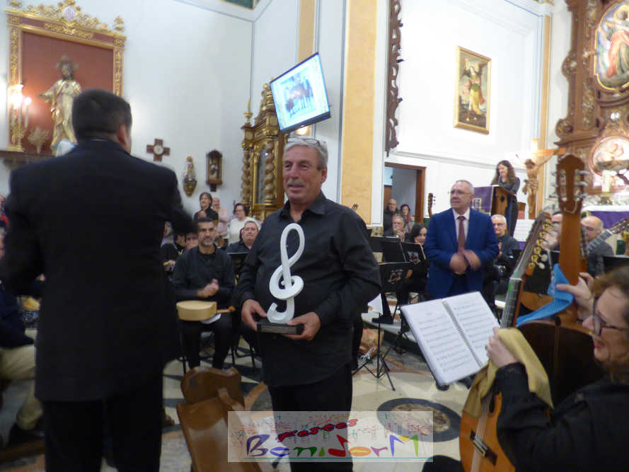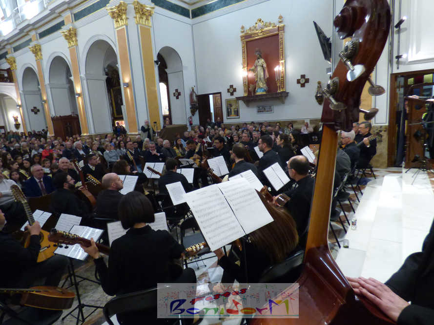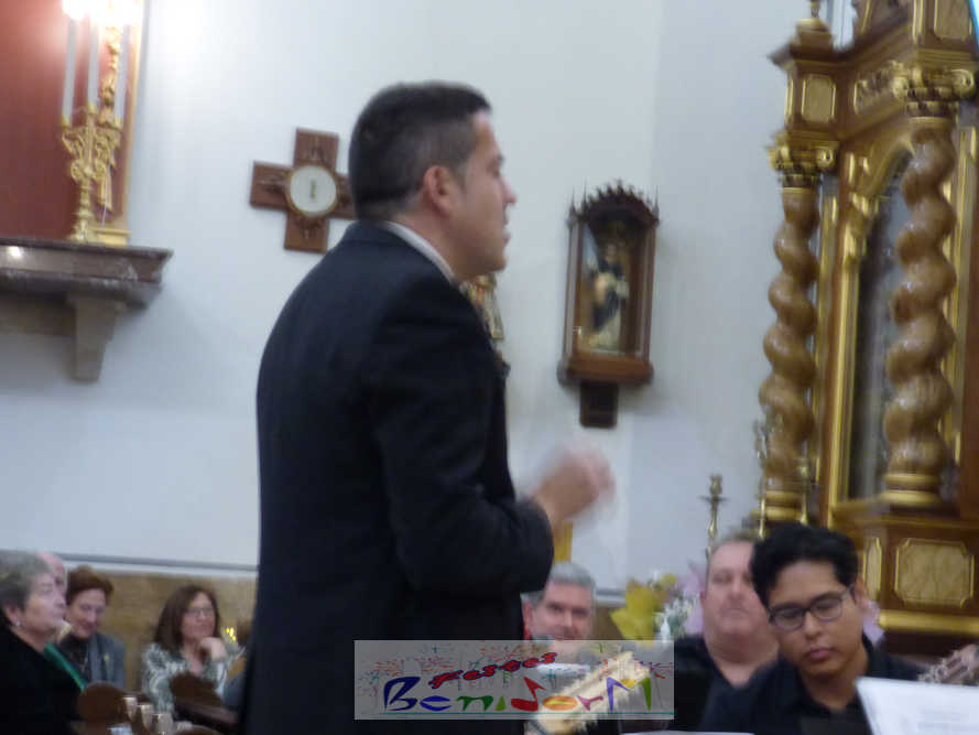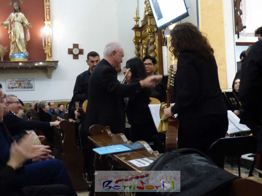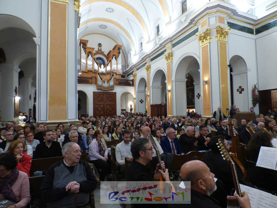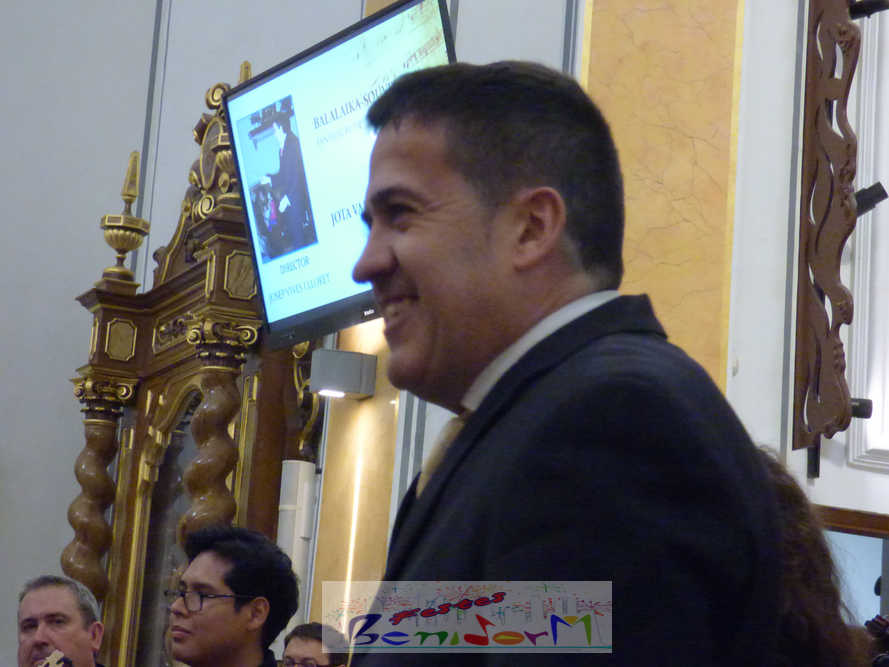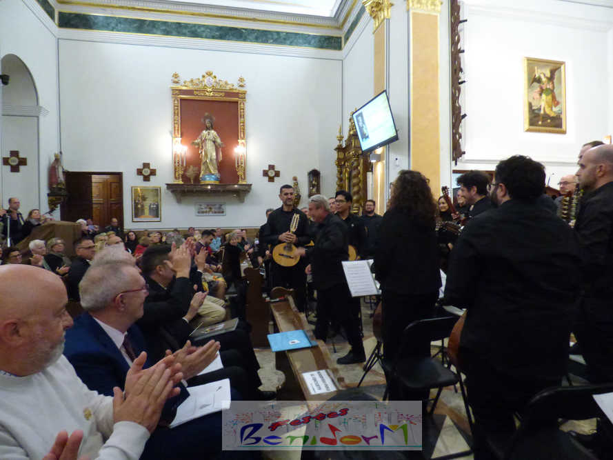 A las ocho de la tarde, el templo lleno a rebosar, ha dado la bienvenida a los integrantes de la formación musical, nombrados uno a uno desde megafonía. El alcalde de Benidorm, Toni Pérez; los concejales de Cultura y Fiestas, Jaime Jesús Pérez y Mariló Cebreros, otros miembros de la corporación municipal y el diputado autonómico, José Ramón González de Zárate, han conformado una representación institucional que, con su presencia, han mostrado su apoyo a la institución y a su presidente, Francisco Llorens, ‘Paco Rosera’, en su concierto homenaje.